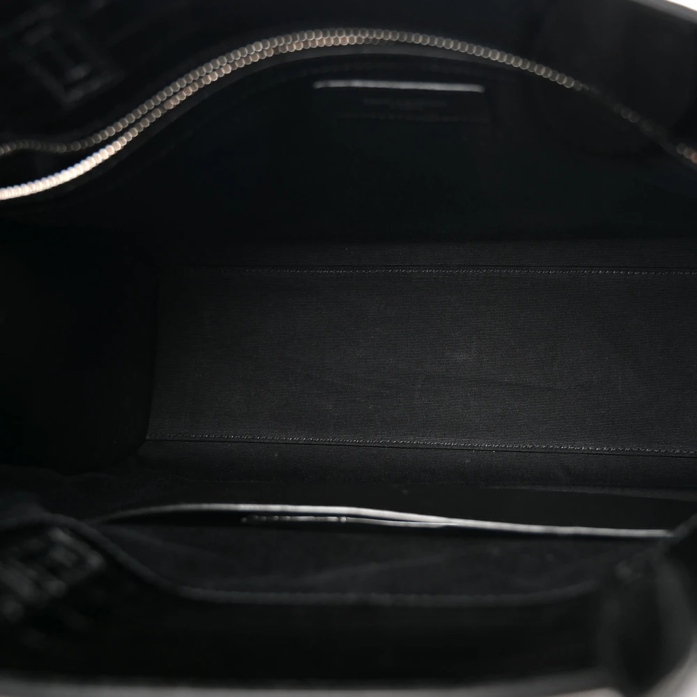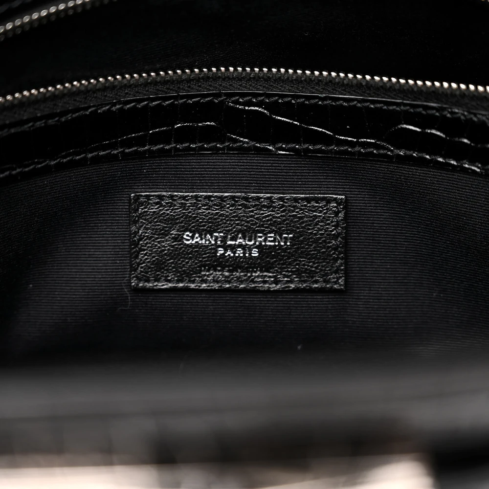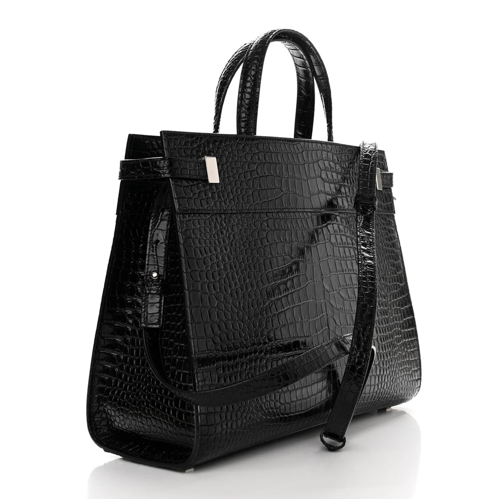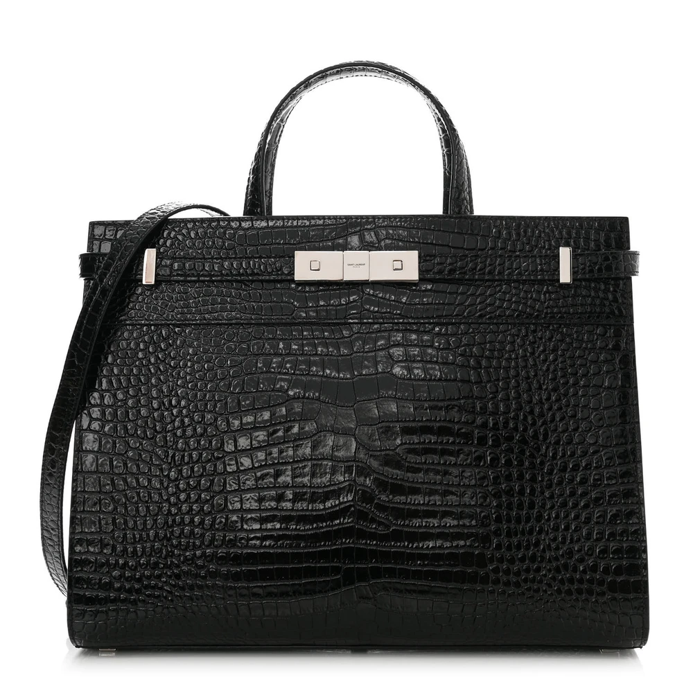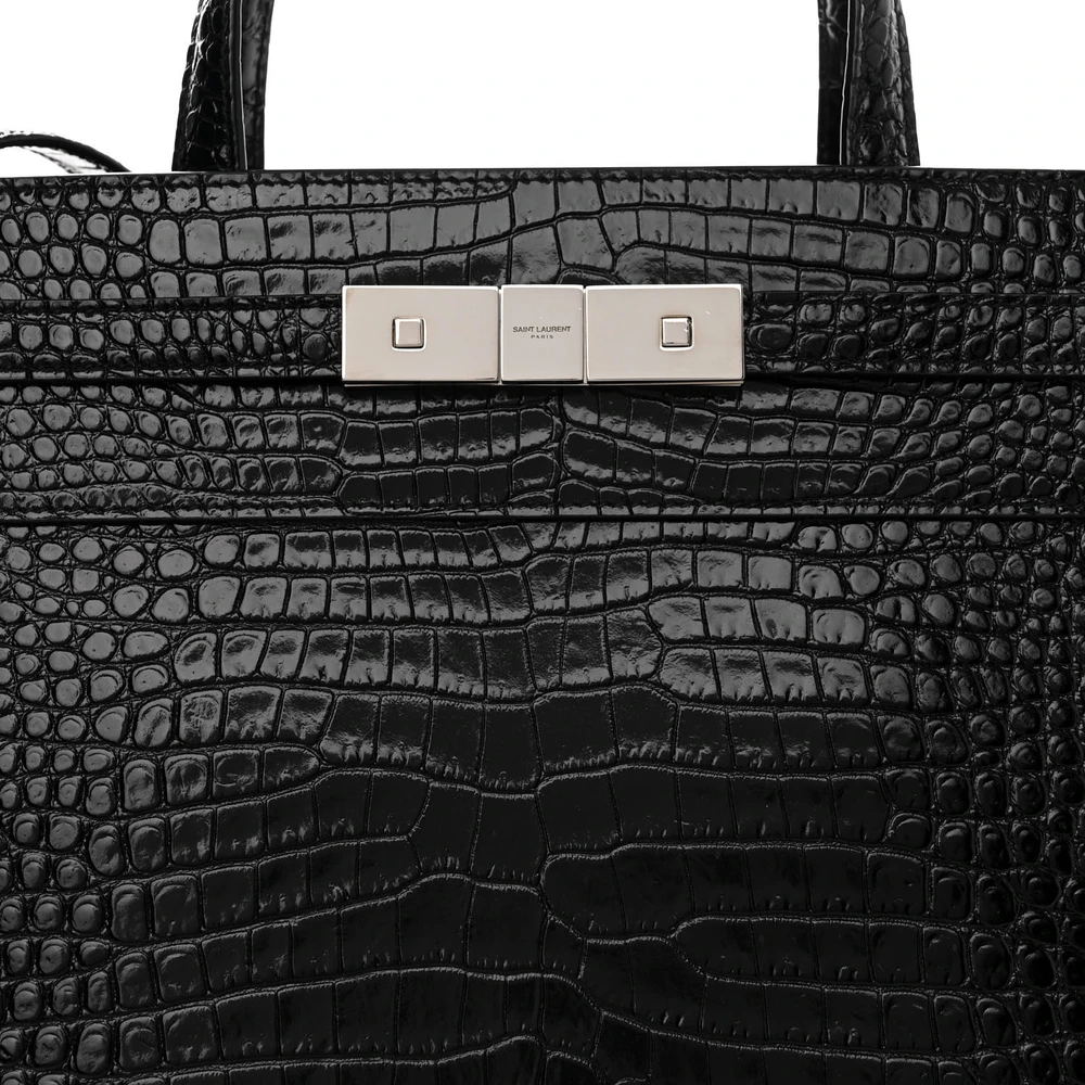 This Saint Laurent Small Manhattan Shopper Tote in Black is a refined accessory made from Embossed Crocodile and Shiny Calfskin Leather. Featuring silver hardware, it combines elegance with practicality. The spacious interior makes it perfect for daily use, while its sleek design ensures it complements any outfit effortlessly. A statement piece for sophisticated styling.