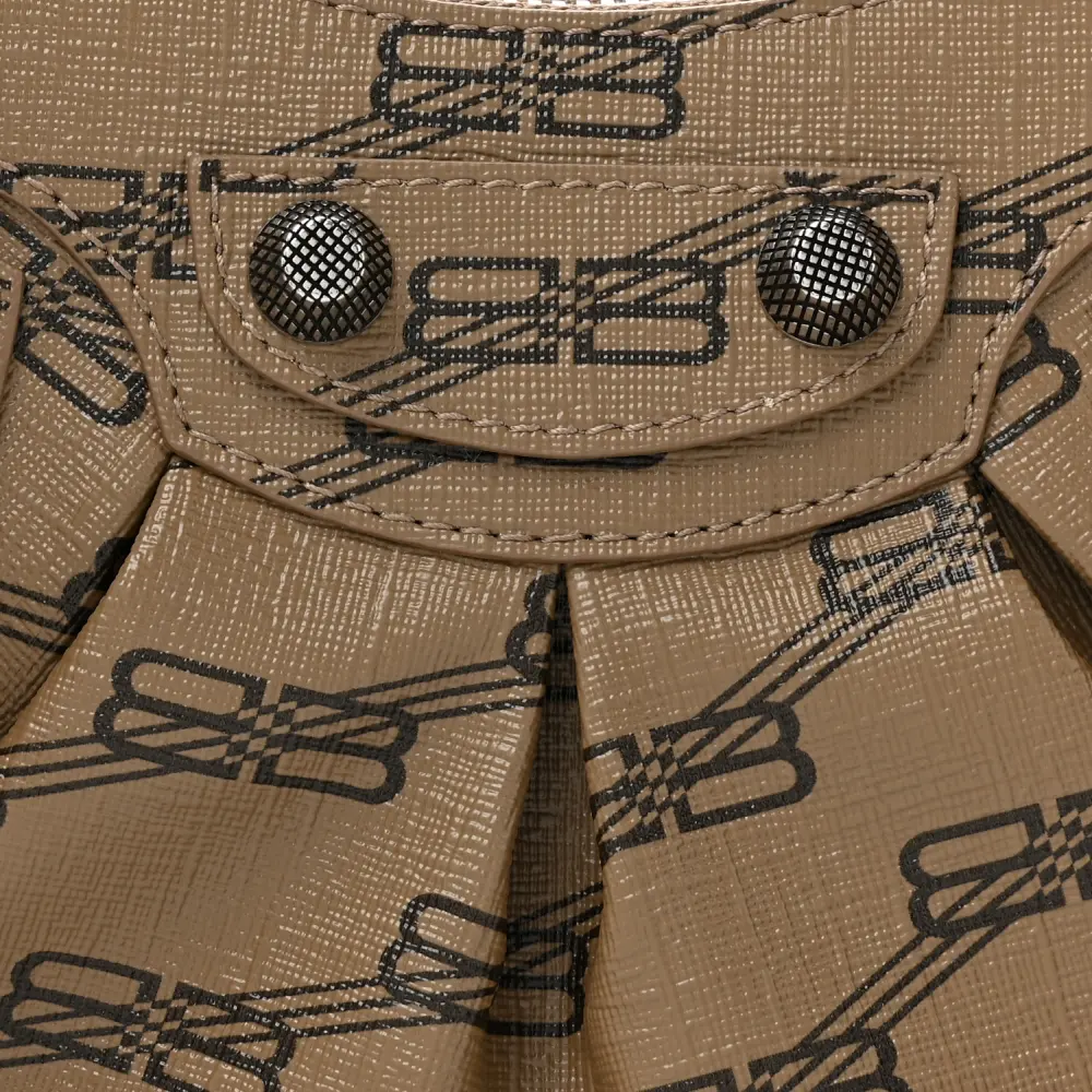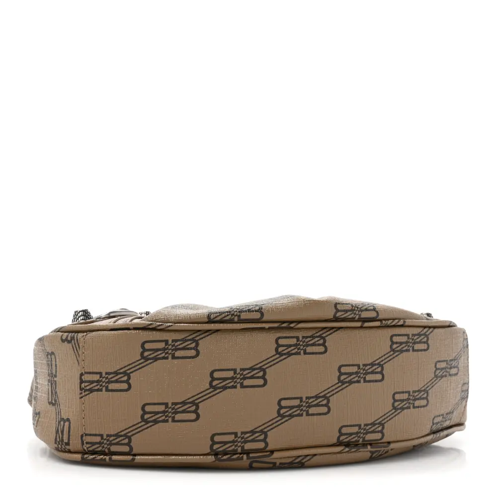 This Balenciaga XS Le Cagole Shoulder Bag in Beige/Brown is crafted from coated canvas with the BB monogram pattern for a distinctive look. Silver hardware and stud accents add an edgy touch to this modern accessory. The adjustable strap provides versatility, making it suitable for any occasion. Compact yet functional, it’s ideal for carrying essentials in style. Perfect for those who love bold and unique designs.