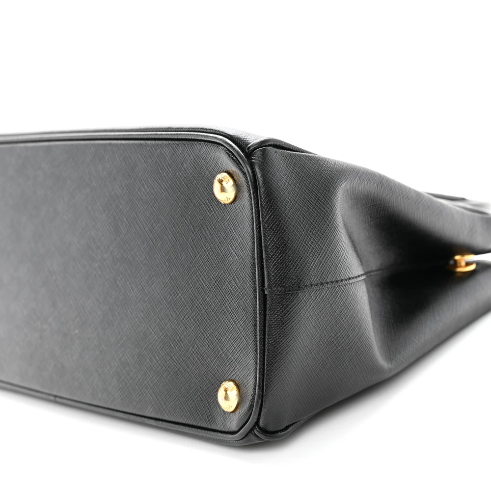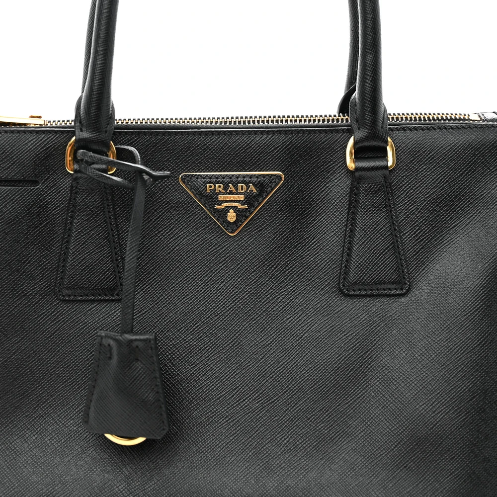 This Prada Small Galleria Double Zip Tote in Black is crafted from Saffiano leather. Brass hardware adds a classic finish. Spacious compartments ensure organized storage. Comfortable handles make it perfect for daily use. A timeless and elegant choice for all settings.
