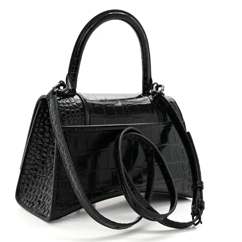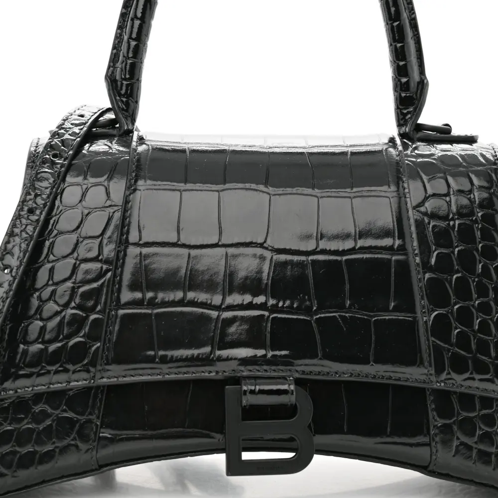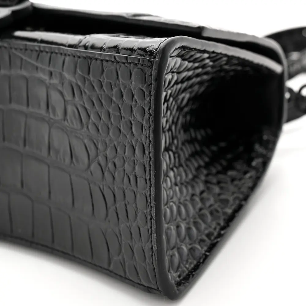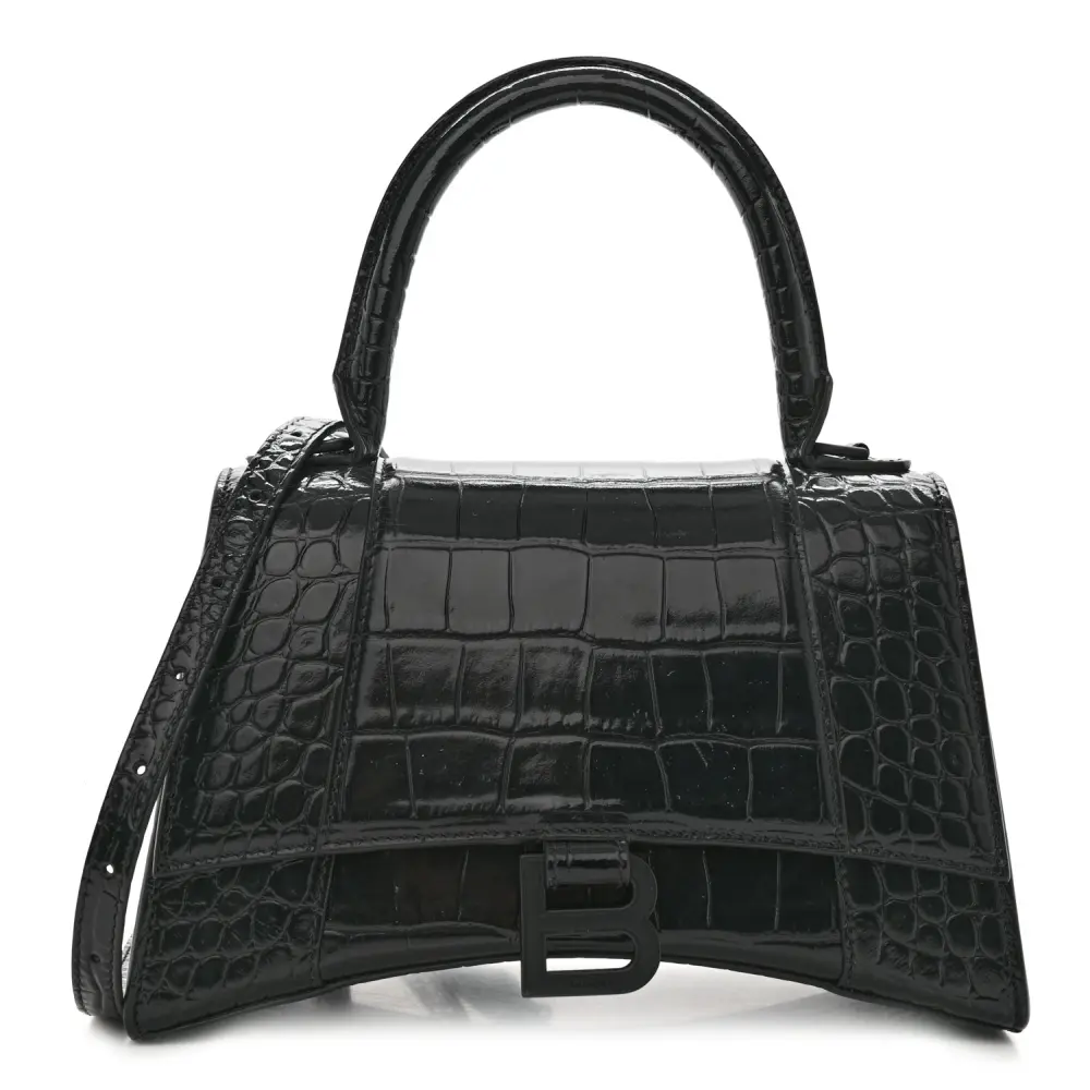 This Balenciaga Small Hourglass Top Handle Bag in Black features monochrome crocodile-embossed shiny calfskin leather with black hardware. Its iconic curved silhouette and compact size make it a statement piece for any occasion. The top handle and adjustable strap provide versatile carrying options. Perfect for those seeking a modern, luxurious accessory, this bag highlights Balenciaga’s commitment to bold and innovative design.