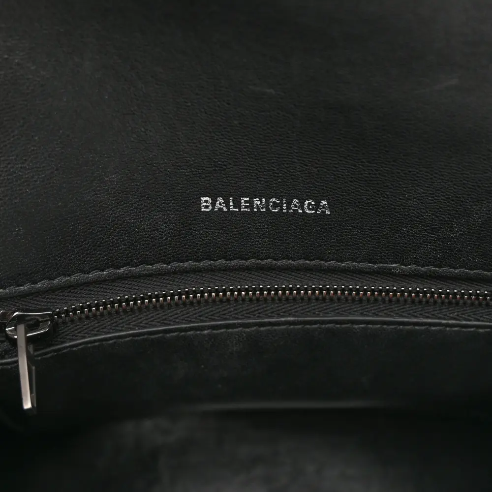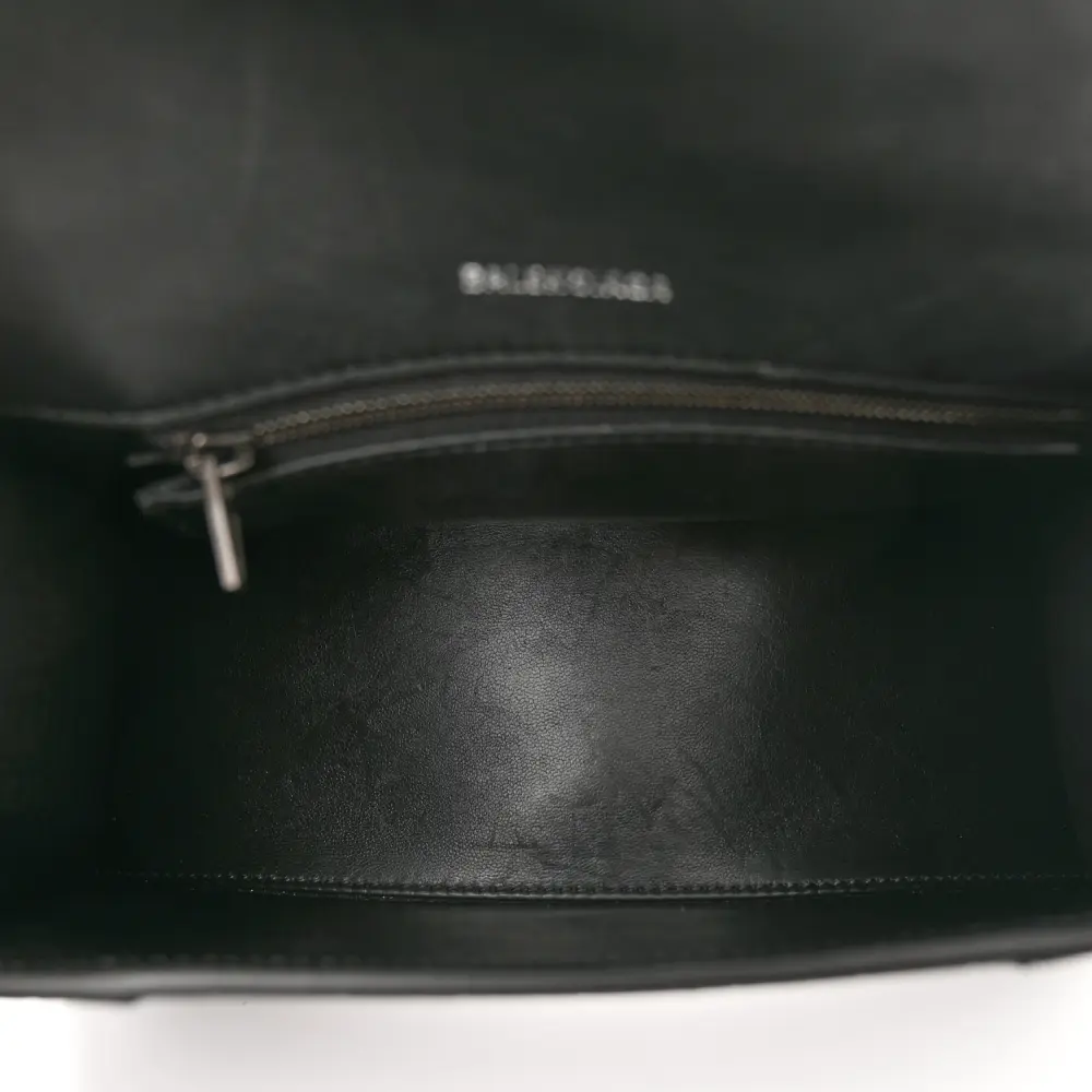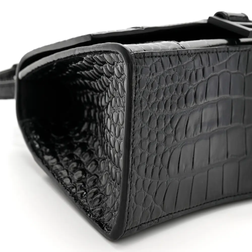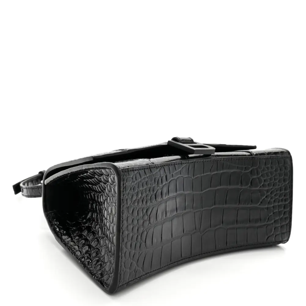 This Balenciaga Small Hourglass Top Handle Bag in Black features monochrome crocodile-embossed shiny calfskin leather with black hardware. Its iconic curved silhouette and compact size make it a statement piece for any occasion. The top handle and adjustable strap provide versatile carrying options. Perfect for those seeking a modern, luxurious accessory, this bag highlights Balenciaga’s commitment to bold and innovative design.