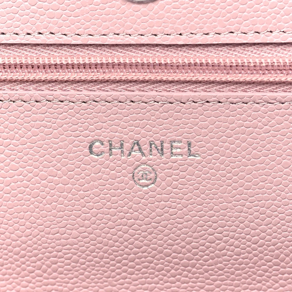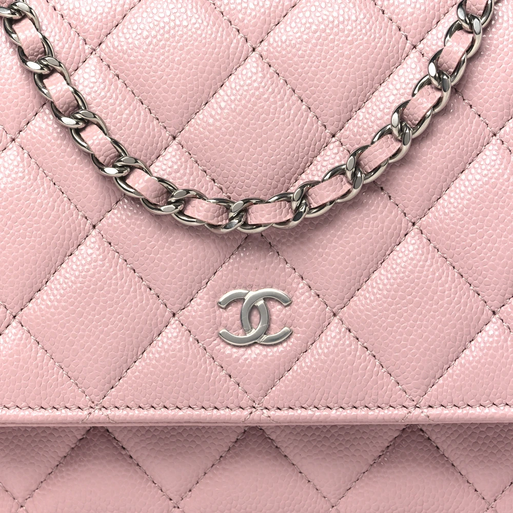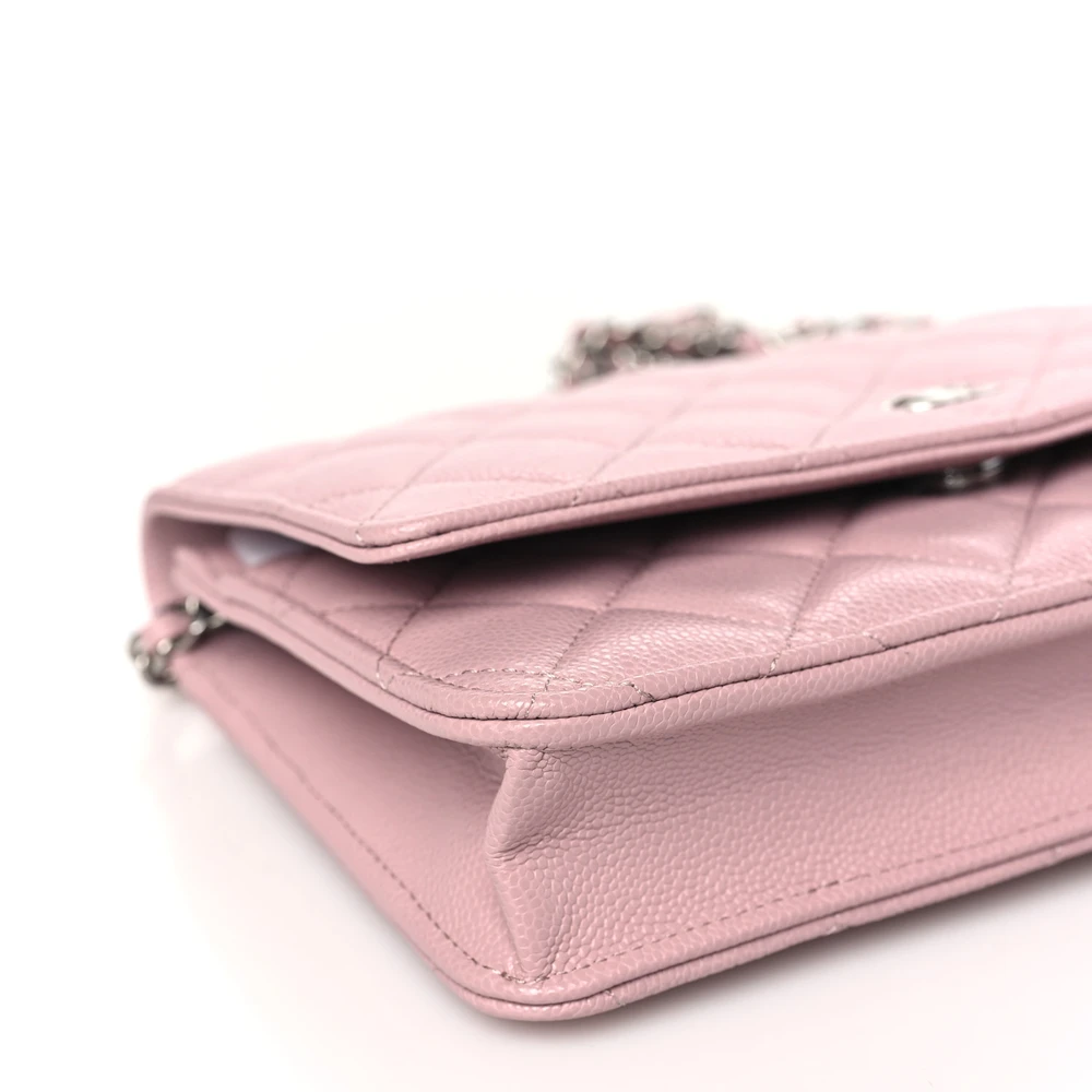 This Chanel Wallet On Chain (WOC) Small in Light Pink Quilted Caviar Leather with Silver Hardware is a delicate and stylish accessory. The soft pink hue is complemented by Chanel’s durable quilted caviar leather. Silver hardware adds a sleek and modern contrast to its feminine design. Compact and functional, it offers organized compartments for essentials. The chain strap provides versatile carrying options. A chic piece for day or evening wear.