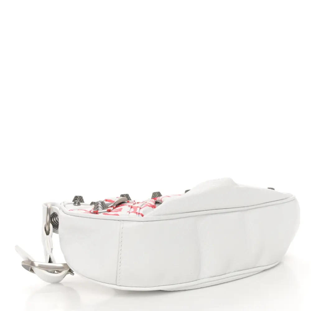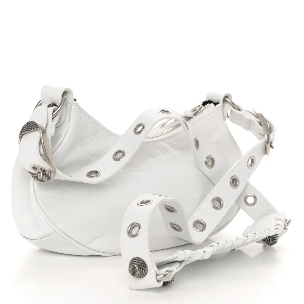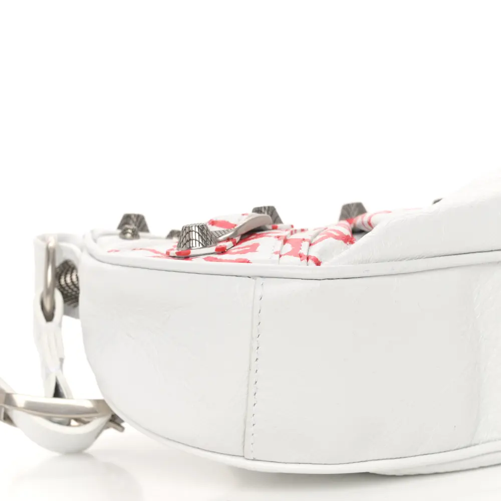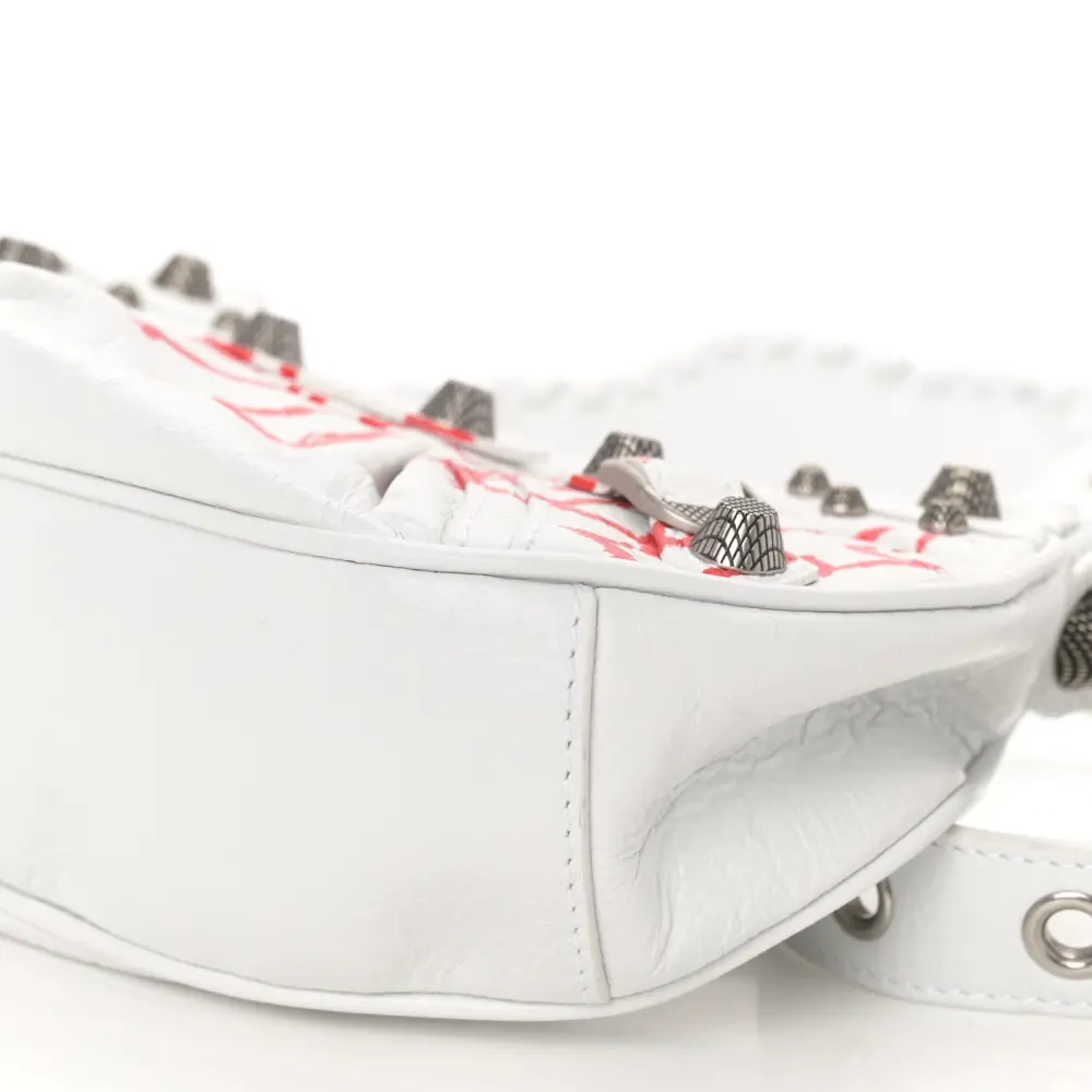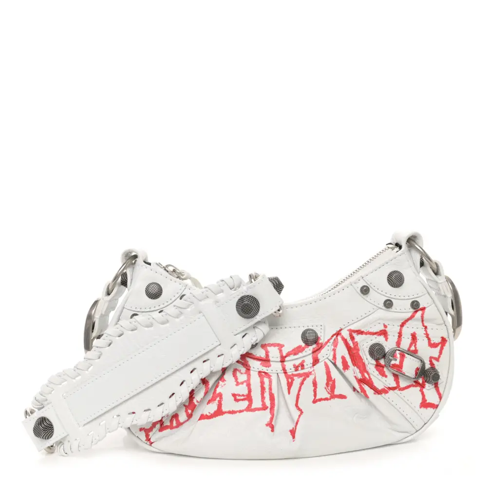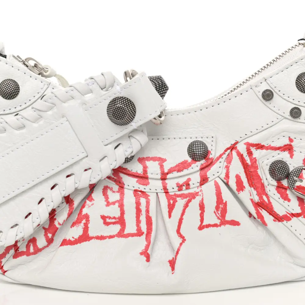 This Balenciaga XS Lunar New Year Graffiti Logo Le Cagole Shoulder Bag in Optic White showcases Agneau Arena leather with bold graffiti prints and silver hardware. Its edgy design is enhanced by zip and buckle details, making it a statement accessory. The compact size is perfect for essentials, while the detachable strap adds versatility. Ideal for day-to-night transitions, this bag celebrates creativity and craftsmanship. A must-have for fashion-forward individuals, it combines utility with a bold aesthetic. Perfect for those who love standout accessories.