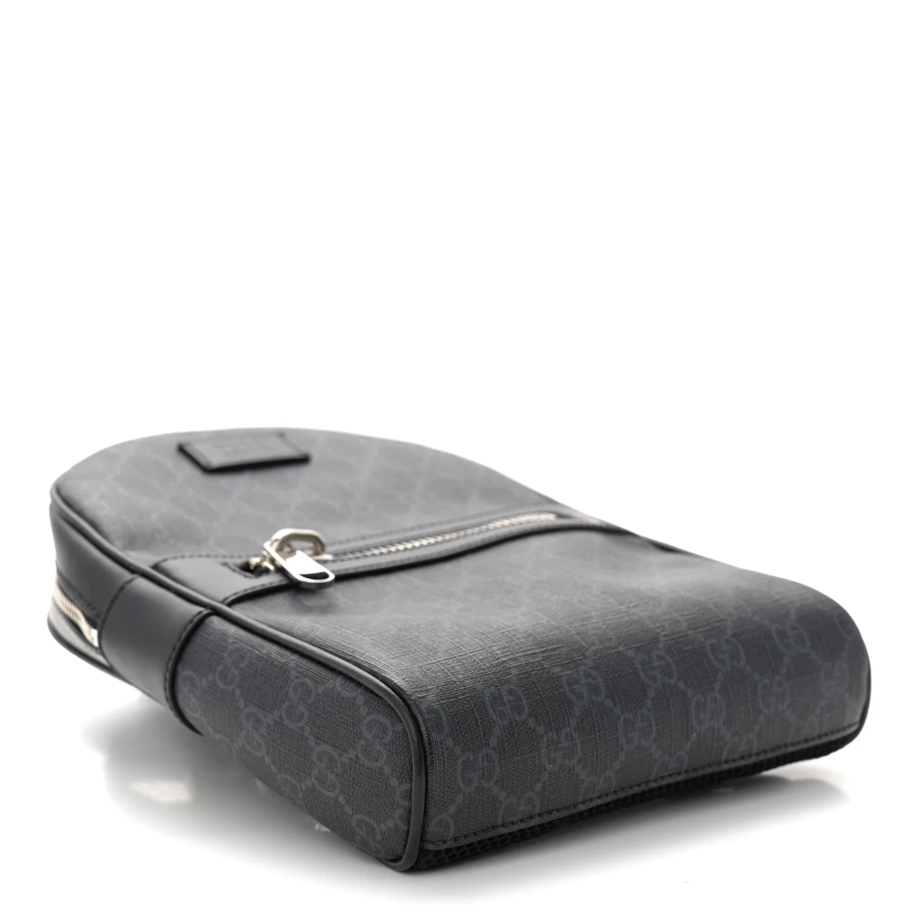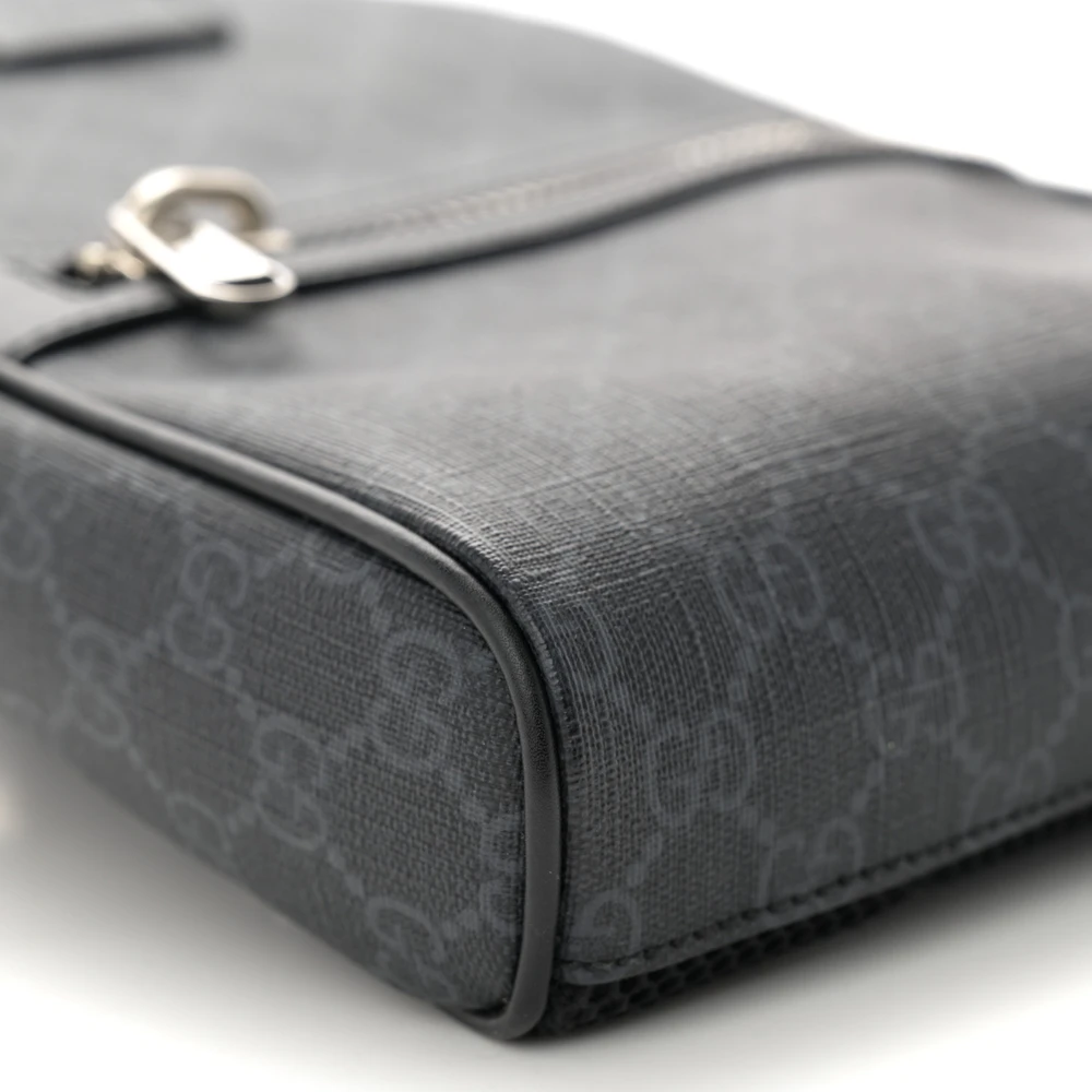 This Gucci Medium Sling Backpack combines black and grey GG Supreme monogram canvas. Calfskin leather accents add durability and elegance. Silver hardware enhances its modern appeal. Spacious compartments offer functionality for daily use. Adjustable strap ensures a comfortable fit. A stylish and practical choice for urban lifestyles.