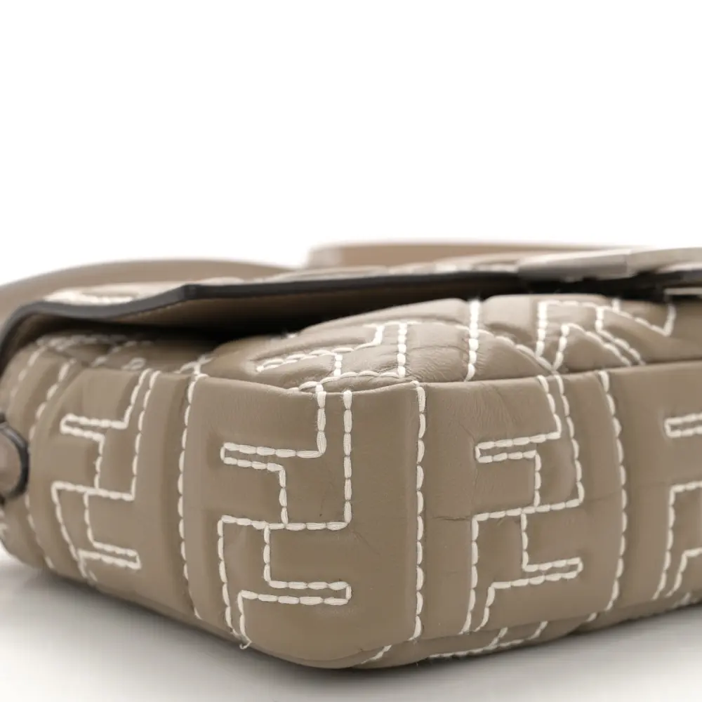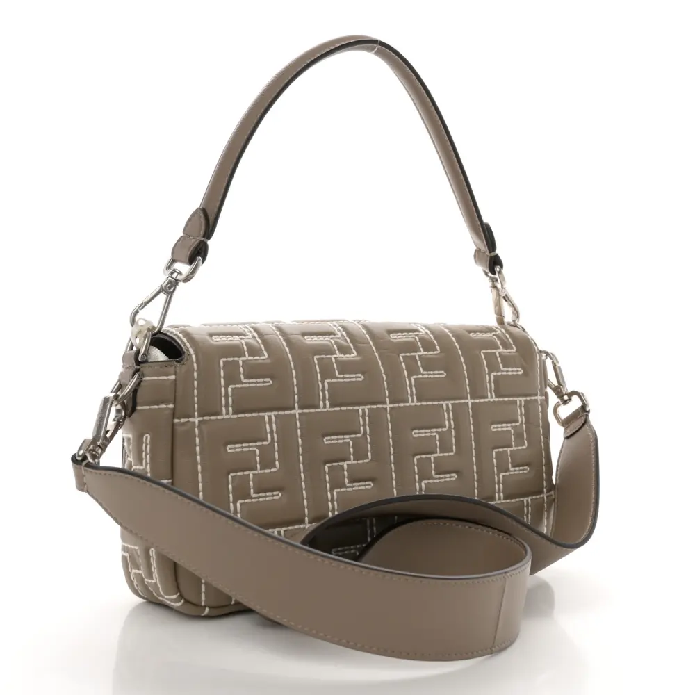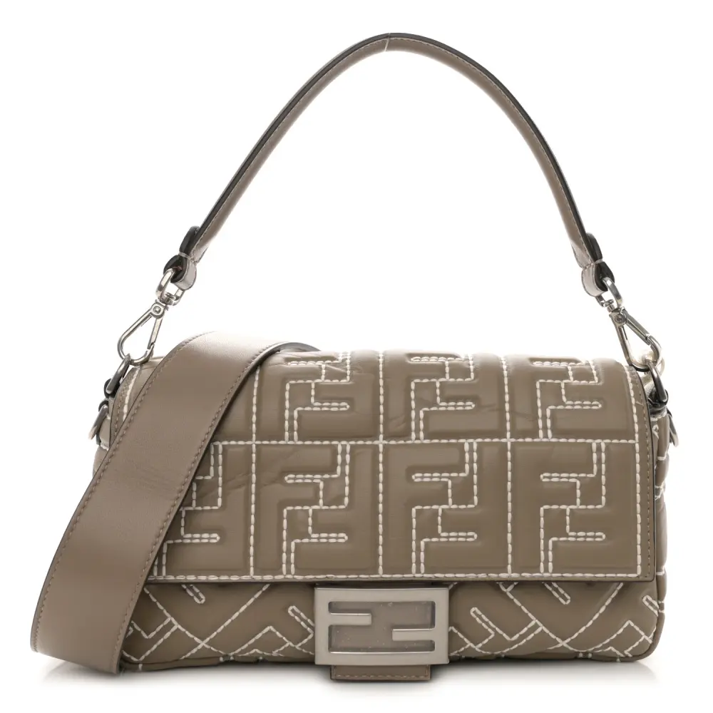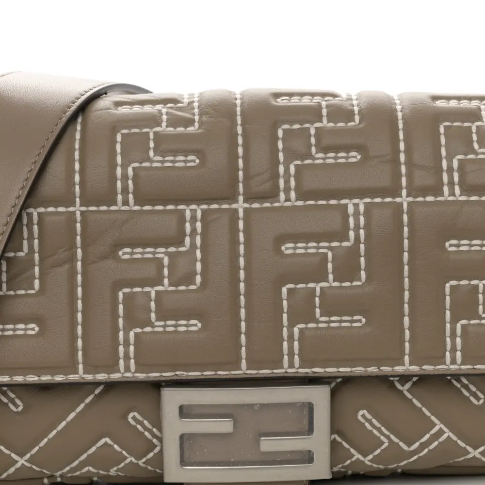 This Fendi FF 1974 Embossed Stitched Baguette in Tortora Nappa Leather is timelessly elegant. Silver hardware highlights its sophisticated texture and design. Compact yet functional, it’s perfect for essentials. The iconic silhouette ensures effortless versatility. Its neutral tone complements any outfit beautifully. A luxurious choice for every occasion.