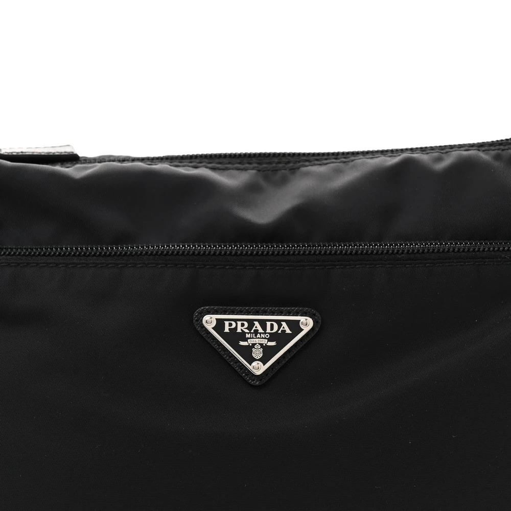 This Prada Medium Pocket Double Zip Messenger Bag in Black combines Re-Nylon Vela and Saffiano leather. Silver hardware adds a polished look. Multiple compartments ensure organized storage. Adjustable strap offers versatile carrying options. Perfect for work or casual outings. A sleek and functional choice.