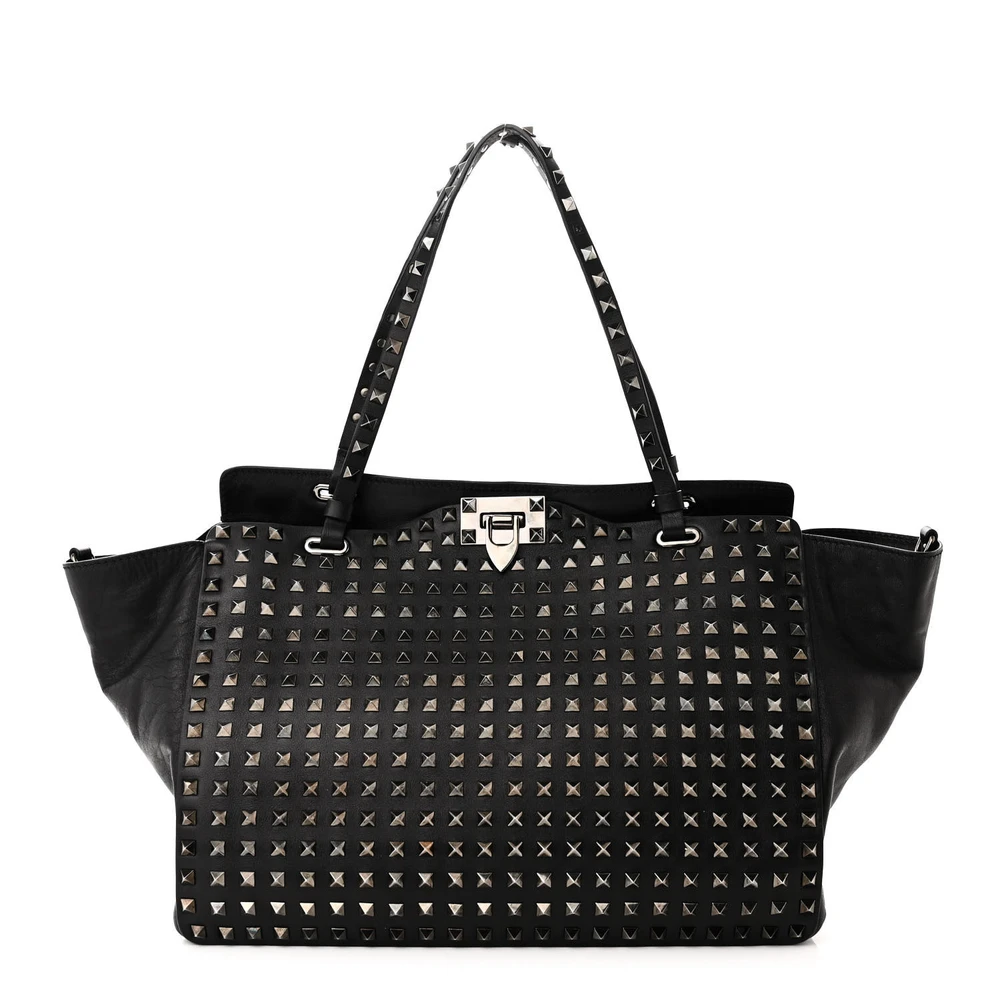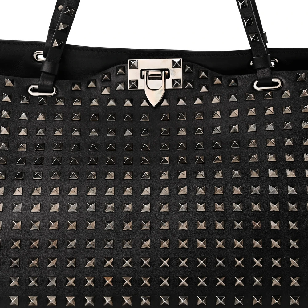 This Valentino Garavani Medium Rockstud All Over Tote in Black is bold and spacious. Crafted from Vitello leather with silver hardware. Features an all-over Rockstud design for a statement look. Roomy enough for daily essentials or work items. Perfect for elevating casual outfits. A durable yet stylish accessory.