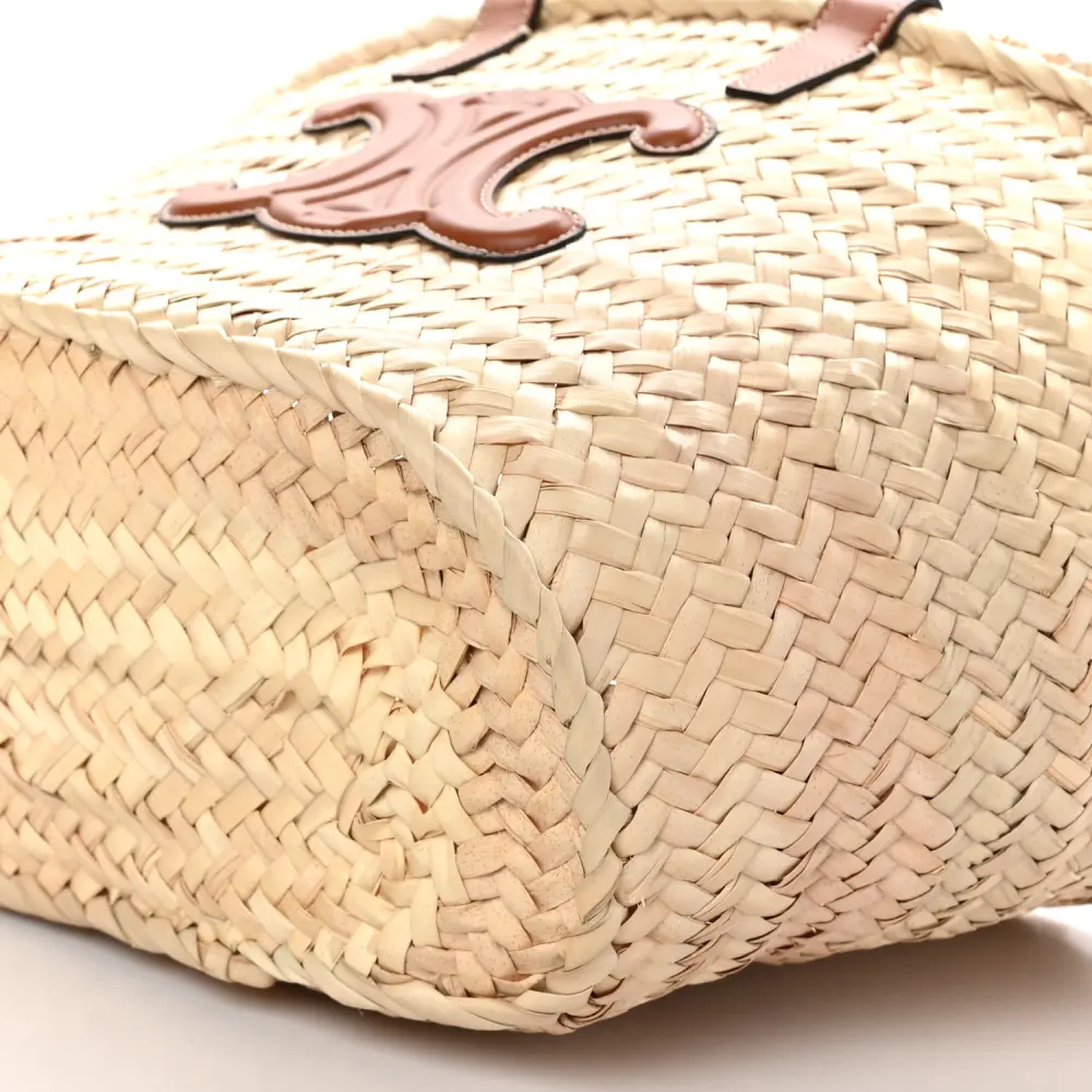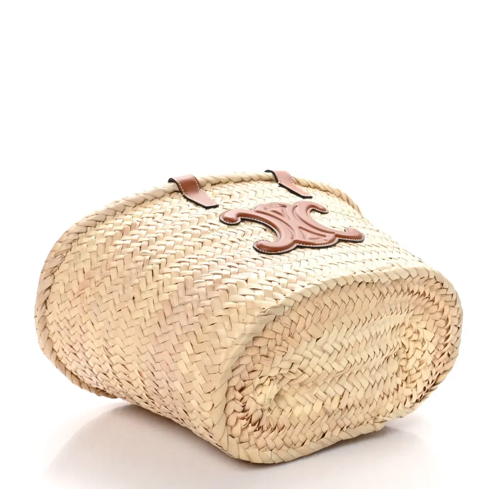 This Celine Medium Triomphe Teen Panier in Tan combines palm leaf and calfskin leather with gold hardware. Its spacious design is perfect for everyday use. The top handles and detachable strap offer versatile carry options. Elegant yet practical, it complements various outfits effortlessly. A sophisticated bag for any occasion.