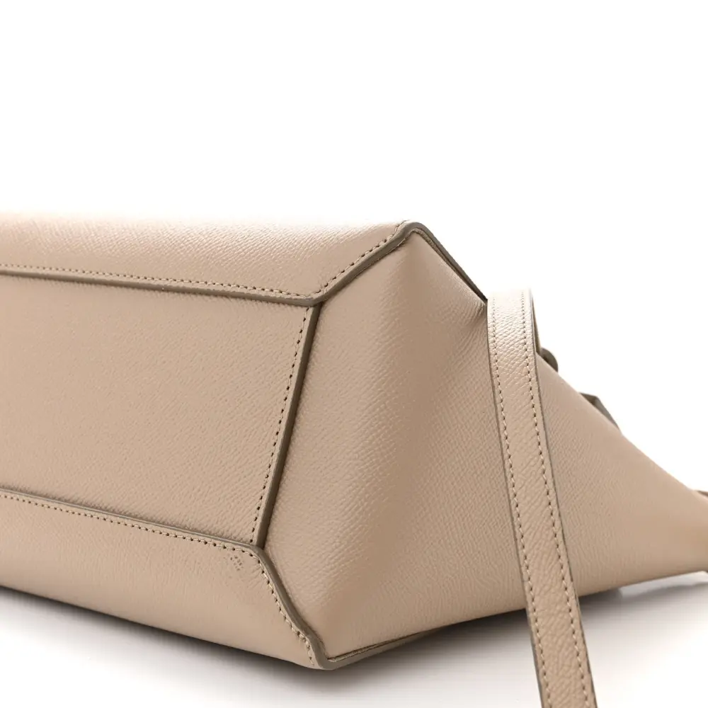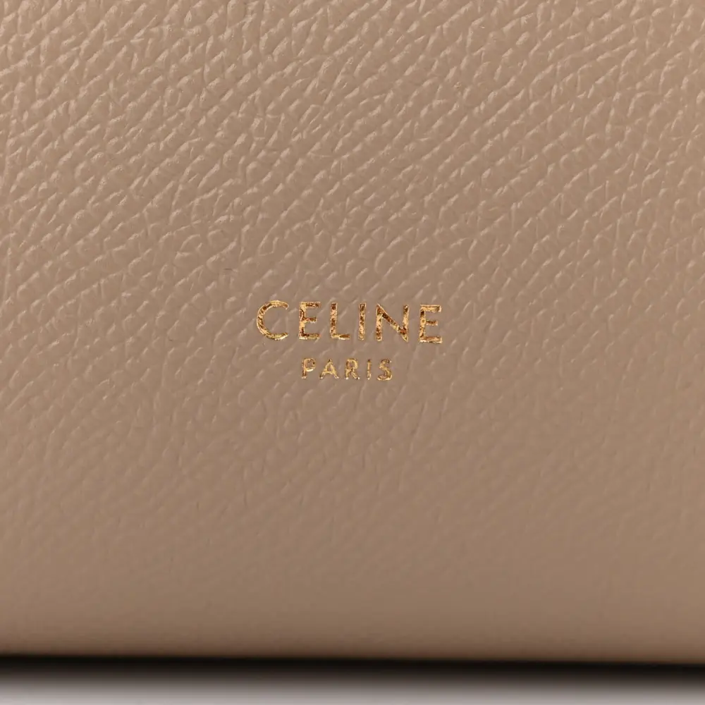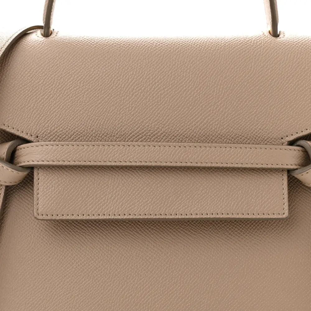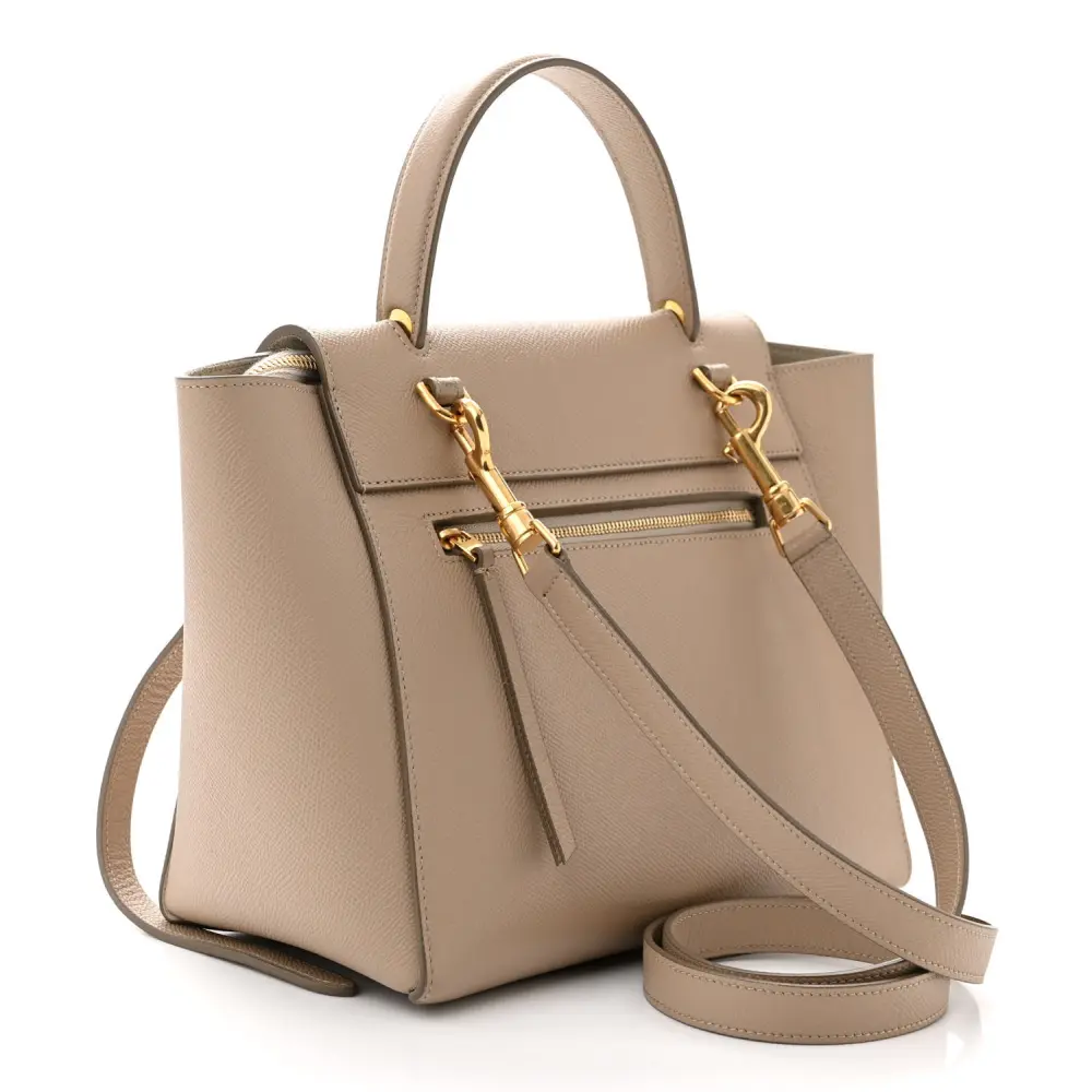 This Celine Micro Belt Bag in Light Taupe is crafted from grained calfskin leather with gold hardware. Its structured design includes a top handle and flap closure. Spacious and practical, it’s perfect for daily use. The adjustable strap adds crossbody versatility. A sleek and timeless addition to any collection.