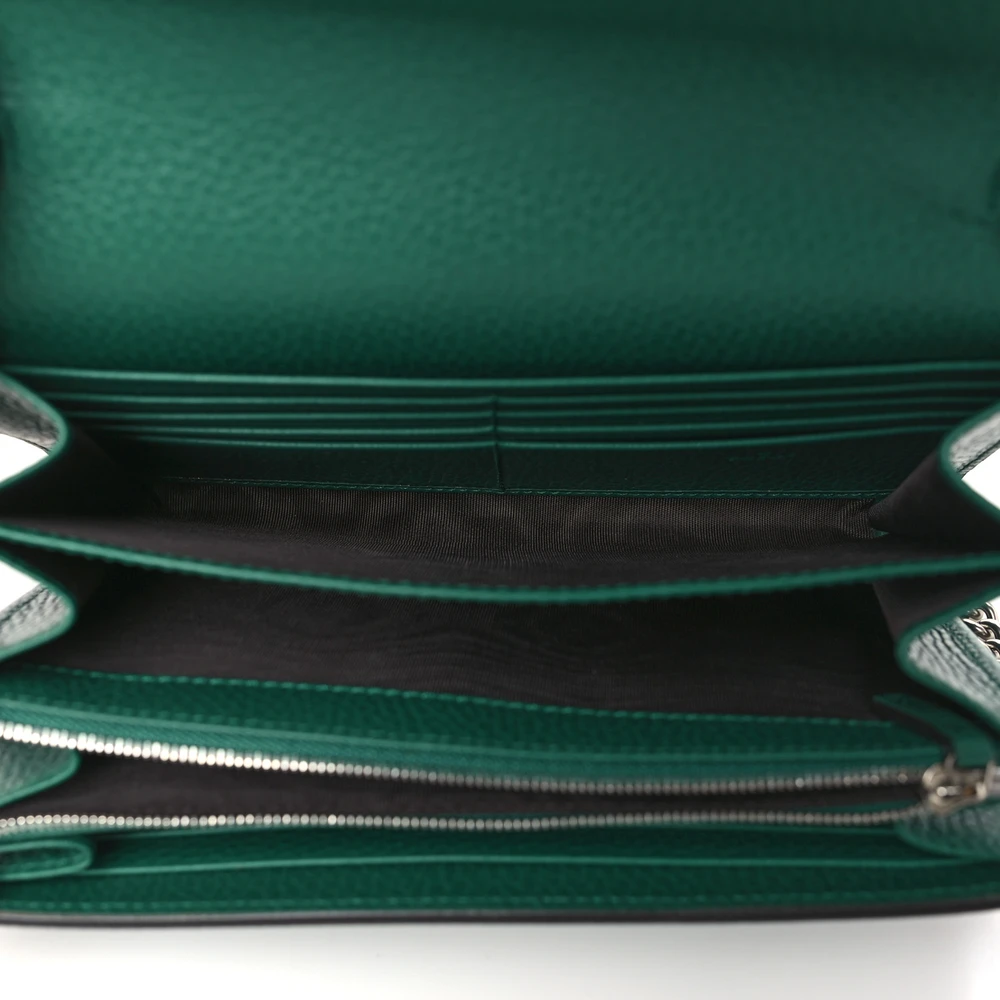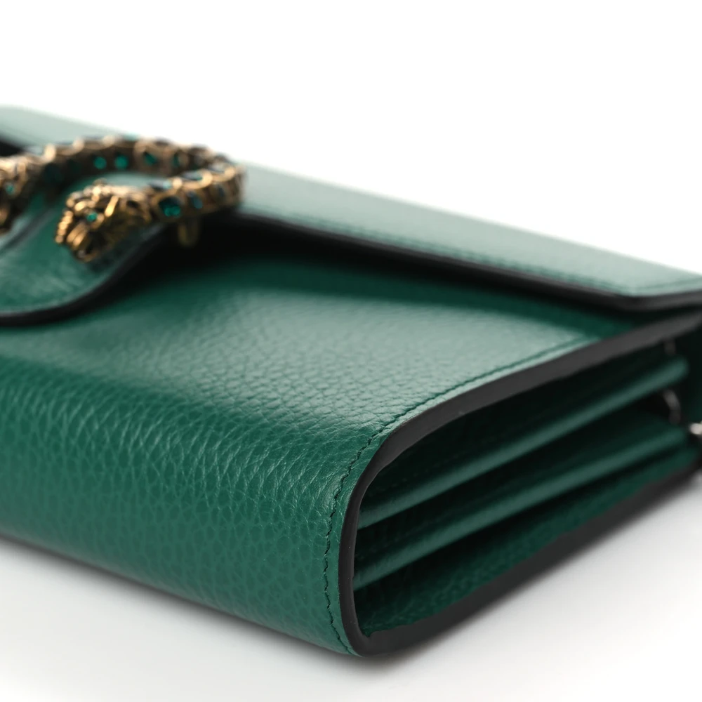 This Gucci Mini Dionysus Chain Wallet is crafted from emerald calfskin leather. Aged silver hardware adds vintage elegance. Compact design features a chain strap for versatility. Signature Dionysus closure enhances its iconic style. Ideal for carrying cards and small essentials. A luxurious wallet that doubles as a chic accessory.