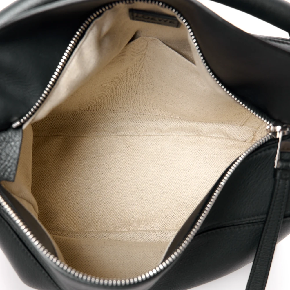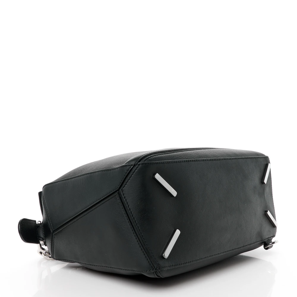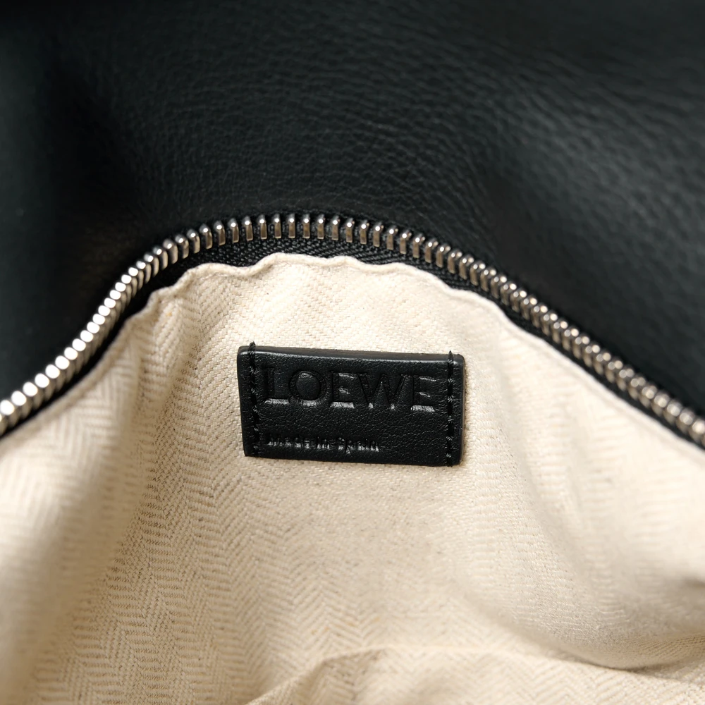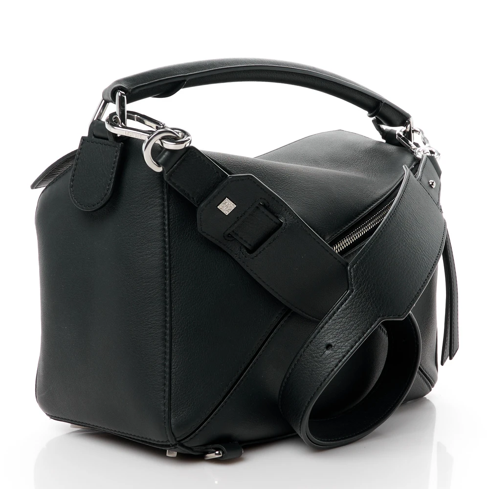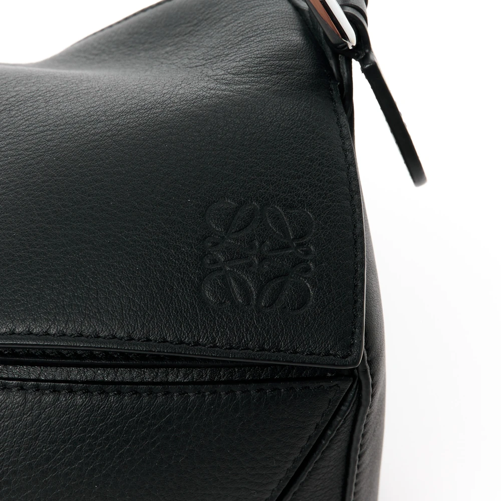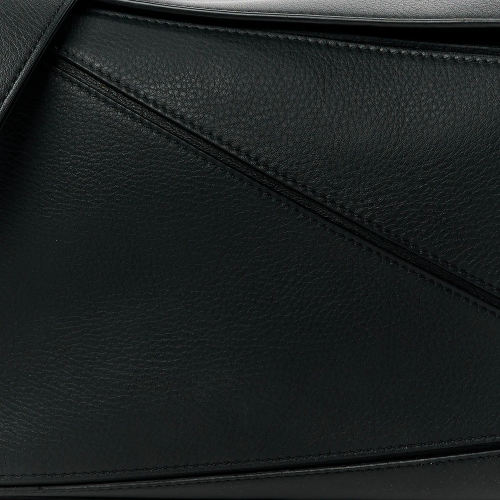 This Loewe Puzzle Bag Medium in Black exudes sleek sophistication in premium calfskin leather. Designed with the iconic geometric panels, it combines practicality with style. Spacious interior makes it suitable for daily essentials. The black hue offers timeless versatility. Adjustable strap ensures multiple carrying options. A chic and functional bag for every occasion.