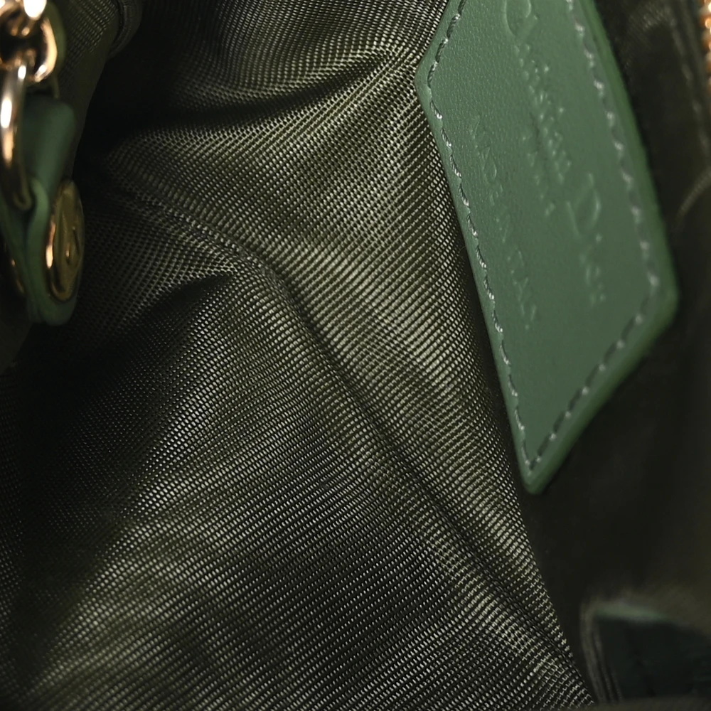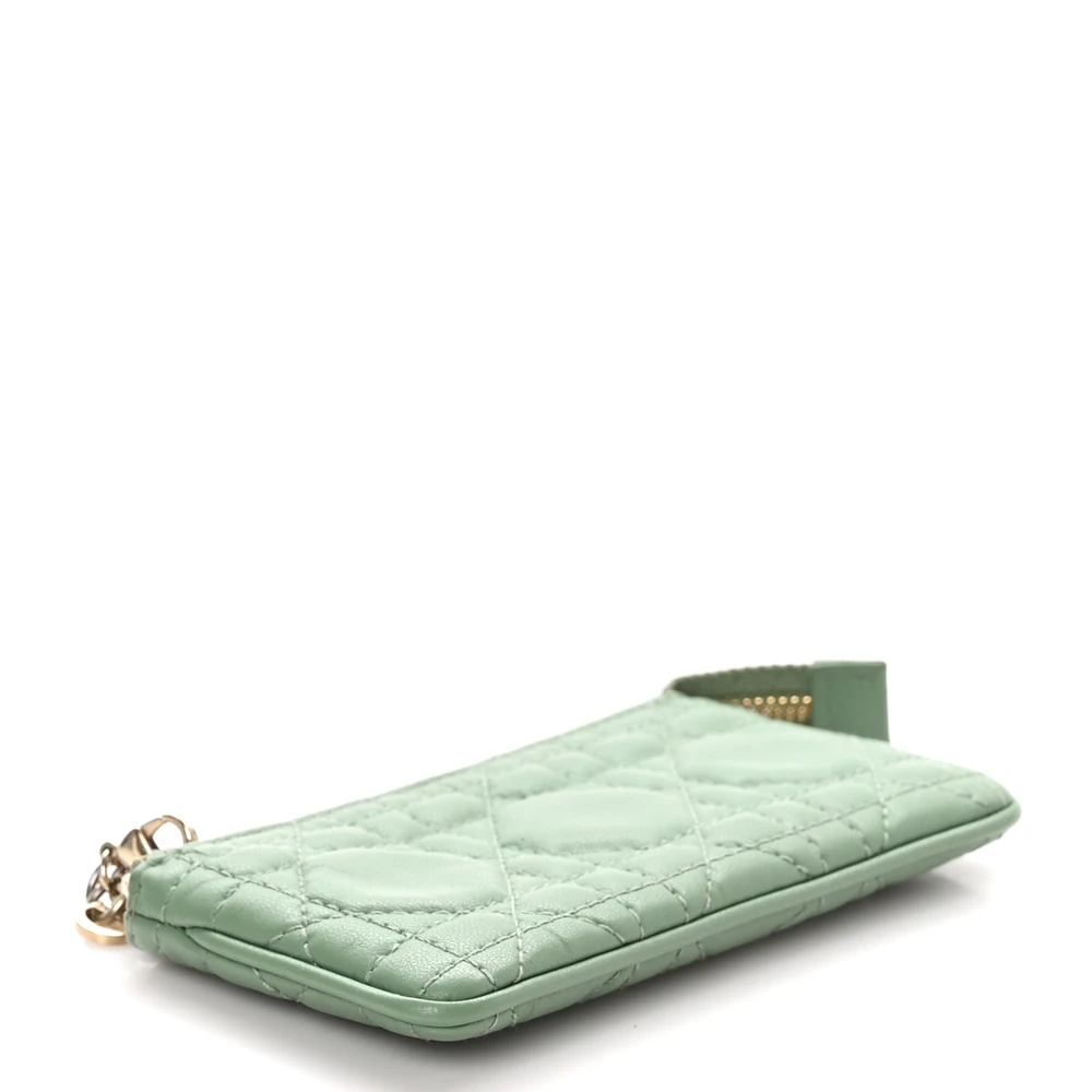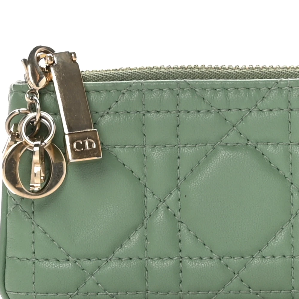 This Dior Small Lady Dior Zipped Key Case in Green Cannage Lambskin Leather is a chic and functional accessory. The gold hardware enhances its luxurious appeal. Perfect for keeping essentials organized in style. A compact yet elegant piece for Dior enthusiasts.