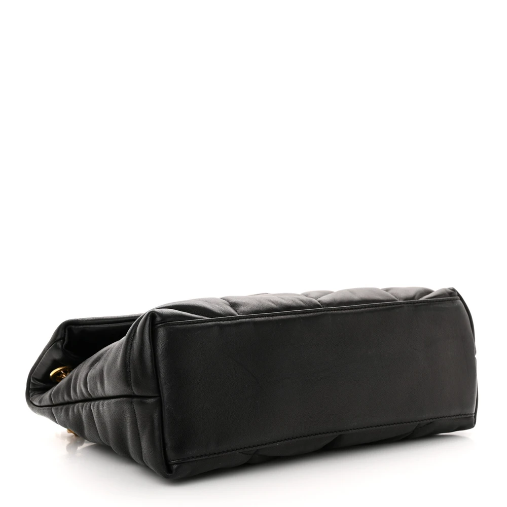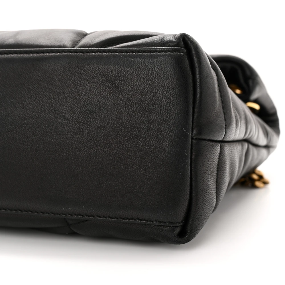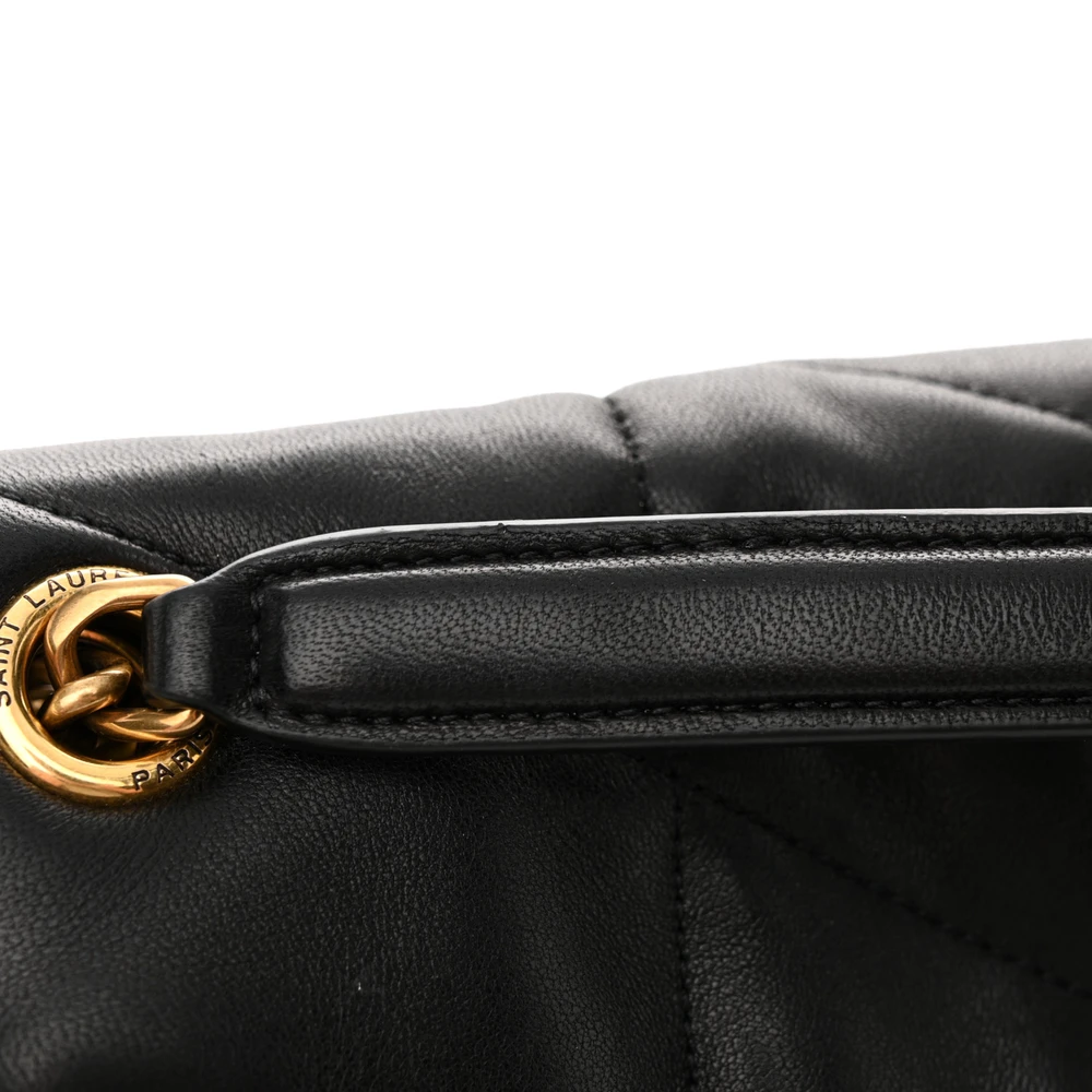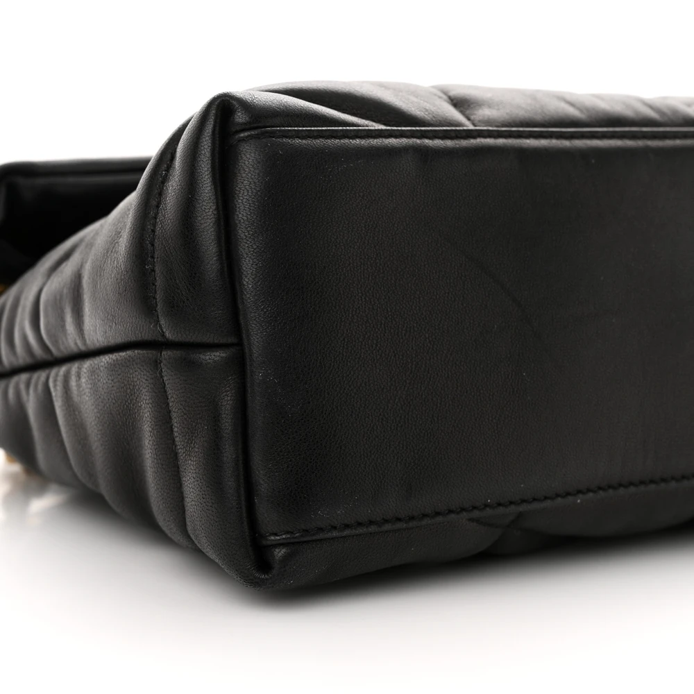 This Small Loulou Chain Satchel in Black Quilted Puffer Monogram Lambskin Leather showcases gold hardware for a classic look. The compact design includes a secure magnetic closure and a functional interior. Its chain strap offers versatile styling options, transitioning easily from day to night. The soft lambskin texture and iconic YSL logo add a touch of sophistication. A timeless piece for any fashion enthusiast.