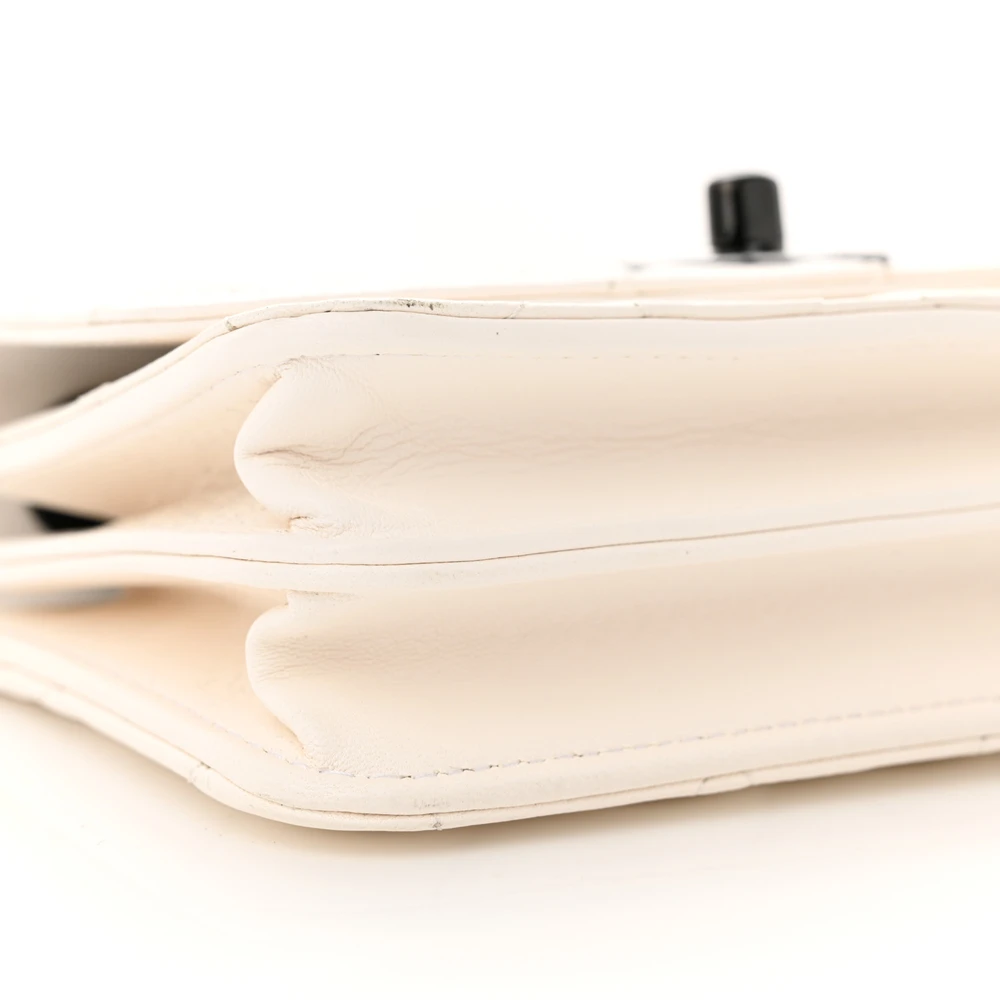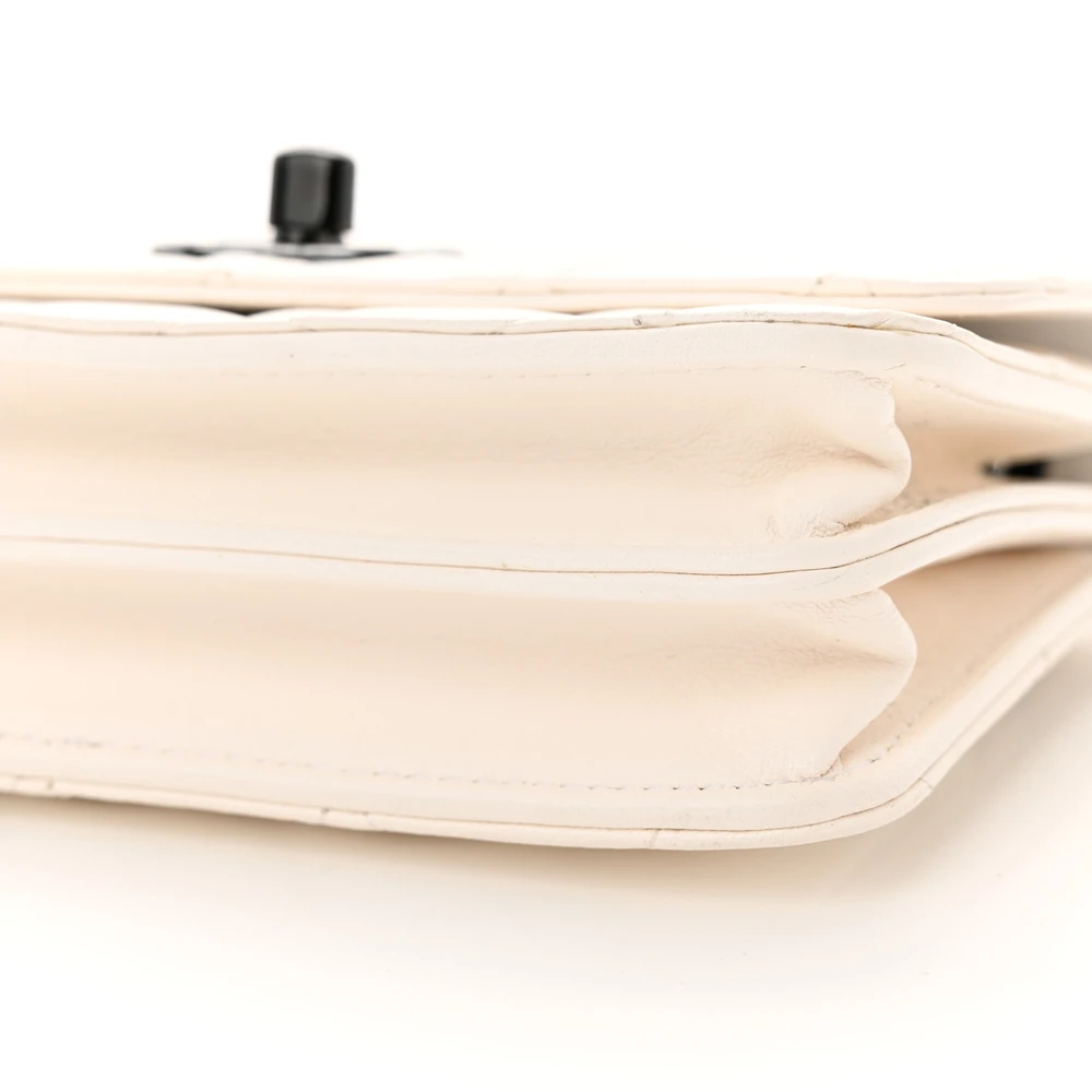 This Chanel Trendy CC Wallet On Chain (WOC) Mini in White Quilted Lambskin Leather features black hardware. The compact and sleek design makes it perfect for carrying essentials. The soft lambskin leather provides a polished and luxurious feel. Ideal for transitioning from day to night. A stylish and practical piece for modern fashionistas. A classic Chanel accessory with a trendy twist.