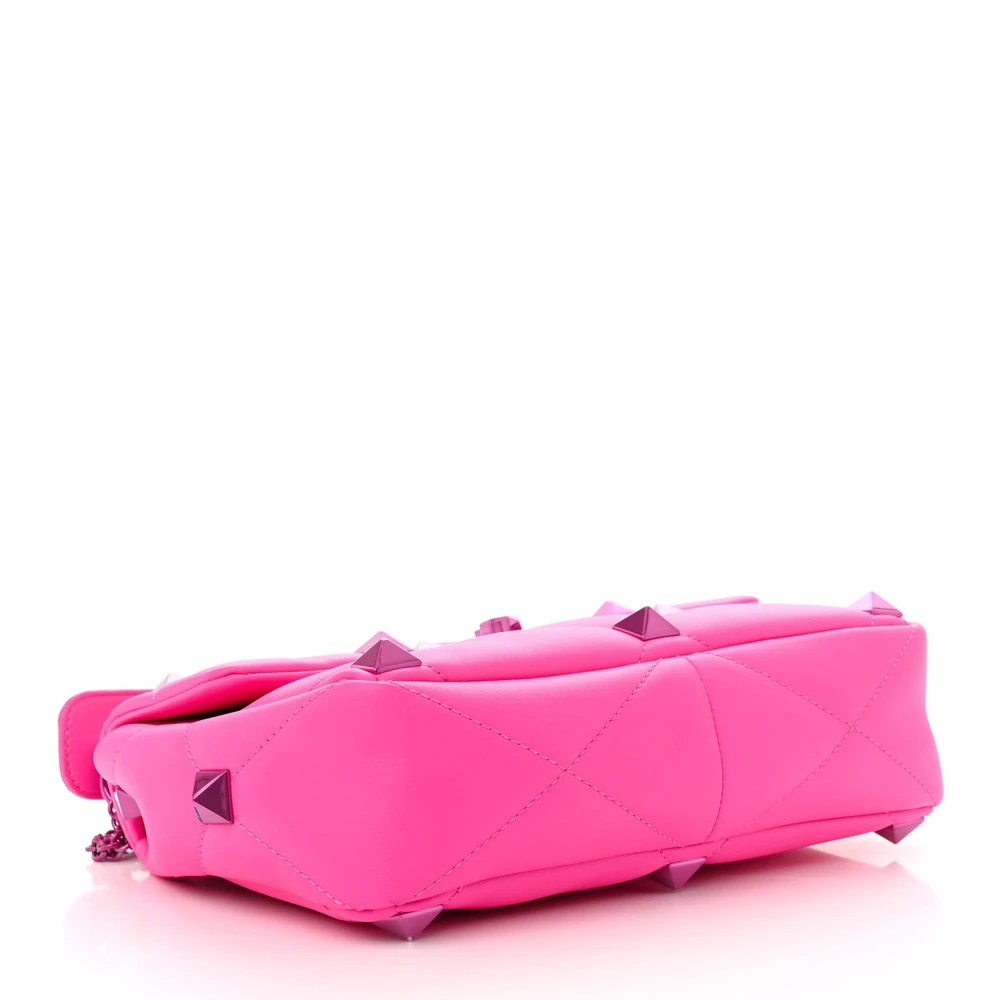 This Valentino Garavani Large Roman Stud Shoulder Bag in Pink PP is modern and iconic. Lacquer monochrome nappa leather with incognito hardware creates a chic look. Spacious for essentials while offering a bold statement. Perfect for any occasion.