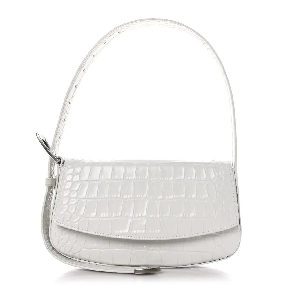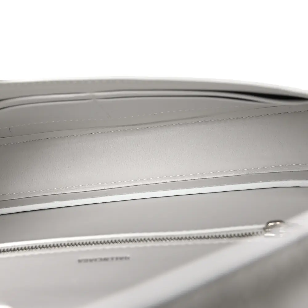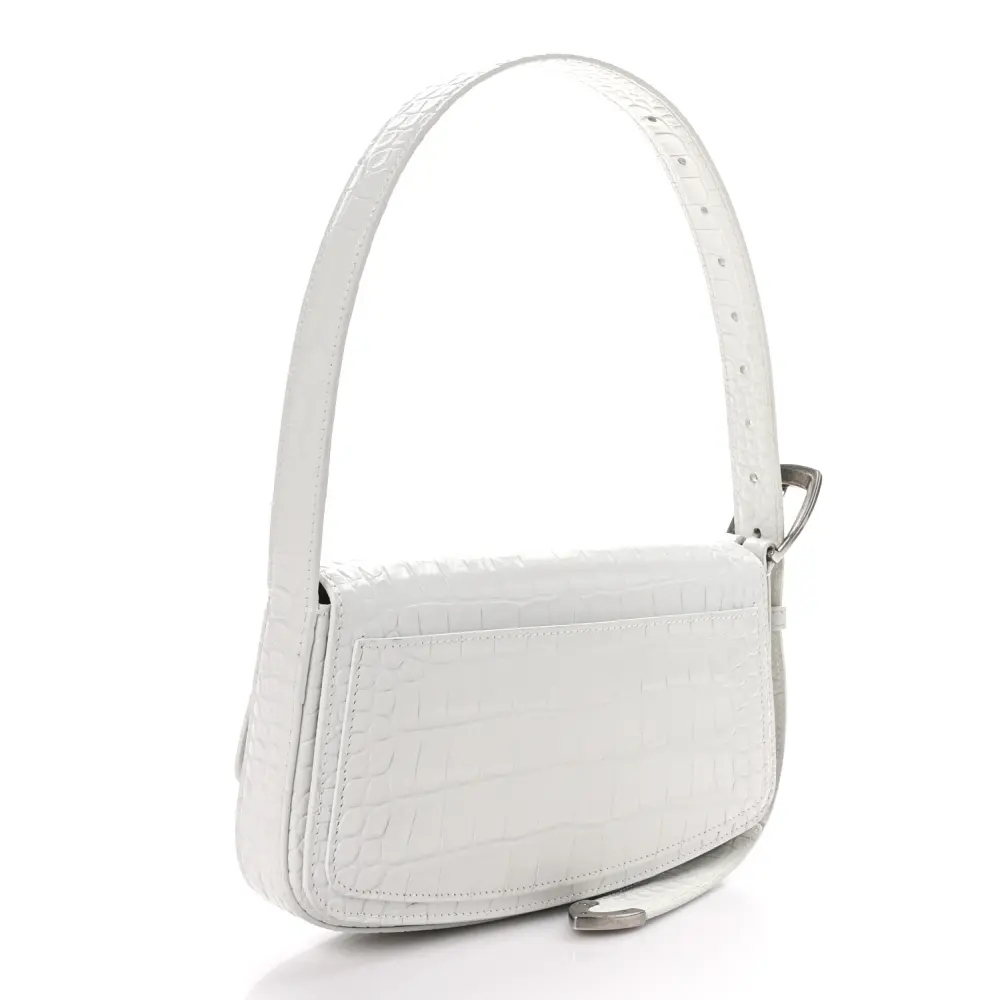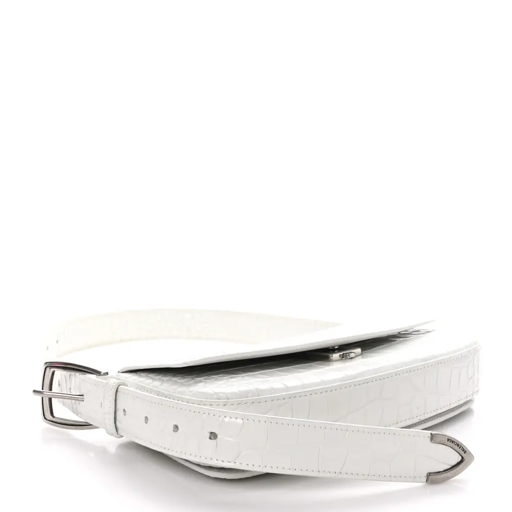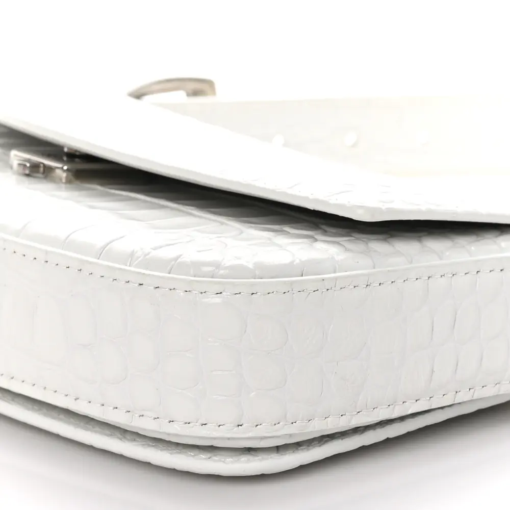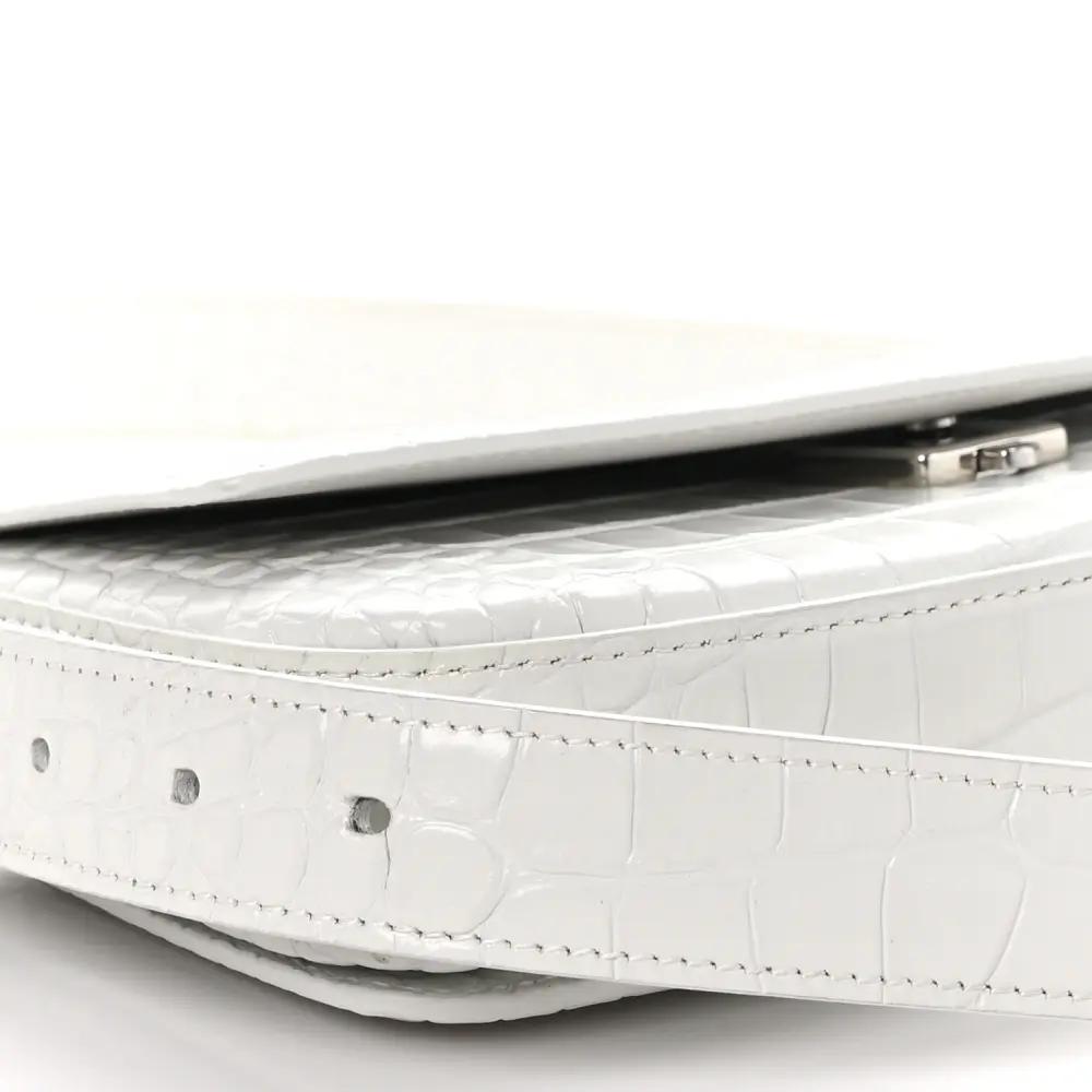 This Balenciaga Small Ghost Sling Bag in Black features crocodile-embossed shiny calfskin leather for a sleek and modern aesthetic. Silver hardware enhances its edgy design. Spacious yet compact, it’s perfect for daily essentials. The adjustable strap allows for versatile styling options. A bold addition to any contemporary wardrobe.