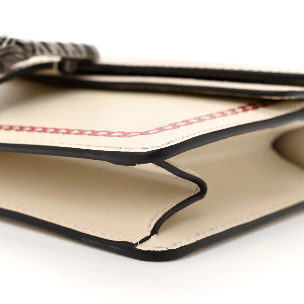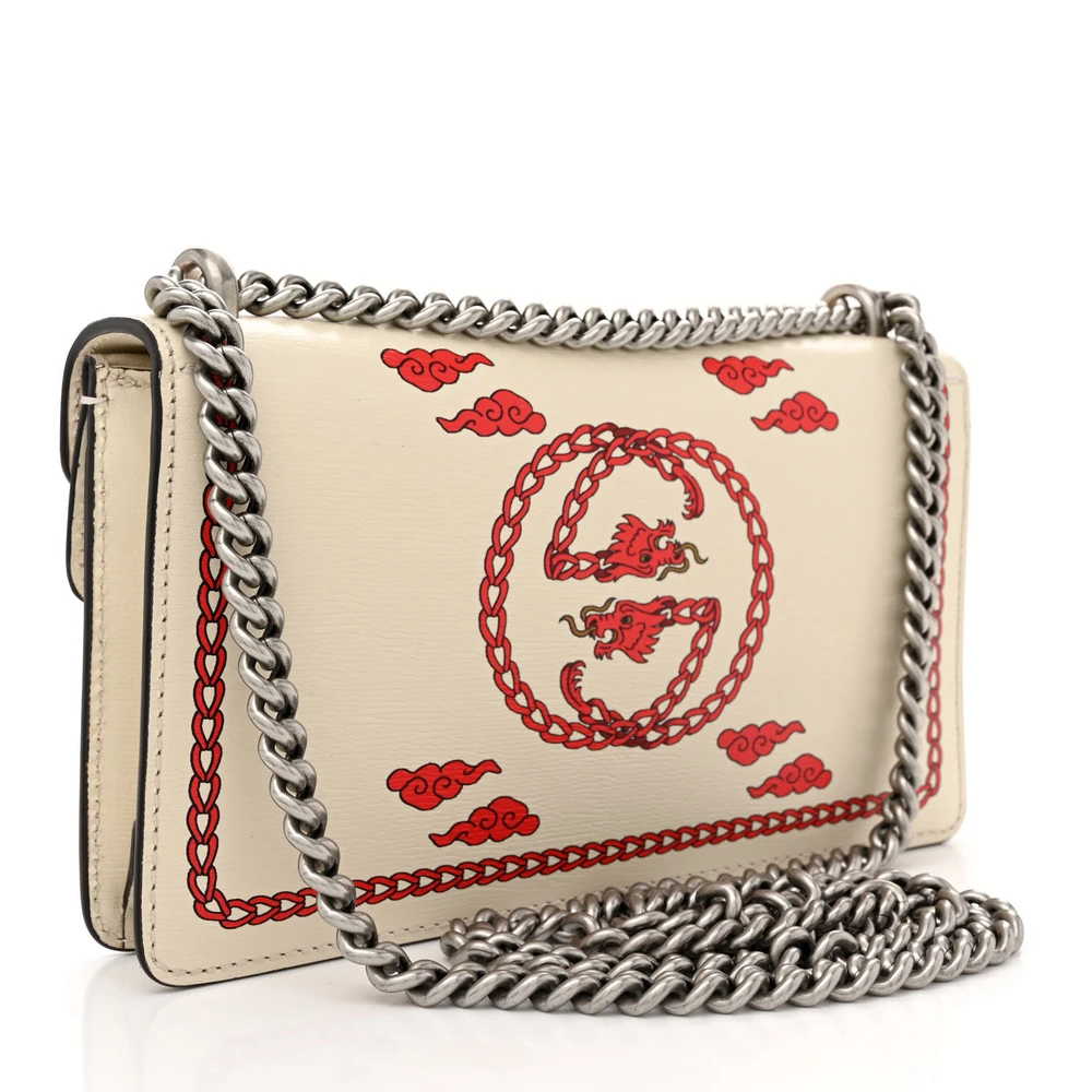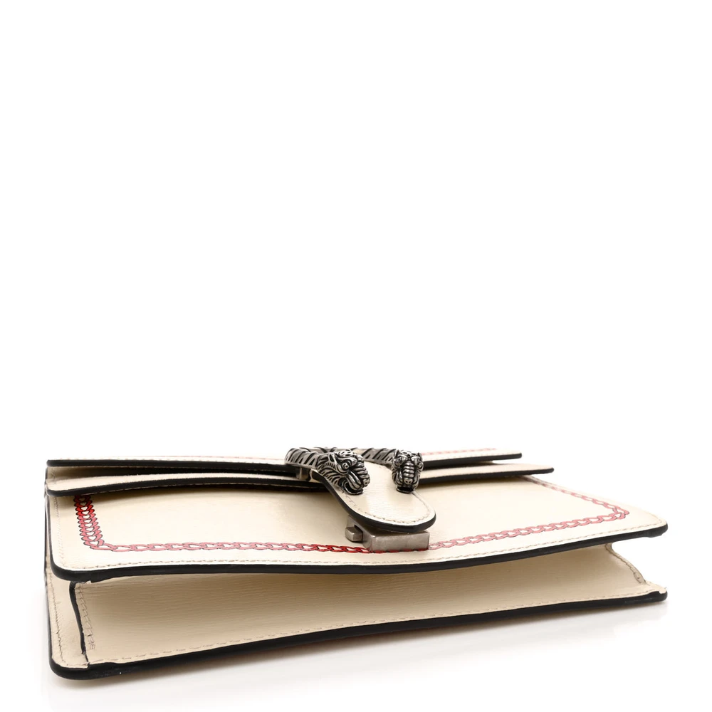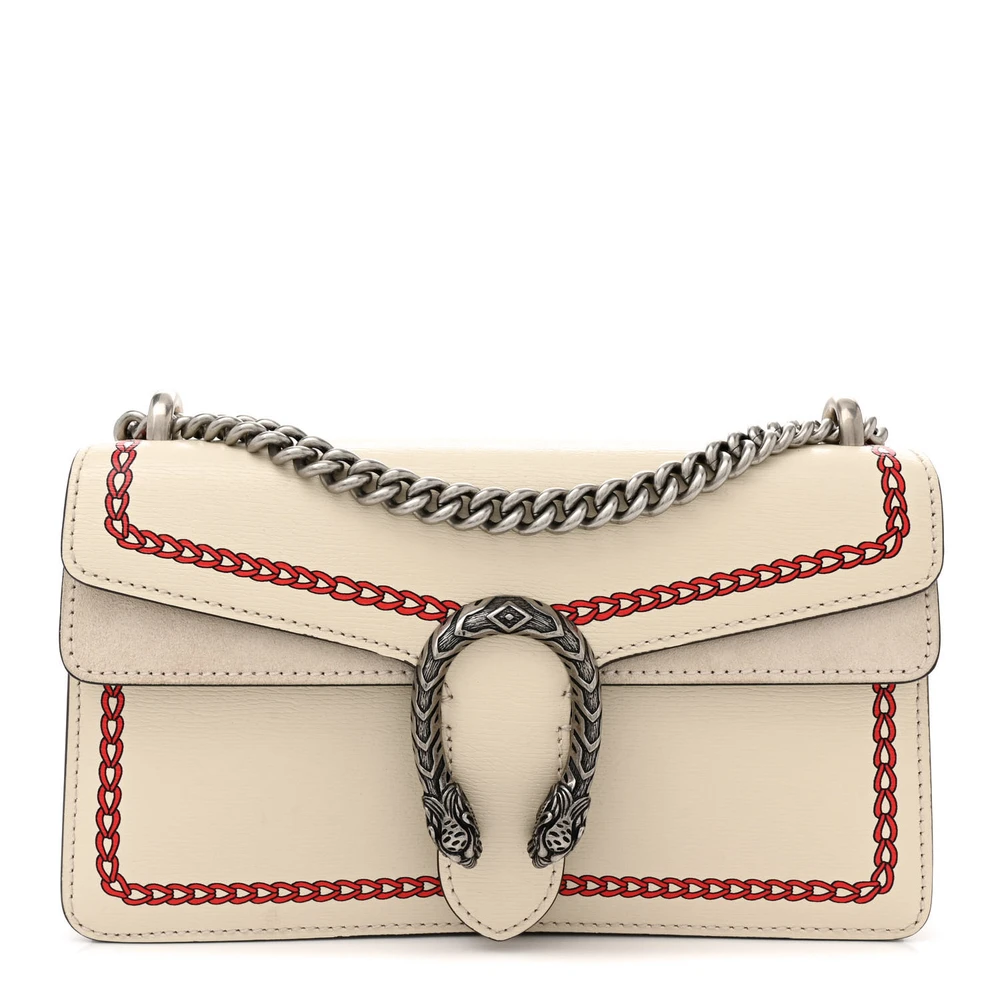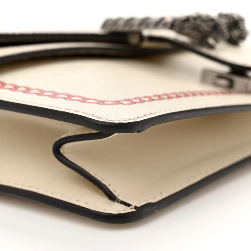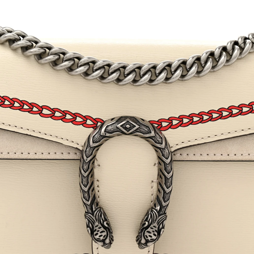 This Gucci Small Lunar New Year Dionysus Shoulder Bag is crafted in mystic white textured calfskin leather. Aged silver hardware complements its sleek design. Compact size makes it perfect for essentials. Iconic Dionysus closure enhances its timeless charm. A festive and elegant piece.