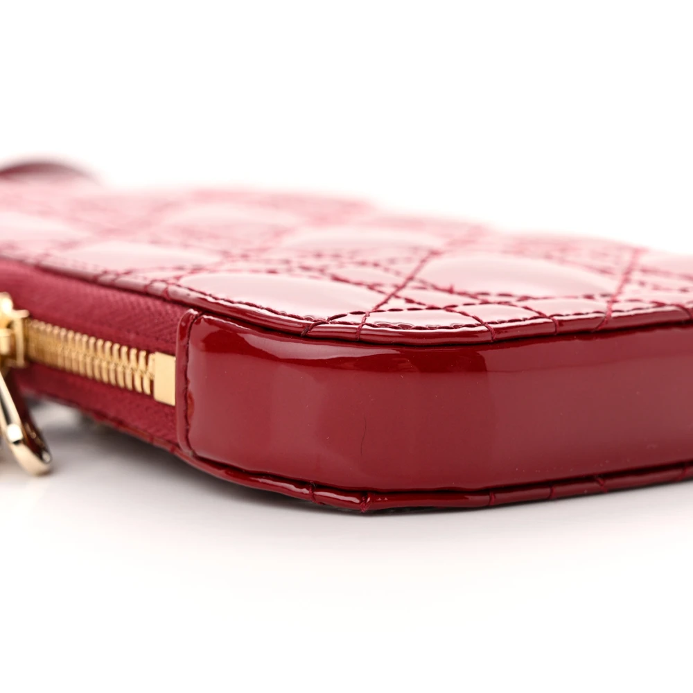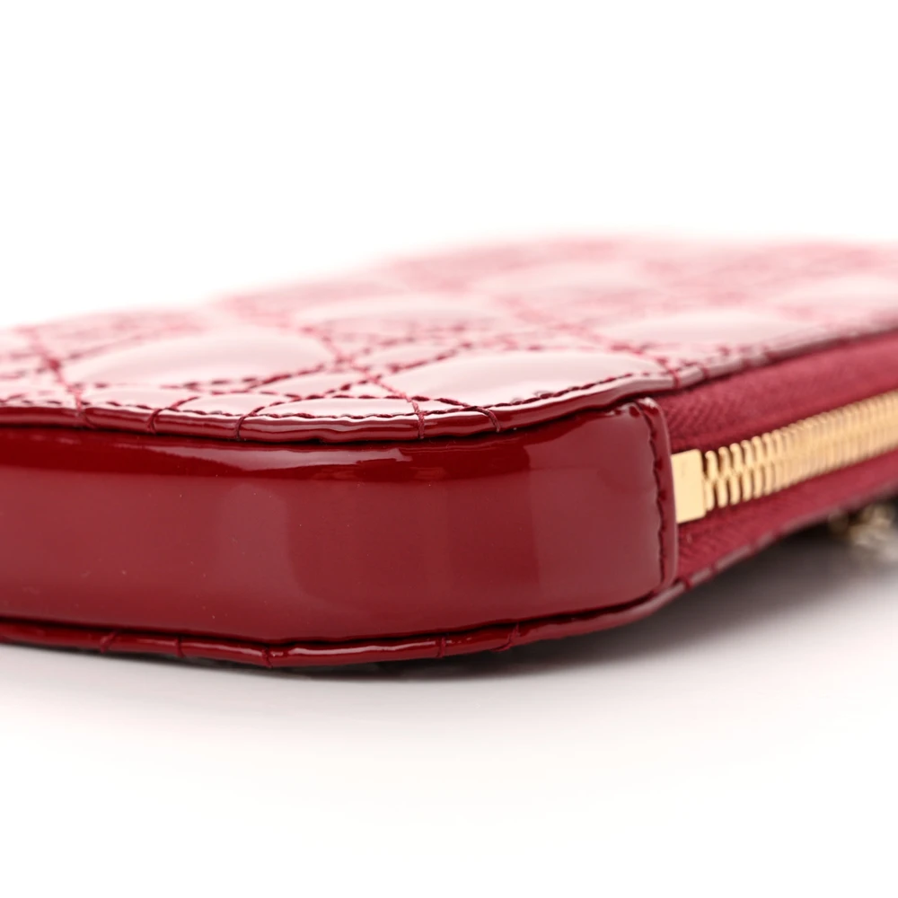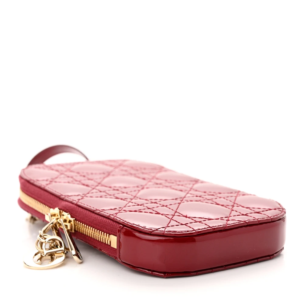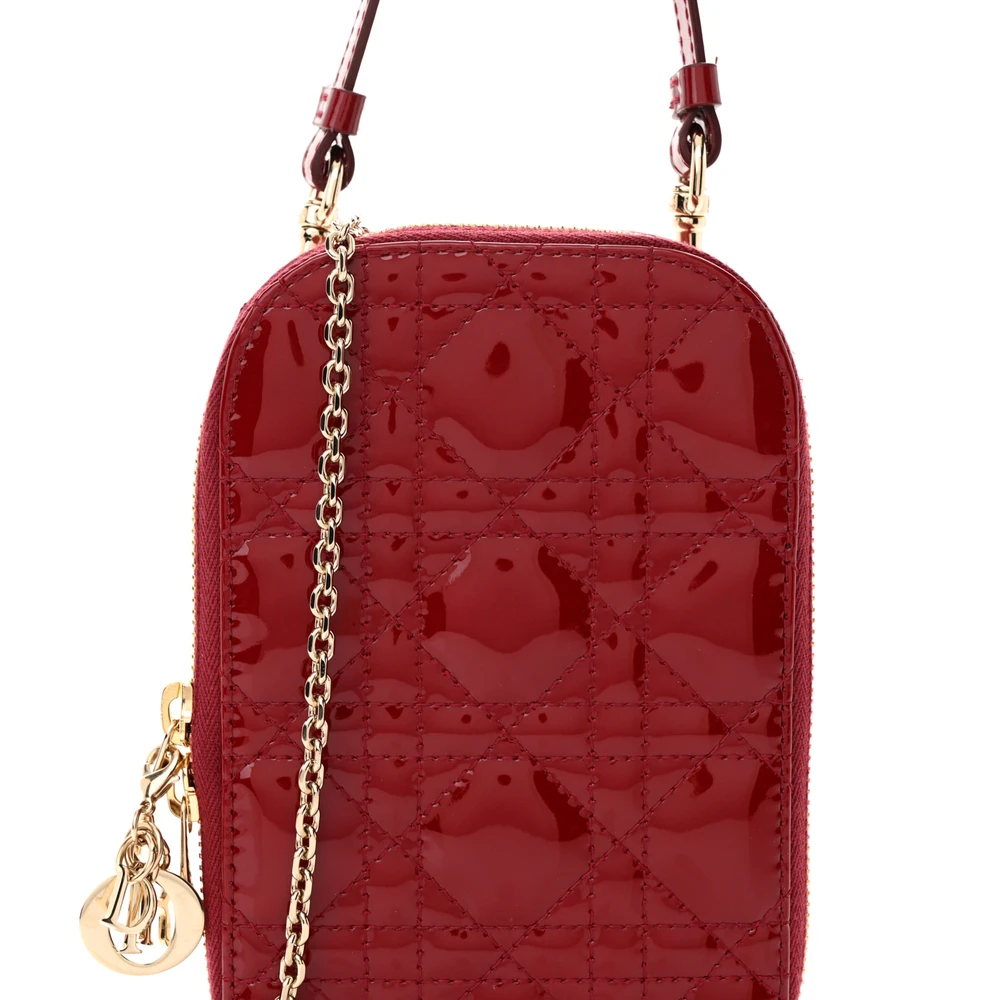 This Dior Lady Dior Phone Holder in Cherry Red Patent Cannage Calfskin Leather is a chic and functional accessory. Gold hardware highlights its glossy finish, adding a luxurious feel. Compact and stylish, it’s perfect for organizing your phone and essentials. A timeless choice for everyday elegance.