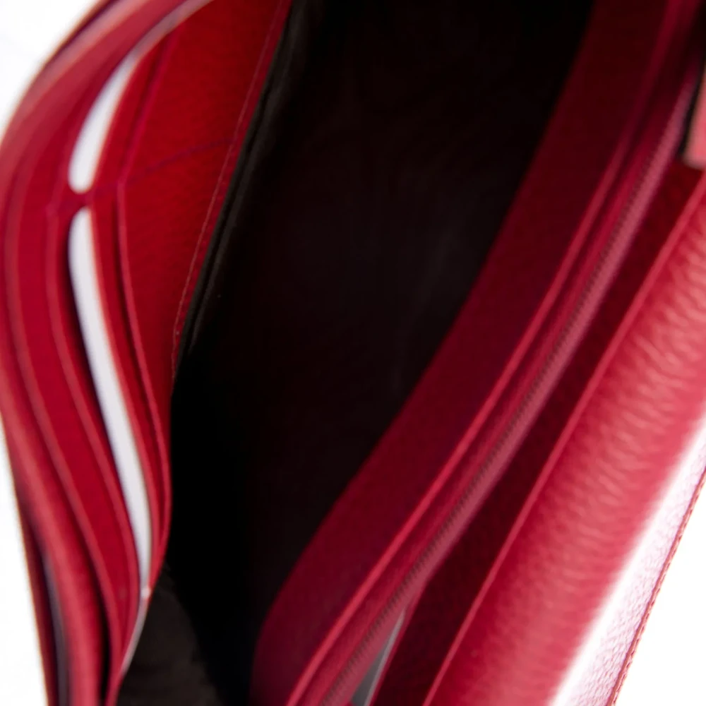 This Gucci Large Interlocking G Logo Continental Wallet is a bold and luxurious statement piece. Made from red calfskin leather, it features the iconic interlocking G logo. The gold hardware adds a touch of sophistication, enhancing its timeless design. Spacious compartments ensure effortless organization for your essentials. This wallet conveys refined elegance and modern charm.