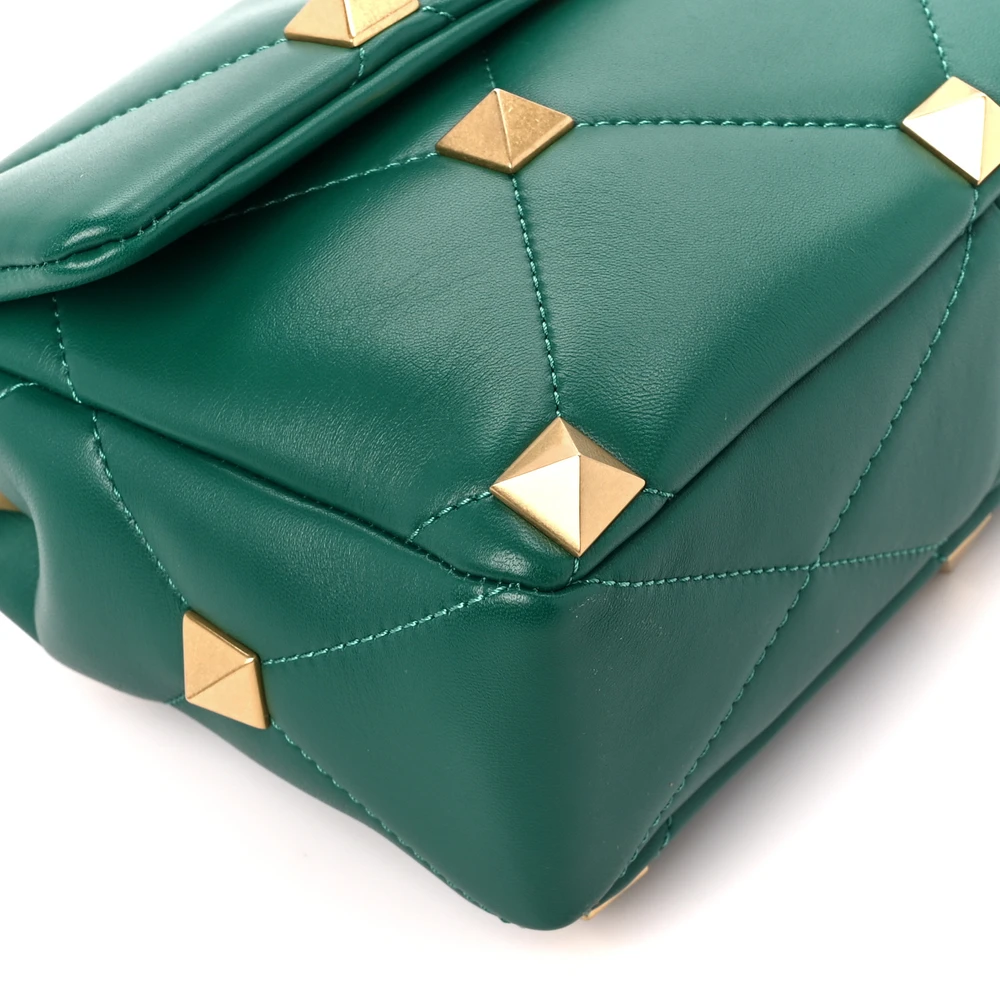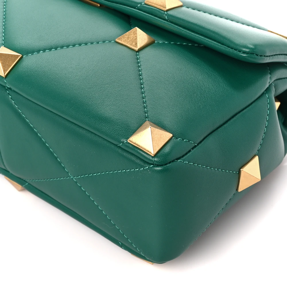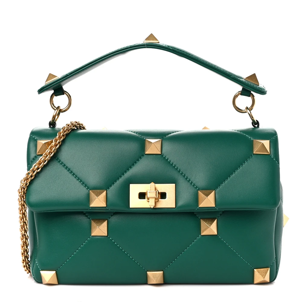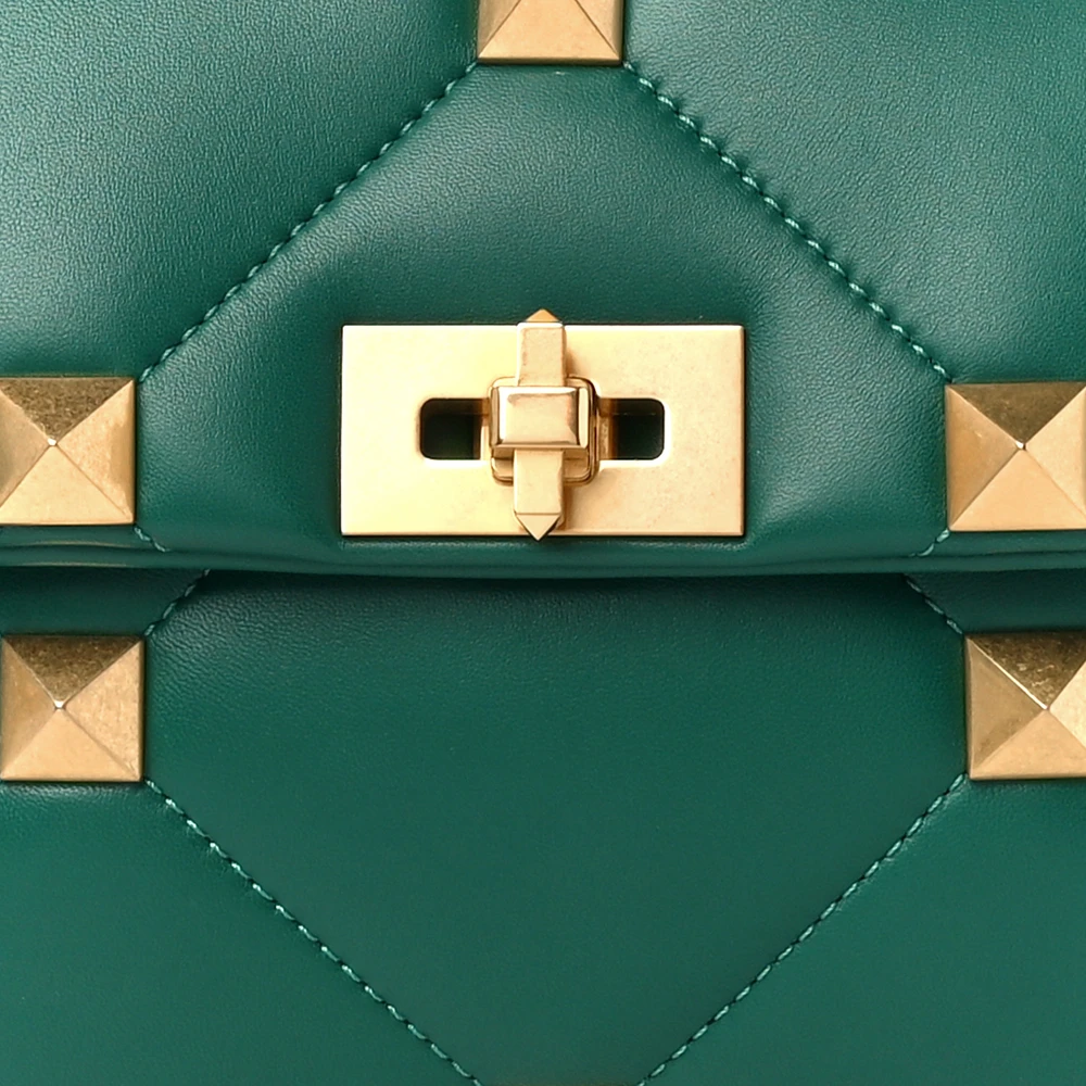 This Valentino Garavani Large Roman Stud Shoulder Bag in Jungle is bold and modern. Nappa leather with aged gold hardware creates a striking aesthetic. Spacious interior fits all your essentials. Perfect for casual or statement-making outfits. Roman stud detailing adds unique flair. A standout piece for fashion enthusiasts.