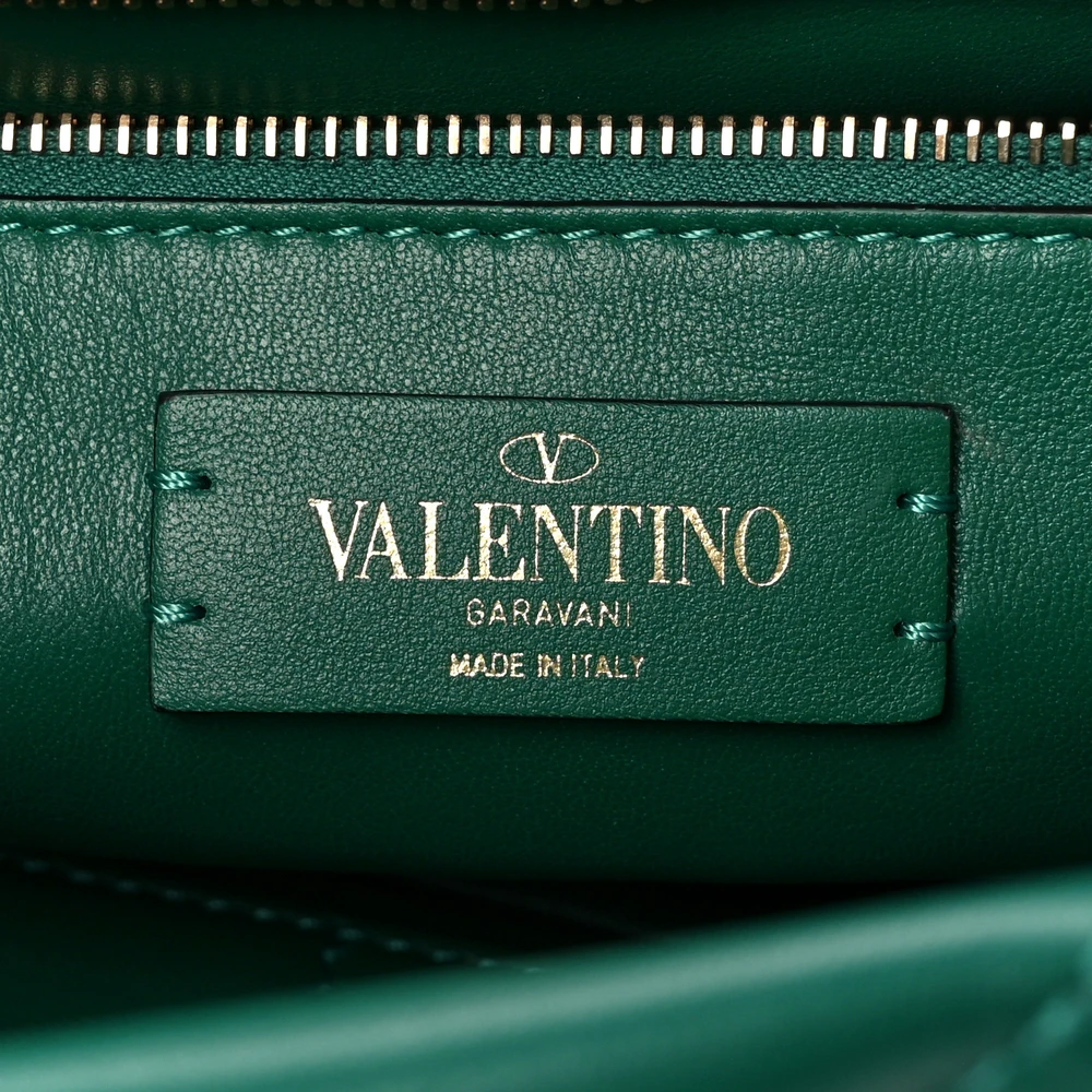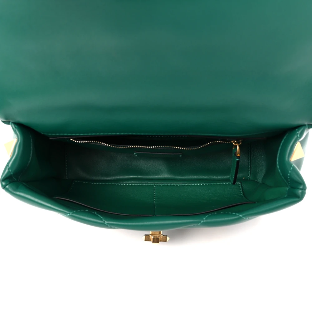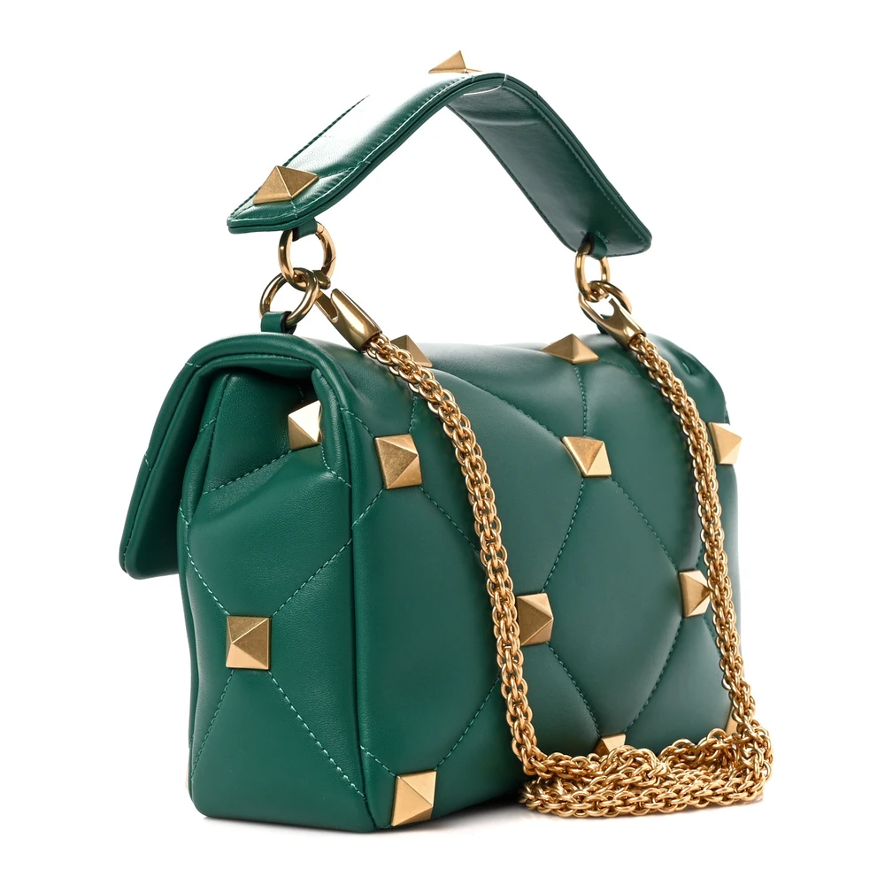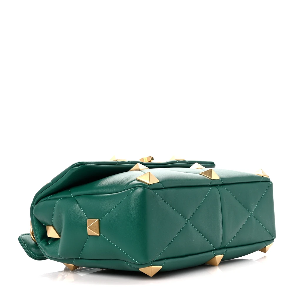 This Valentino Garavani Large Roman Stud Shoulder Bag in Jungle is bold and modern. Nappa leather with aged gold hardware creates a striking aesthetic. Spacious interior fits all your essentials. Perfect for casual or statement-making outfits. Roman stud detailing adds unique flair. A standout piece for fashion enthusiasts.