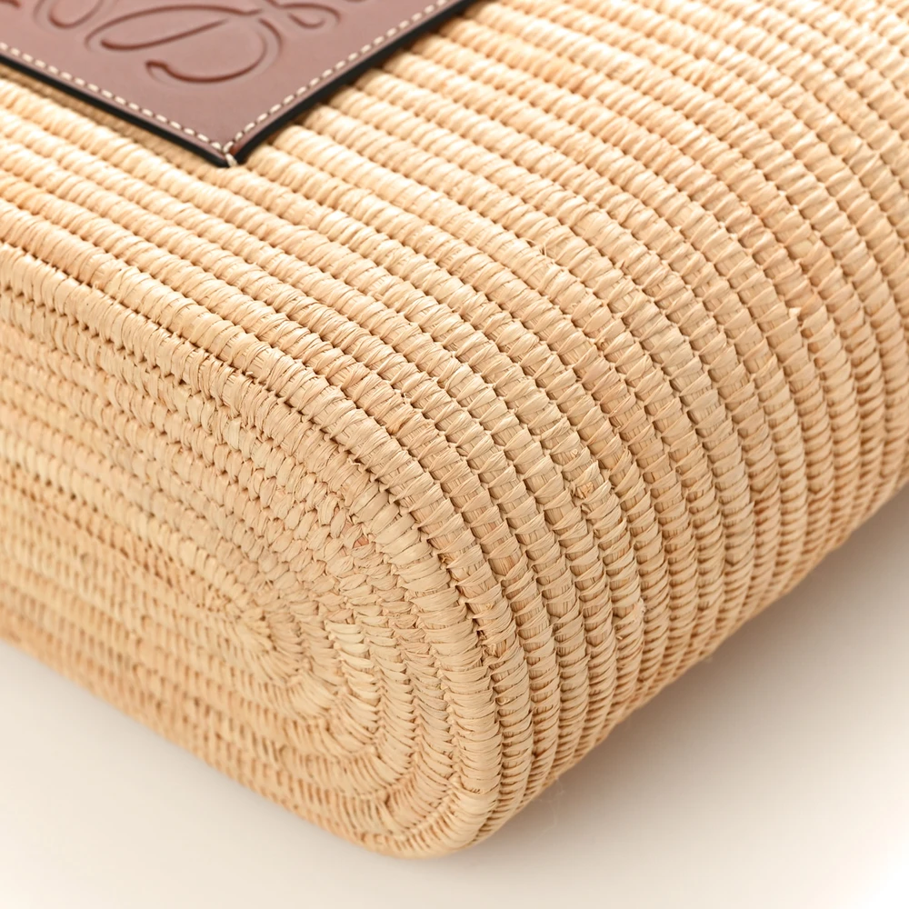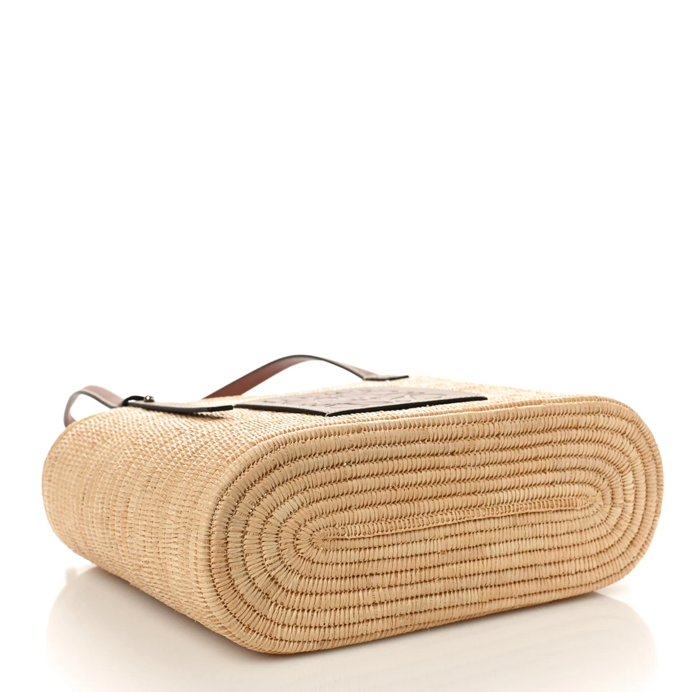 This Loewe Square Basket Tote Bag Small in Natural/Tan features raffia and calfskin leather in a compact design. Spacious and lightweight, it’s perfect for essentials. The natural and tan tones add classic elegance. Comfortable handles ensure ease of carrying. A stylish choice for summer outings. Functional and chic.
