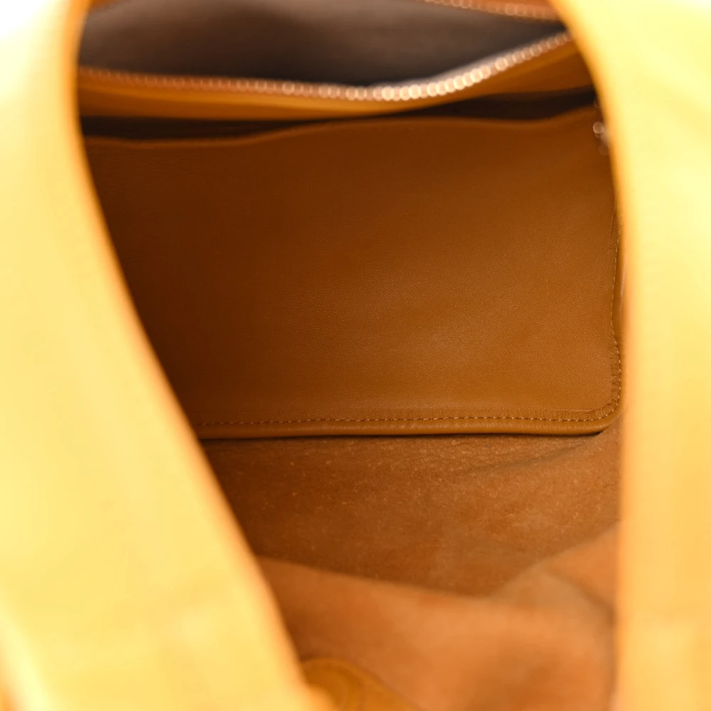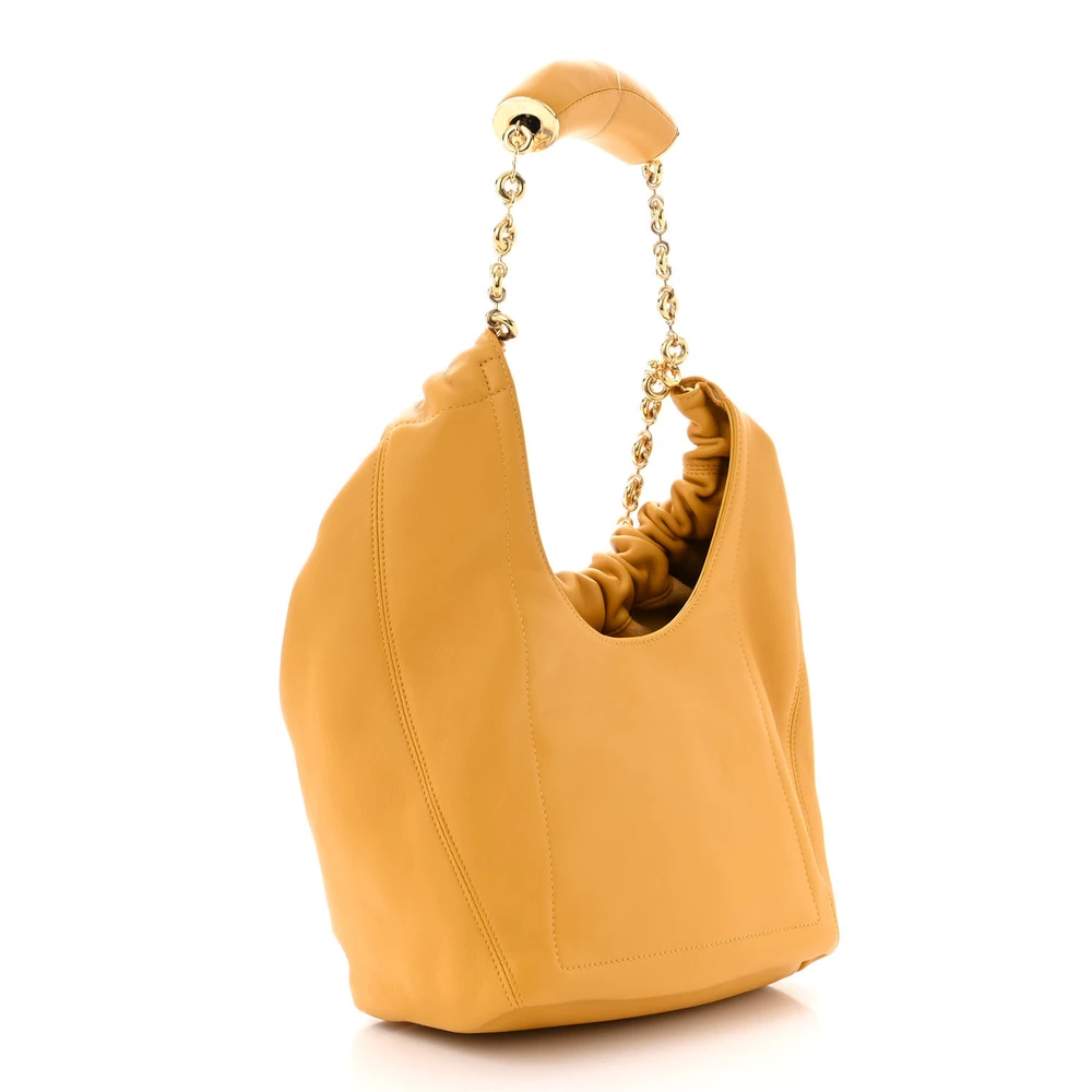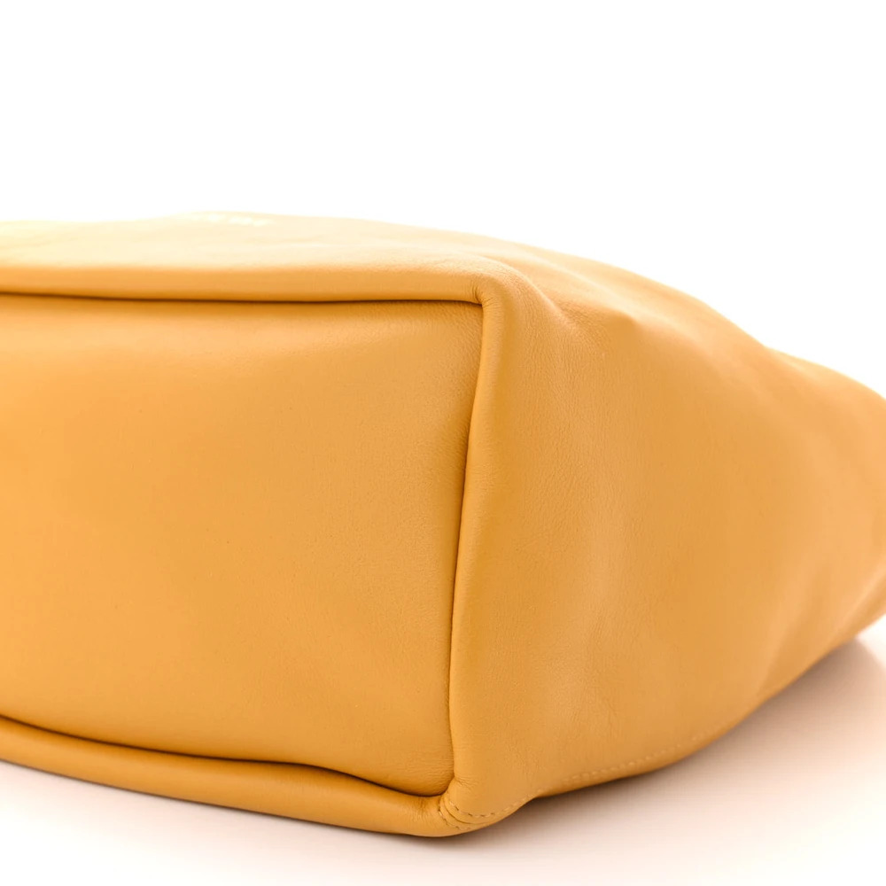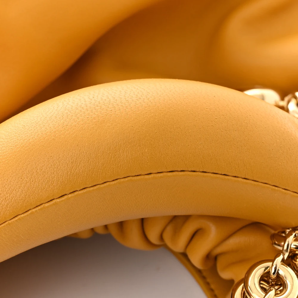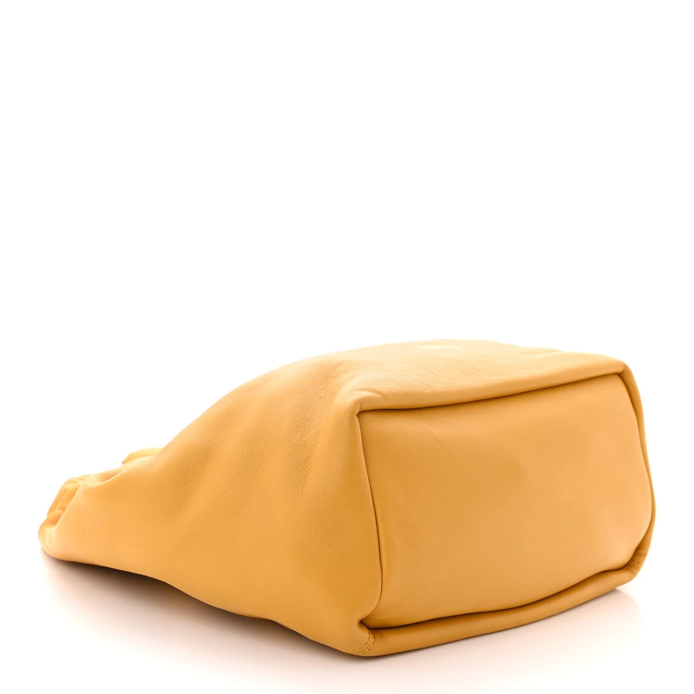 This Loewe Squeeze Bag Small in Sunflower features soft nappa lambskin leather with a bold hue. Compact and lightweight, it’s perfect for essentials. The sunflower yellow tone adds a cheerful touch. Gold hardware enhances its refined look. A stylish choice for casual outings. Combines practicality with vibrant charm.