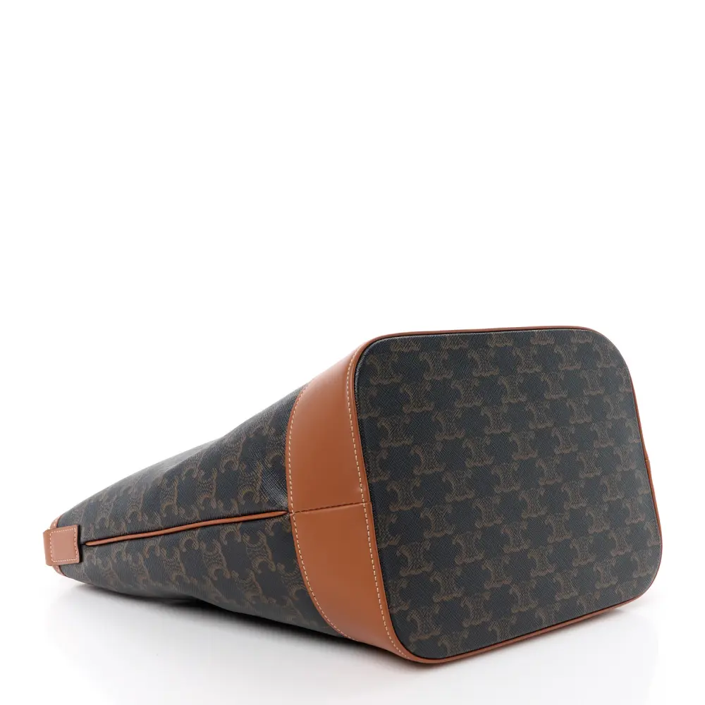 This Celine Medium Bucket Bag in Tan combines Triomphe canvas and calfskin leather with gold hardware. Its spacious design is perfect for everyday essentials. The adjustable strap offers versatile carry options. A chic and practical addition to any collection.