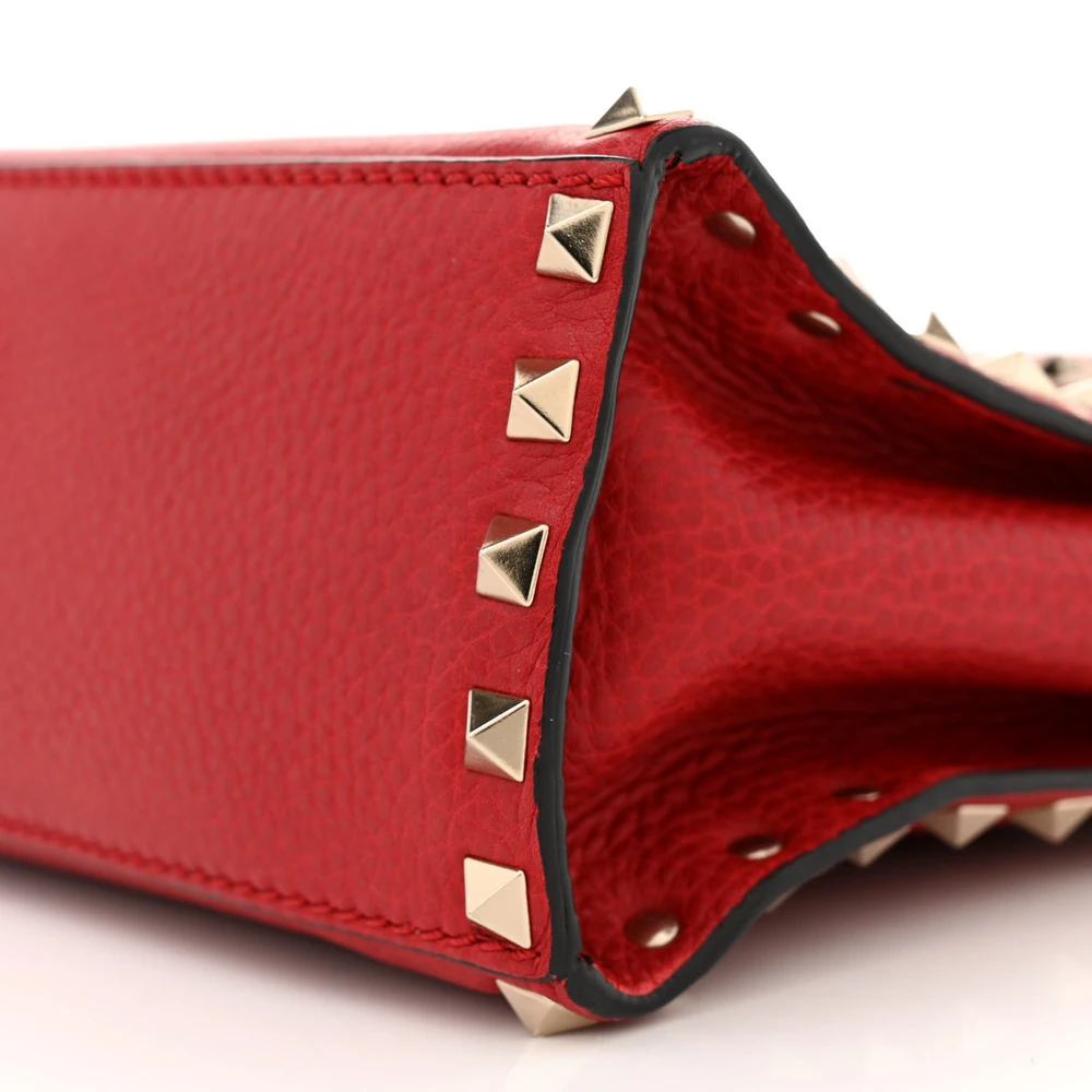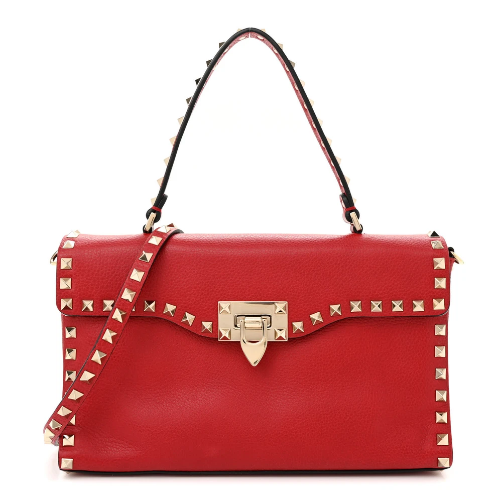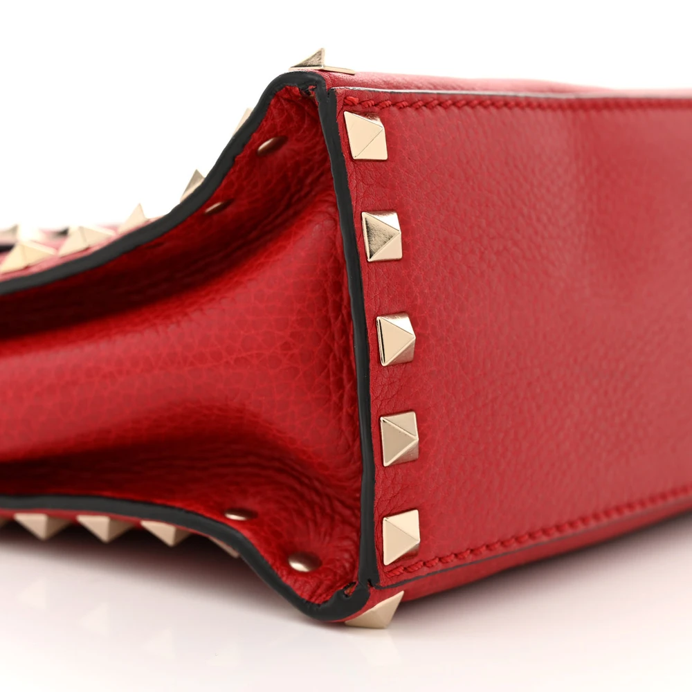 This Valentino Garavani Medium Rockstud Top Handle Shoulder Bag in Red is striking and versatile. Pebbled calfskin leather with light gold hardware adds sophistication. Spacious enough for work or casual use. Rockstud detailing gives an edgy touch. Perfect for making a bold statement. A classic design with modern flair.