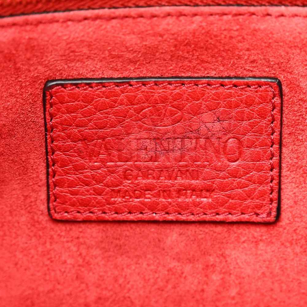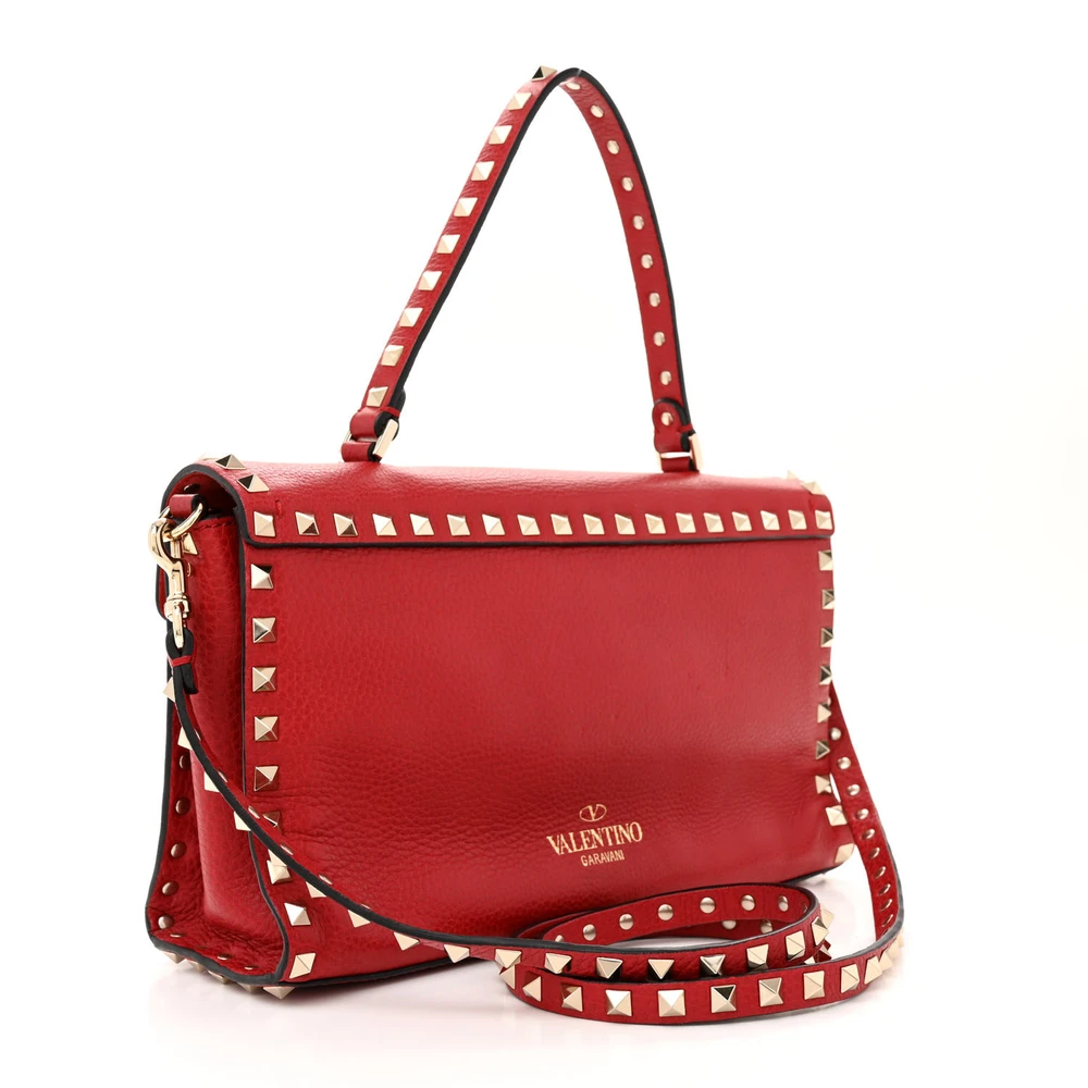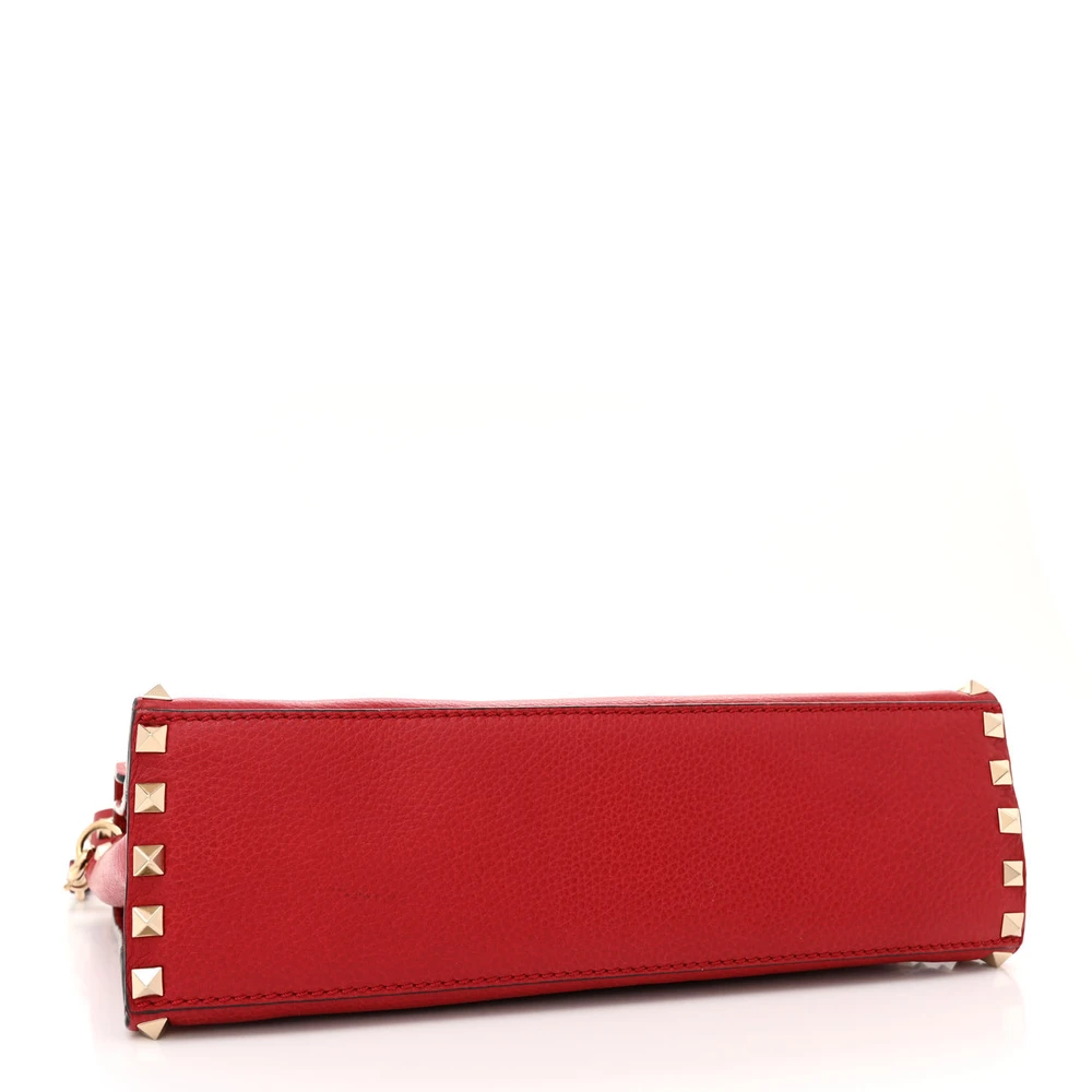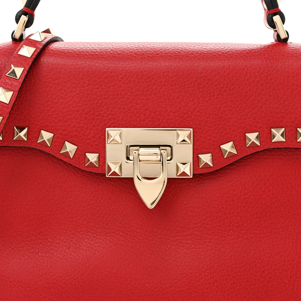 This Valentino Garavani Medium Rockstud Top Handle Shoulder Bag in Red is striking and versatile. Pebbled calfskin leather with light gold hardware adds sophistication. Spacious enough for work or casual use. Rockstud detailing gives an edgy touch. Perfect for making a bold statement. A classic design with modern flair.