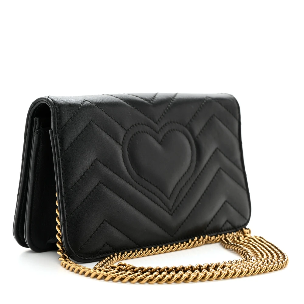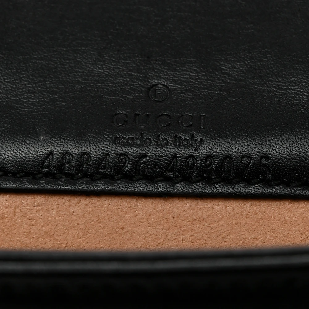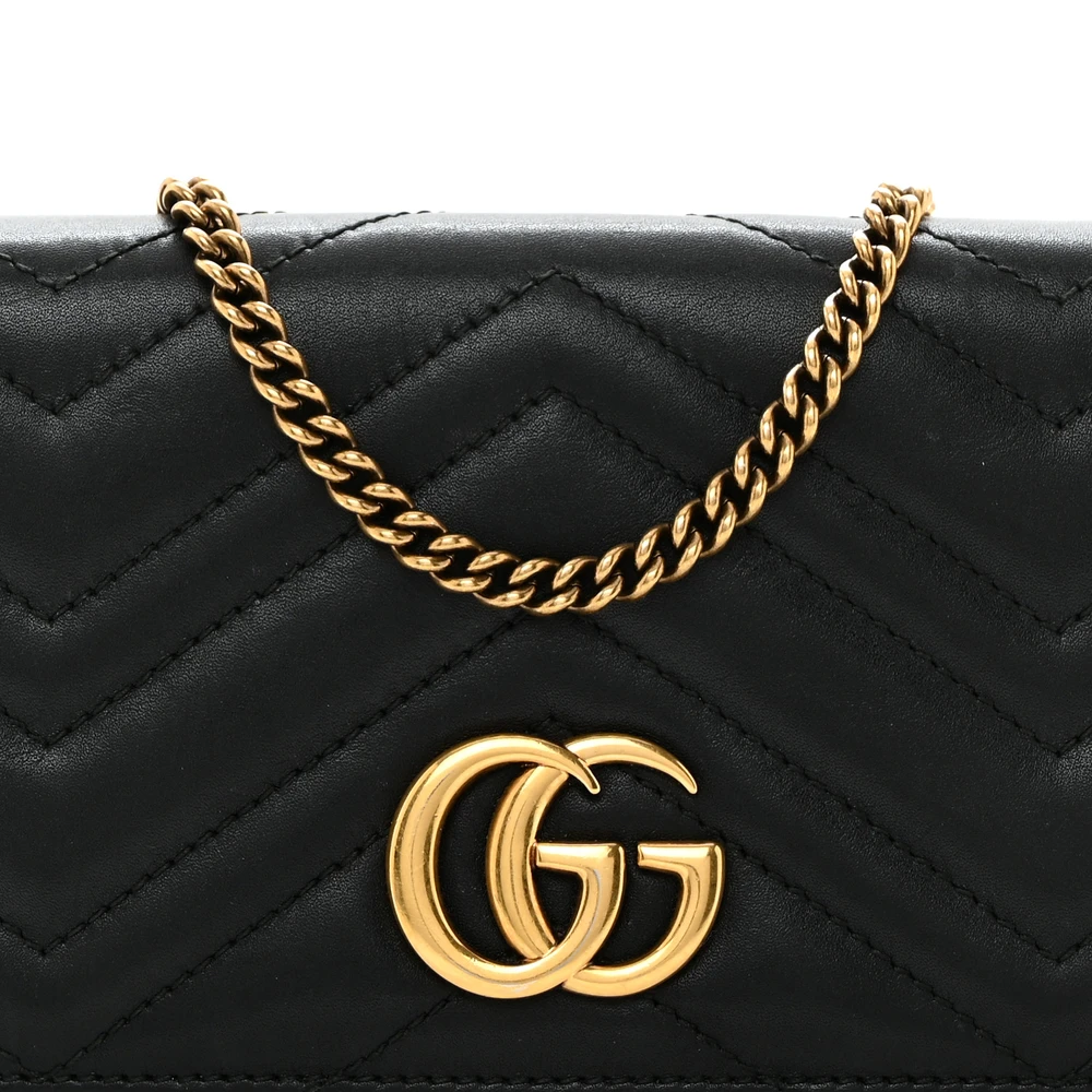 This Gucci Mini GG Marmont Bag is crafted in black calfskin matelassé leather. The aged gold hardware adds a vintage charm. Its compact size is perfect for carrying essentials. Designed with timeless elegance for any occasion. A must-have addition to any fashion-forward wardrobe.