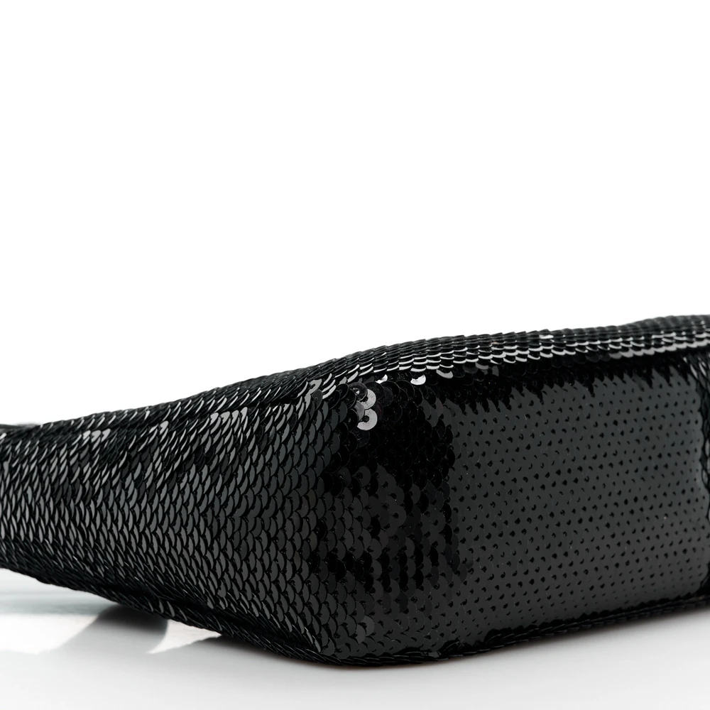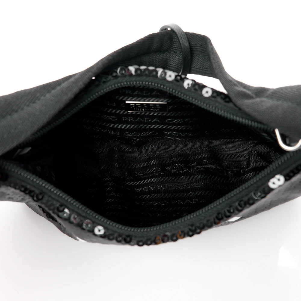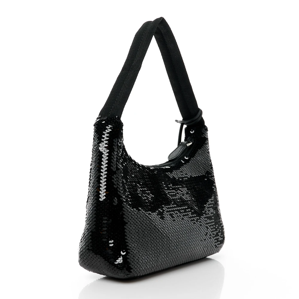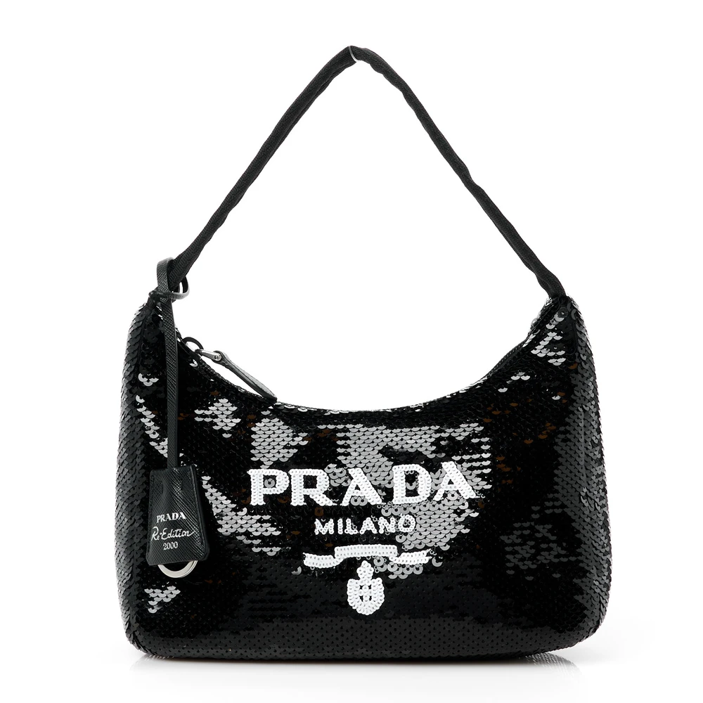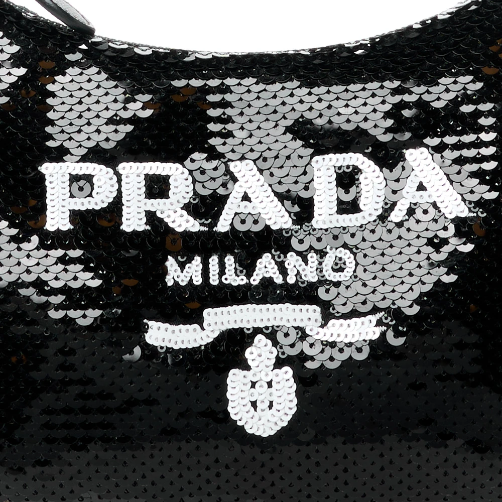 This Prada Mini Re-Edition 2000 Bag in Black/White is designed with paillettes sequins. Compact size for your essentials. Silver hardware adds a touch of luxury. A standout accessory for evening events. Lightweight and easy to carry. Perfect for adding sparkle to your outfit.