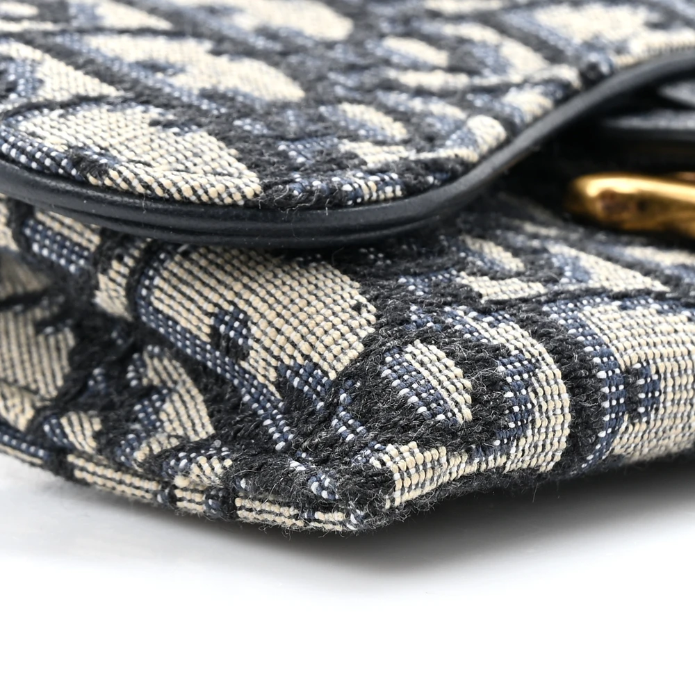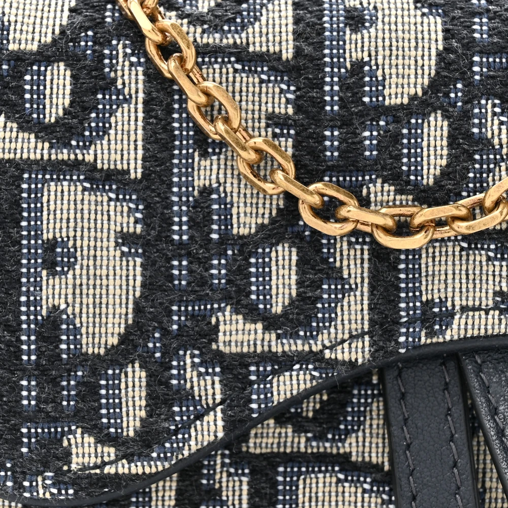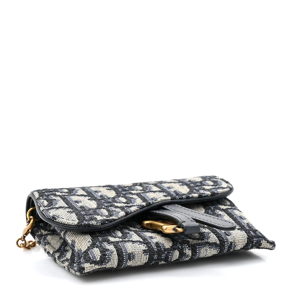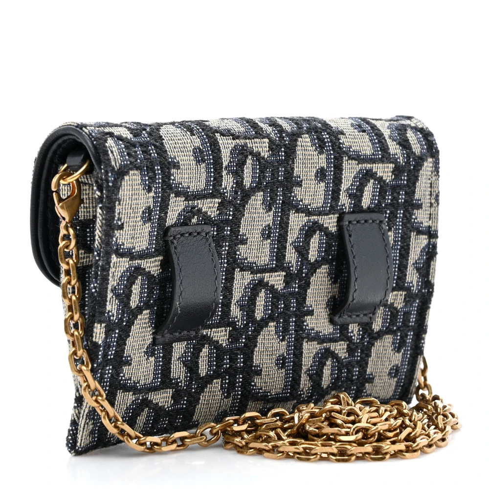 This Dior Nano Saddle Chain Pouch in Blue Oblique Canvas combines compact functionality with iconic design. The gold hardware accentuates its luxurious appeal. Perfect for carrying essentials, it’s a stylish addition to casual or formal outfits. Its Oblique pattern ensures timeless Dior elegance.