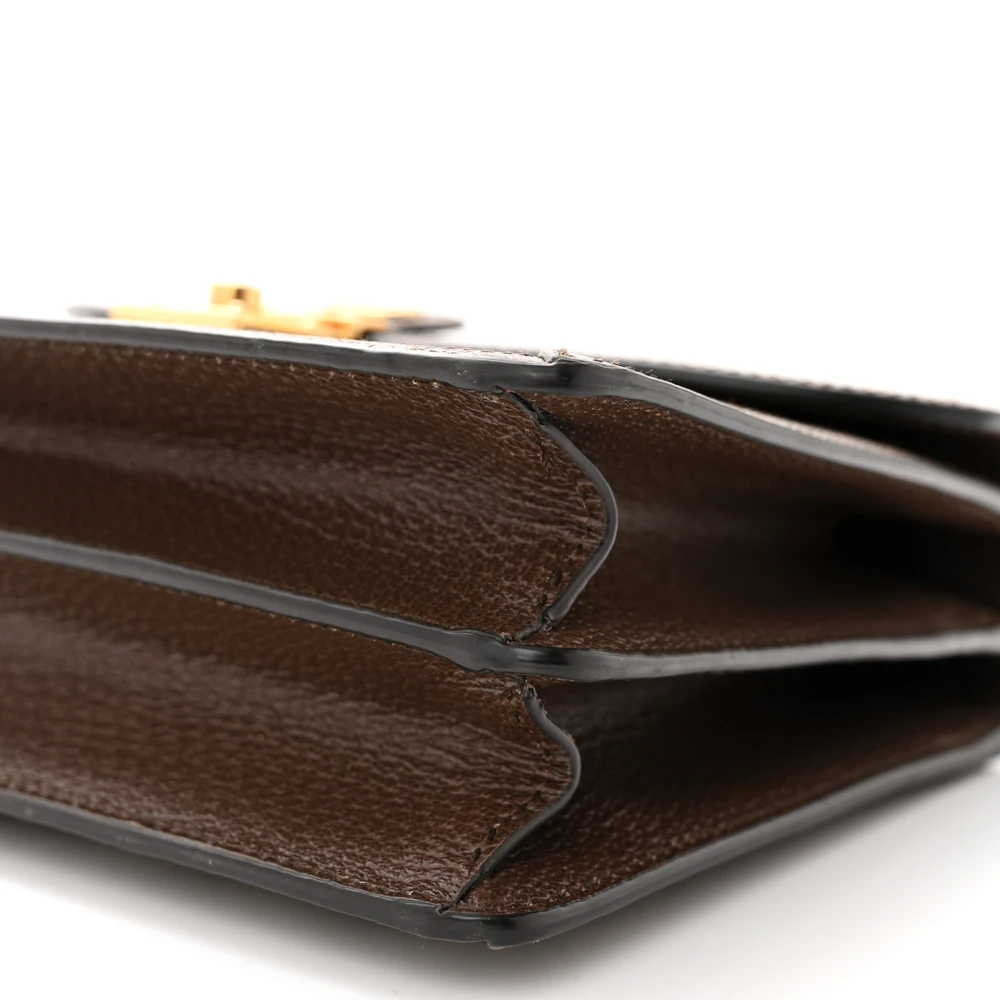 This Gucci Small Web Ophidia Padlock Top Handle Bag features beige, ebony, and new acero tones. GG Supreme monogram canvas and textured dollar calfskin leather construction. Aged gold hardware completes its classic look. Spacious interior for practical everyday use. Padlock detail adds a sophisticated touch. A refined accessory with Gucci’s signature flair.