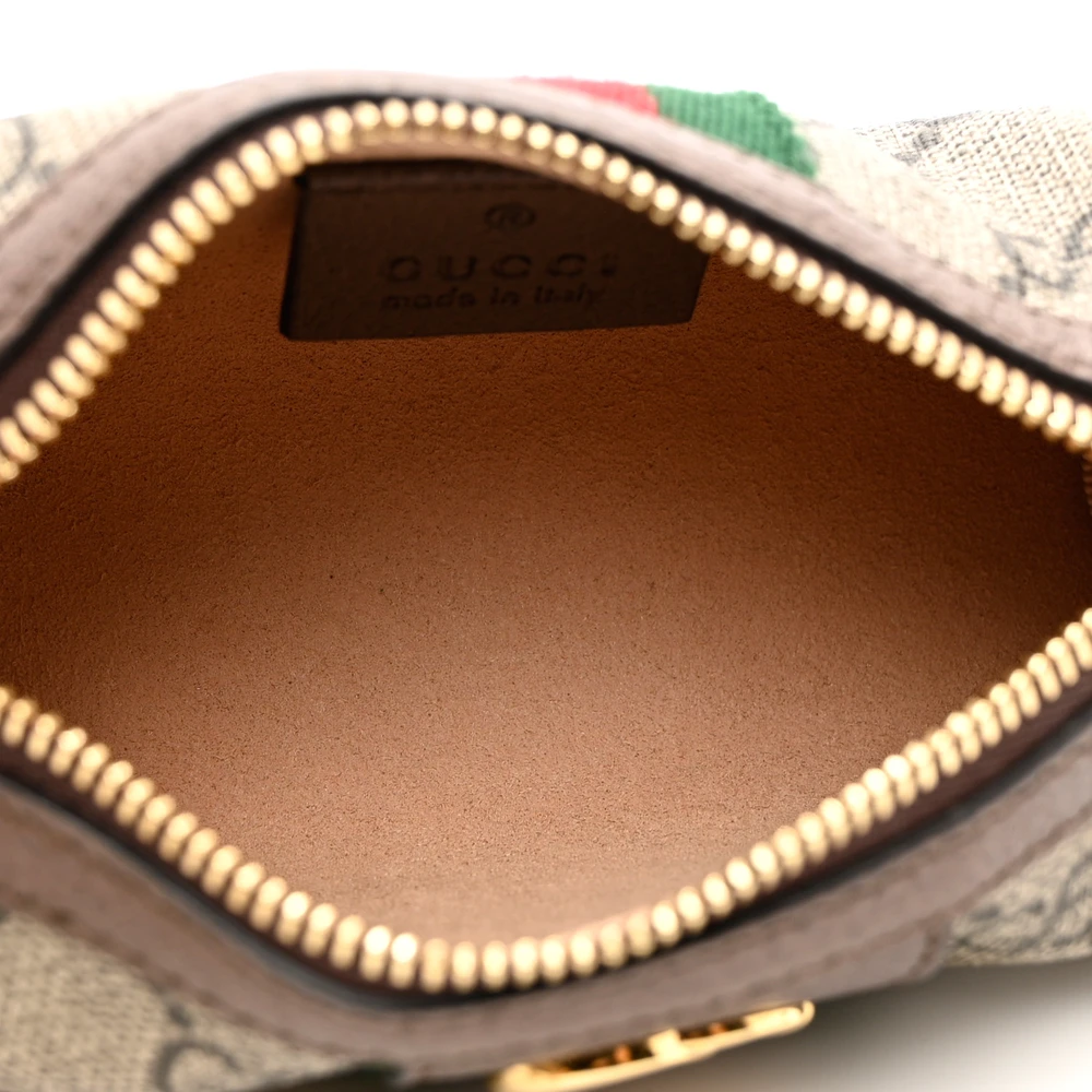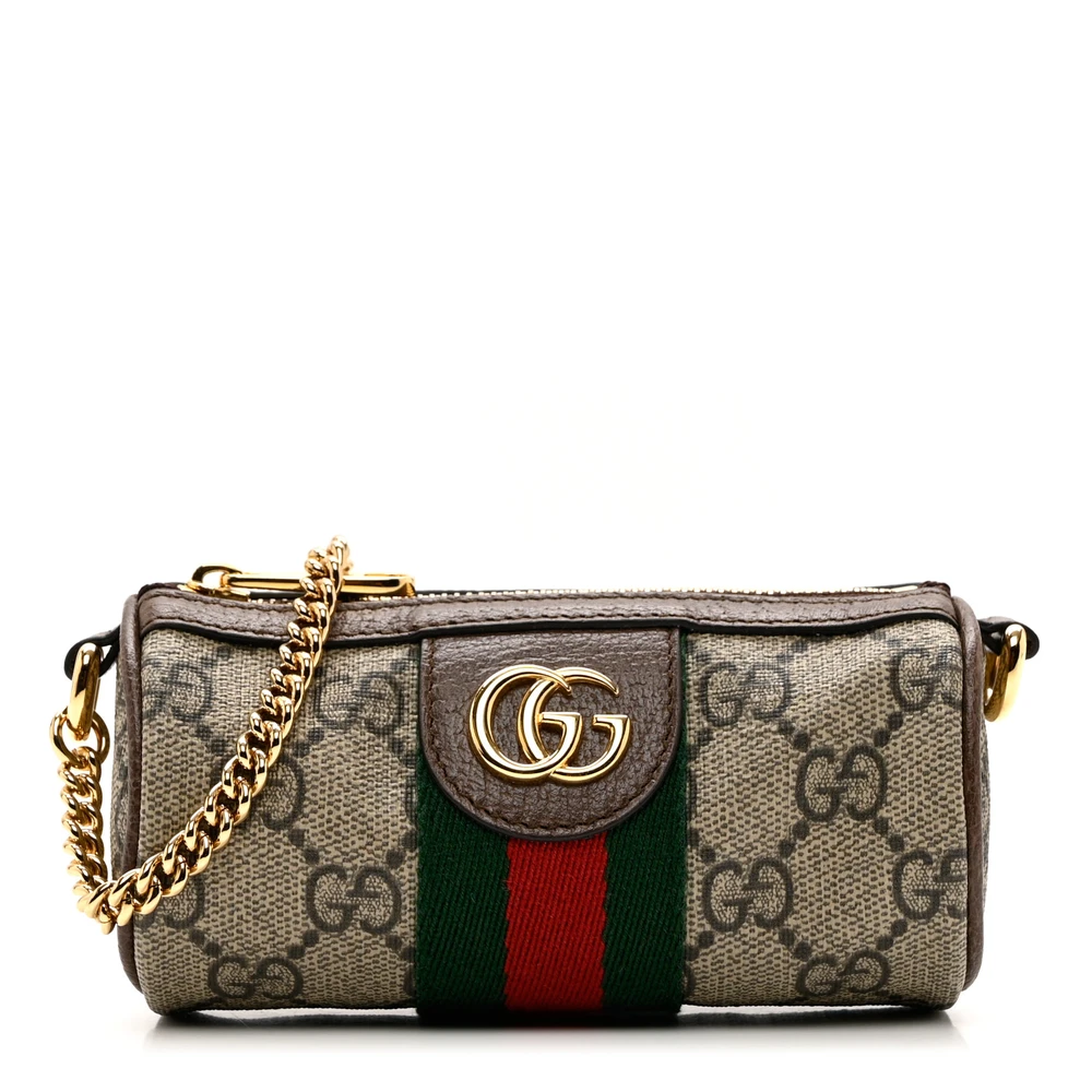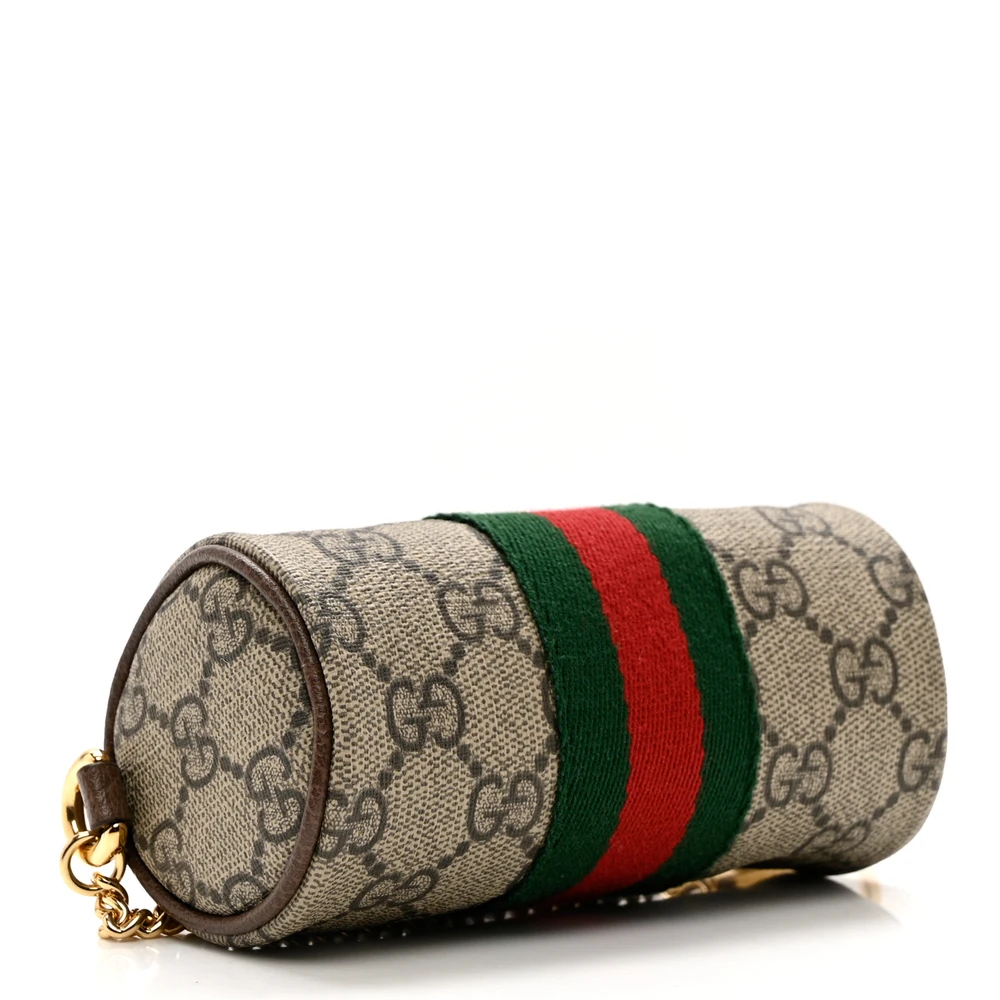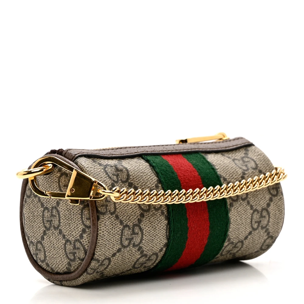 This Gucci Small Web Ophidia Barrel Coin Purse features a beige GG Supreme monogram canvas design. It is detailed with gold hardware for a polished finish. The compact barrel shape is perfect for carrying essentials. Its structured style enhances functionality and aesthetic appeal. The design integrates Gucci’s signature web detailing. A luxurious accessory that adds charm to your collection.