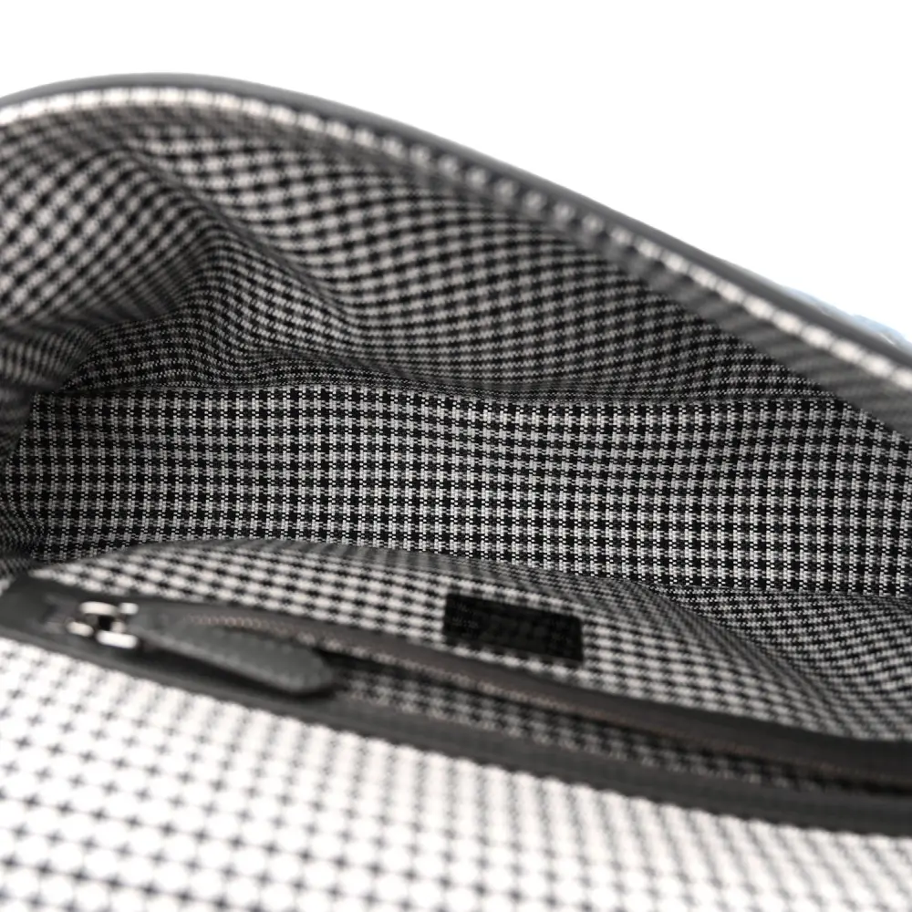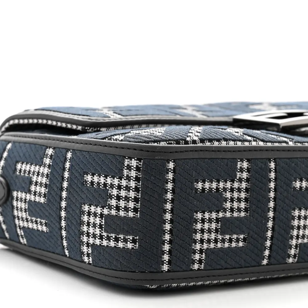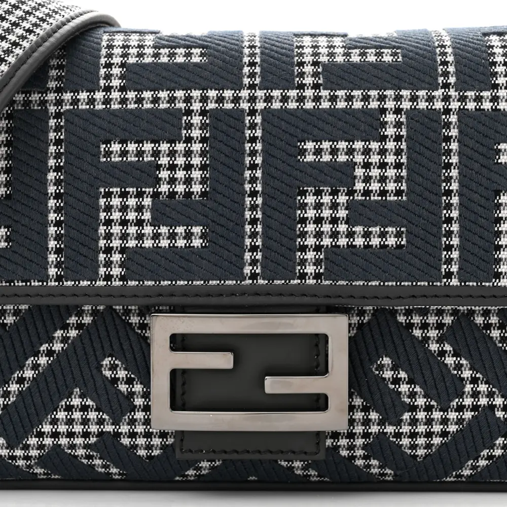 This Fendi FF Embroidered Baguette in Grigio/Anthracite features Houndstooth Wool and King Vitello Leather. Ruthenium hardware adds a bold edge to its design. Spacious yet compact for daily essentials. Perfect for winter or formal occasions. A sophisticated addition to your wardrobe. A stylish blend of texture and tradition.