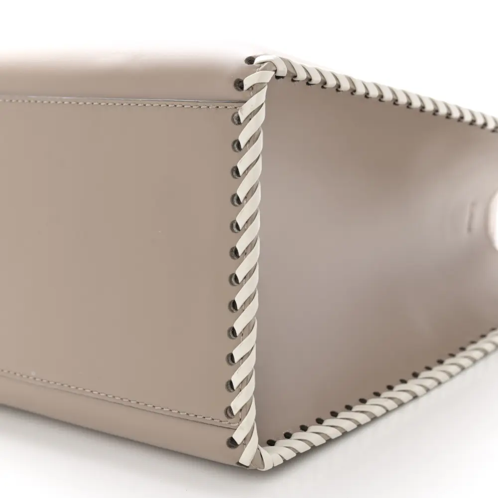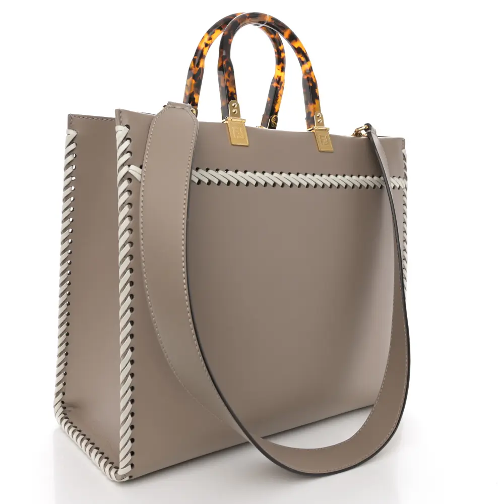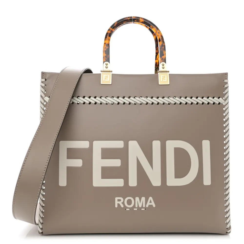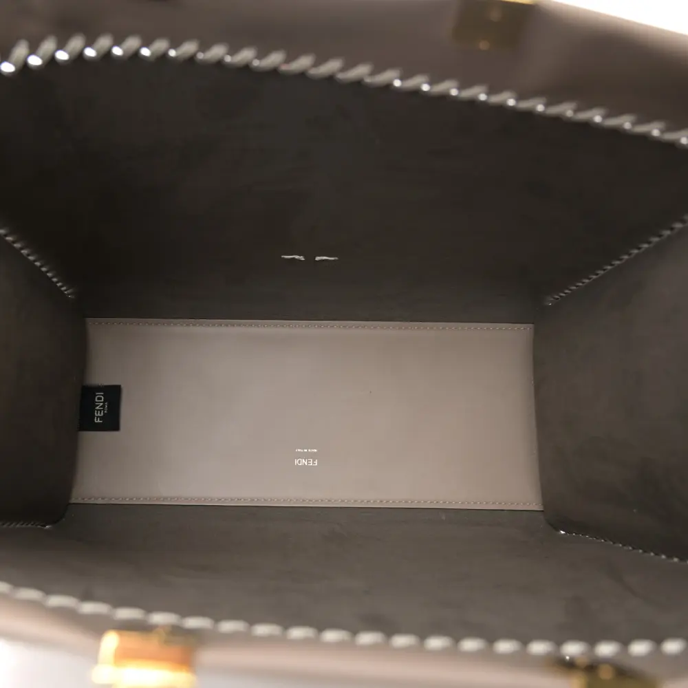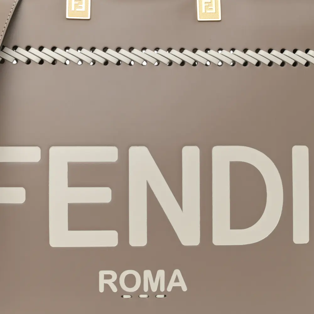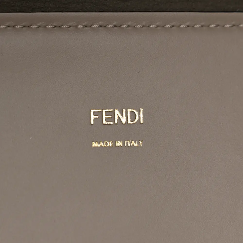 This Fendi Medium Sunshine Shopper Tote in Tortora King Vitello Ceylon Leather features debossed logos. Gold hardware accents its structured design. Its open-top style ensures easy access to belongings. Perfect for work or travel, the tote combines function and flair. Its robust handles and versatile silhouette elevate any outfit. Ideal for modern professionals.