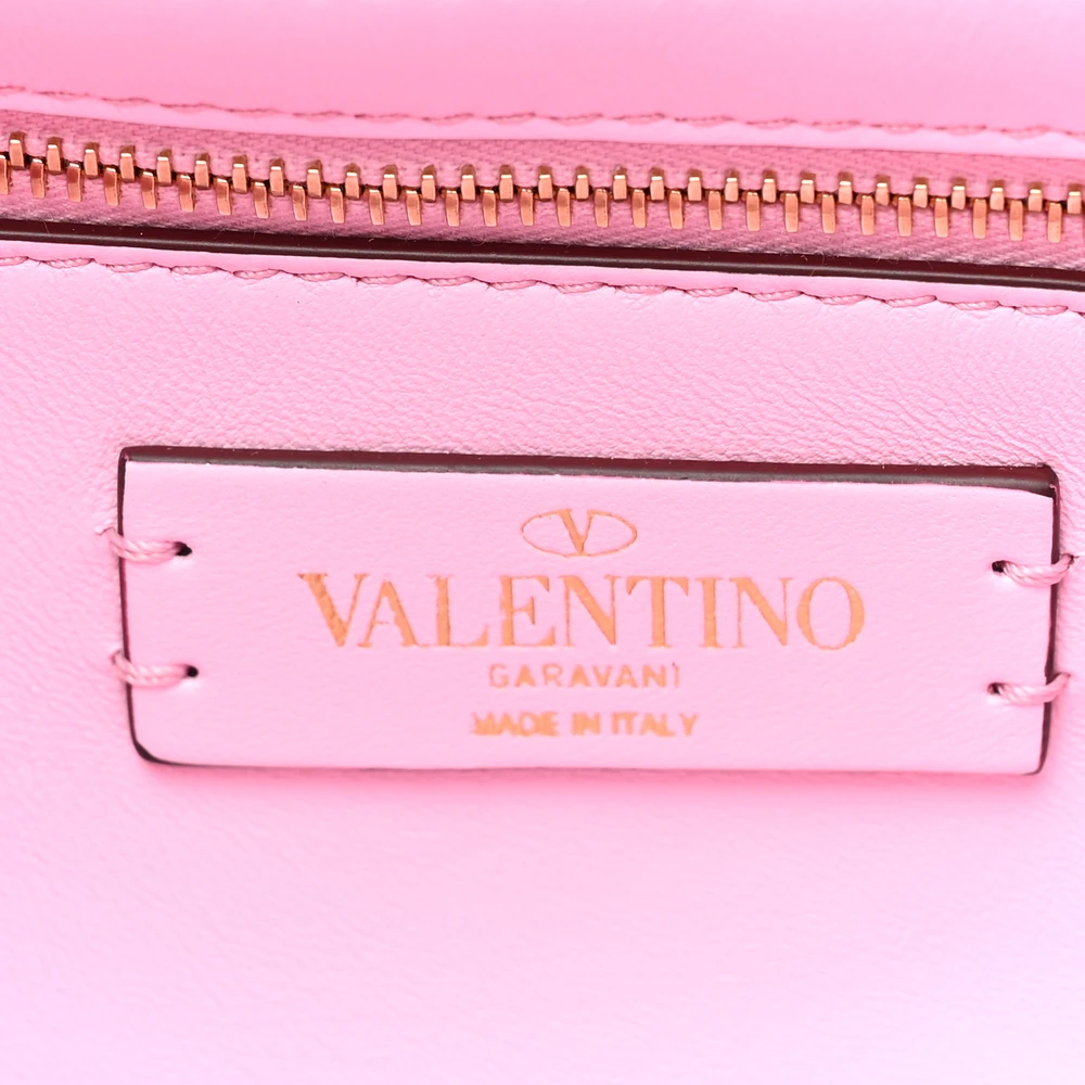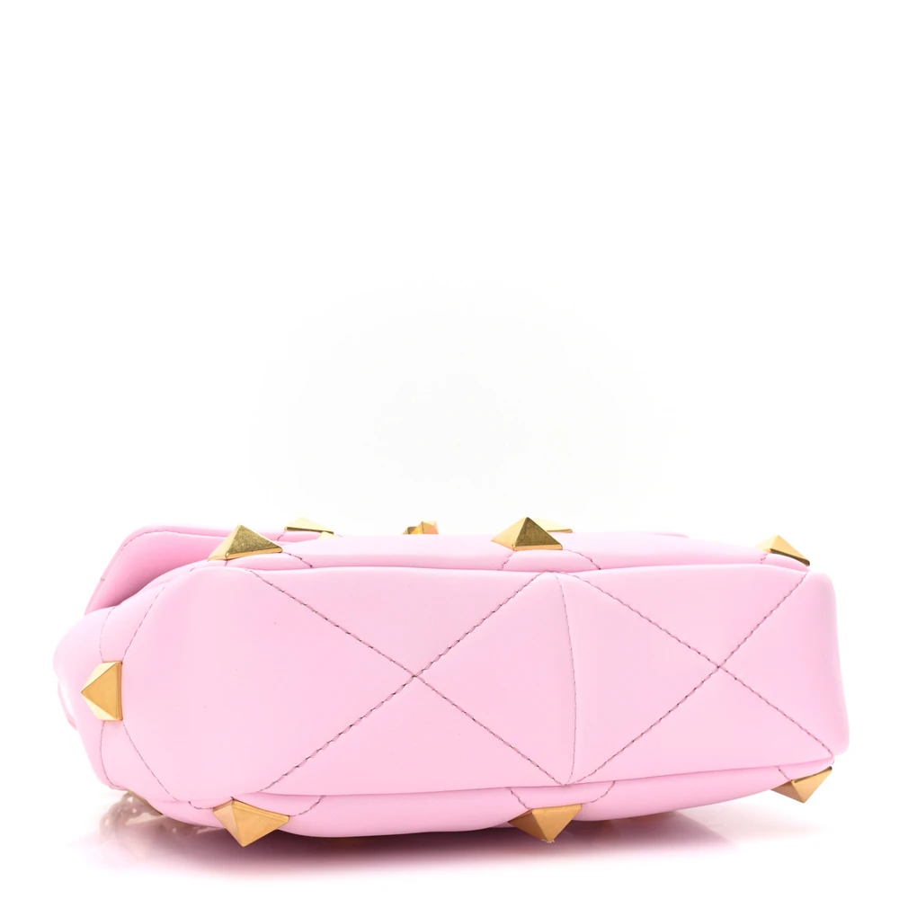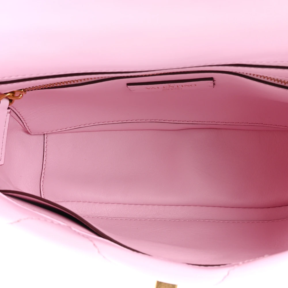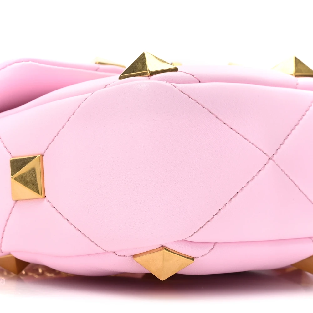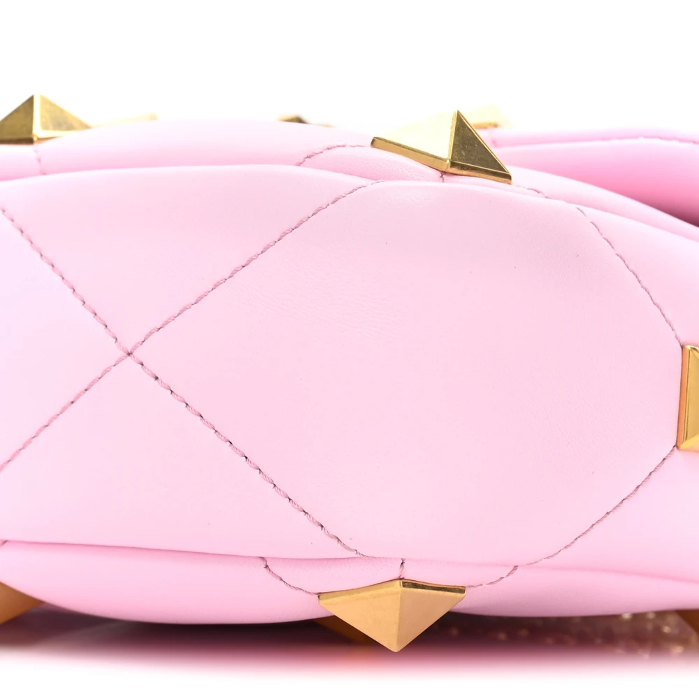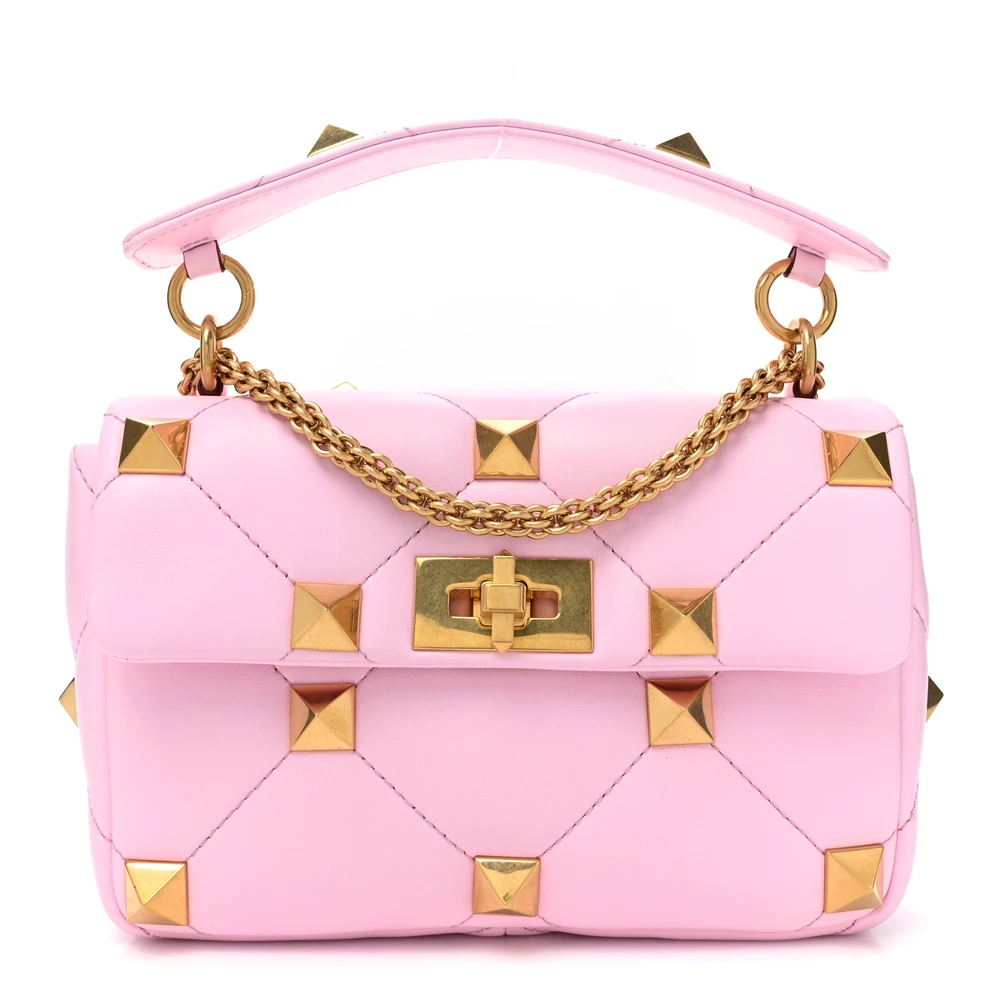 This Valentino Garavani Medium Roman Stud Shoulder Bag in Pink Borealis is feminine and bold. Nappa leather with aged gold hardware creates a luxurious aesthetic. Spacious design for everyday essentials. Roman stud detailing enhances its unique style. Perfect for casual or semi-formal occasions. A striking accessory for modern wardrobes.