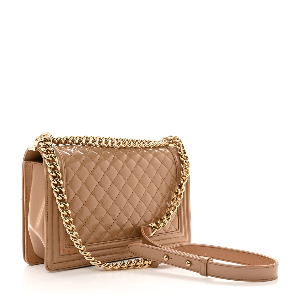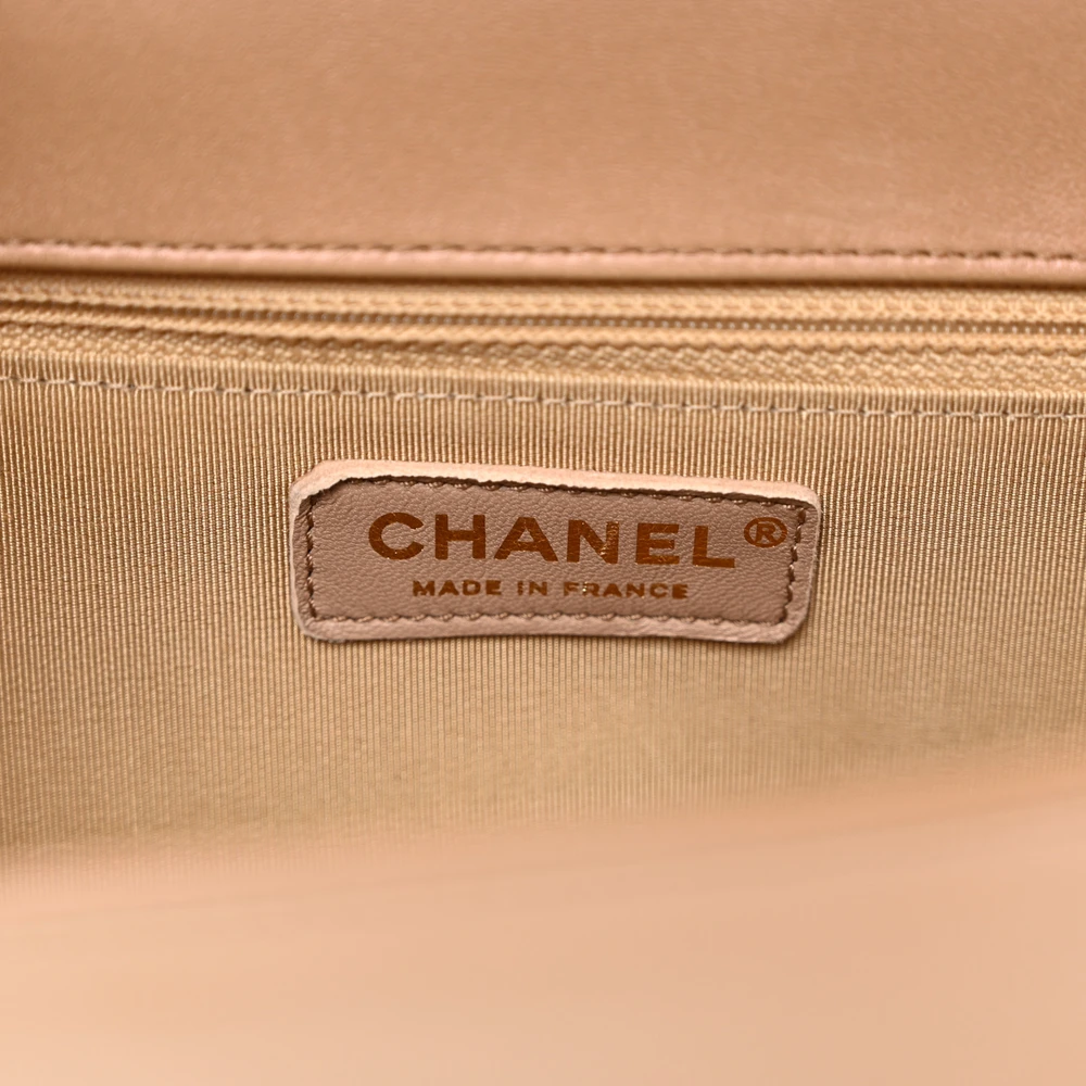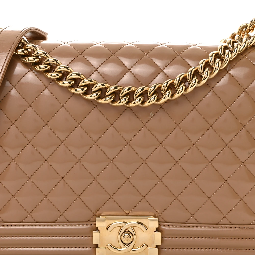 This Chanel Boy Flap New Medium in Dark Beige Quilted Glazed Calfskin Leather with Gold Hardware is a bold and contemporary statement piece. The glazed calfskin leather adds a luxurious sheen, while the quilted design showcases iconic craftsmanship. Gold hardware complements its modern aesthetic, enhancing its versatility. Spacious yet sleek, it’s perfect for carrying essentials with elegance. The signature Boy clasp and chain strap add a touch of edgy sophistication. A must-have for those who love timeless style with a twist.