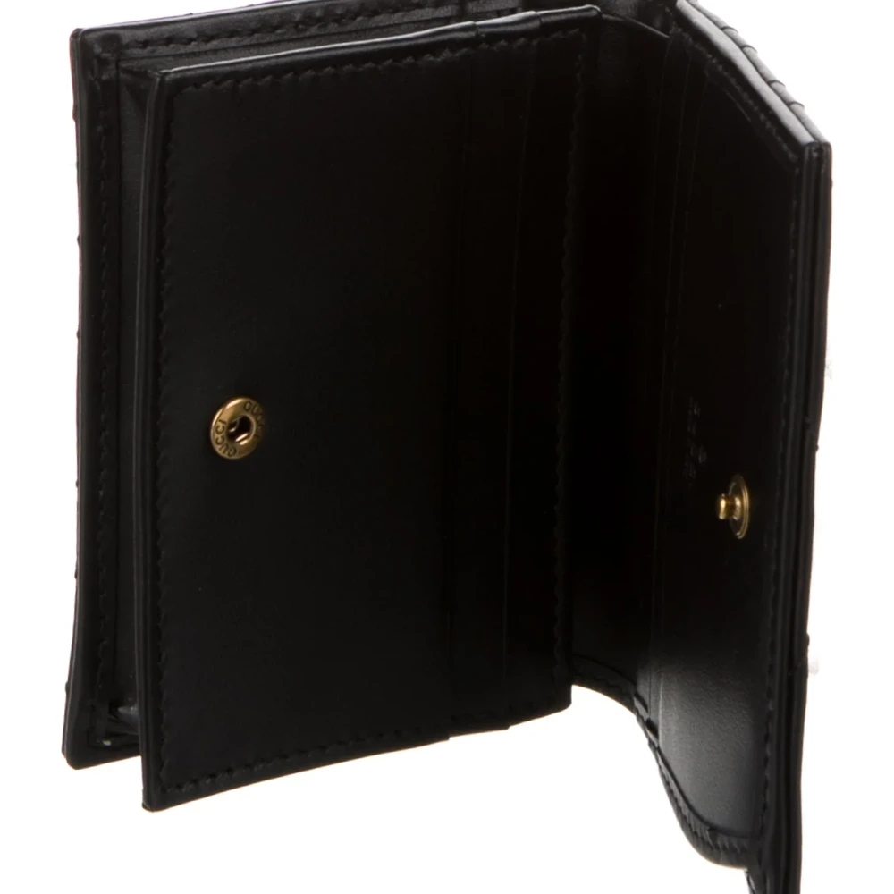 This Gucci Small Marmont Logo Compact Wallet blends iconic design with practical functionality. Made from black GG canvas, it features the brand’s signature monogram and Marmont logo. The gold hardware enhances its elegant aesthetic. Compact and versatile, it’s ideal for organizing essentials. This wallet conveys heritage charm with everyday utility.