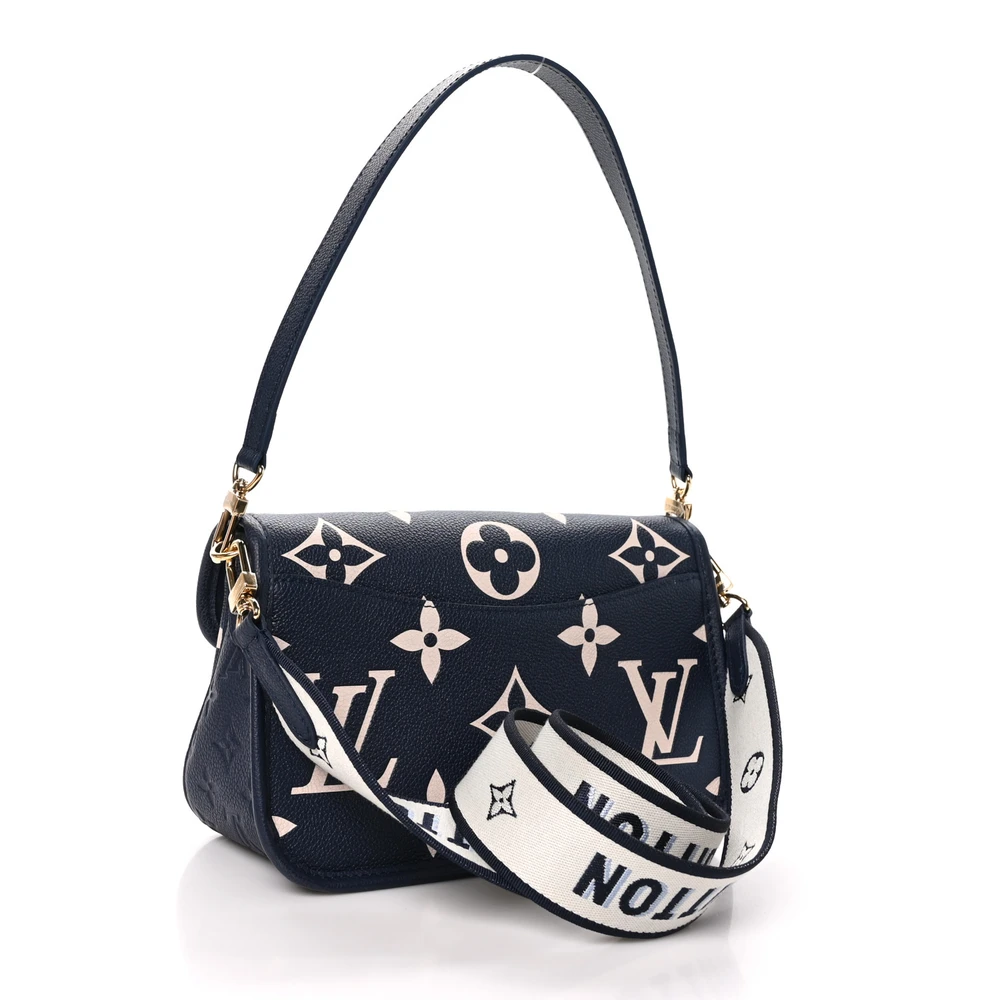 This Louis Vuitton Diane PM Navy/Creme Giant Monogram Empreinte Leather is a luxurious handbag that combines timeless style with modern elegance. Crafted from Monogram Empreinte leather, it features a rich navy and cream color combination. The gold hardware adds a touch of sophistication, while the spacious interior offers practicality. Perfect for both day and evening wear, this bag is versatile and eye-catching. The structured design ensures durability, while the comfortable shoulder strap provides ease of wear. A must-have accessory for any fashion-forward wardrobe.
