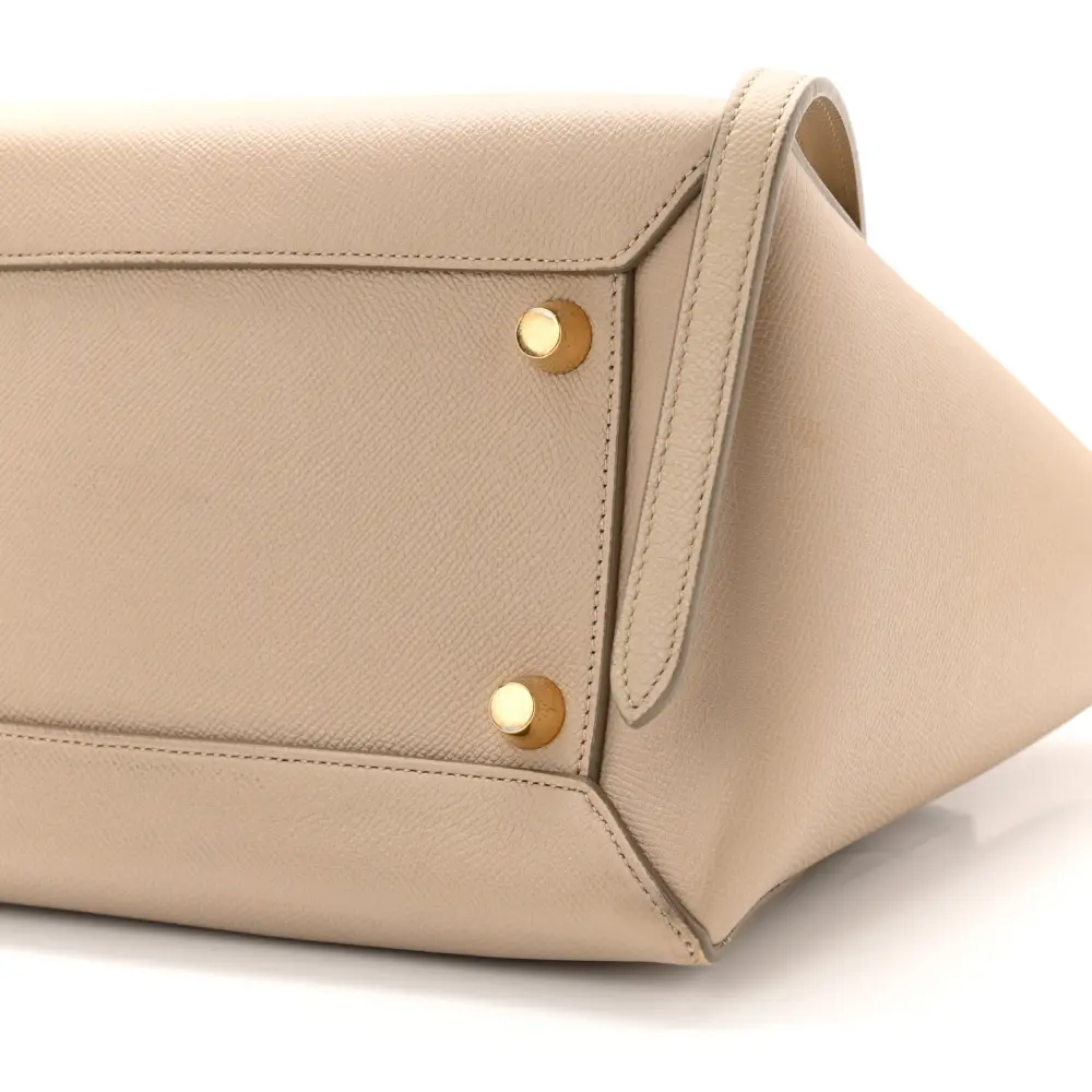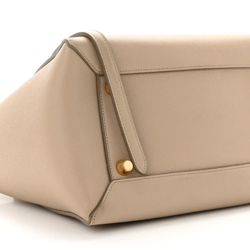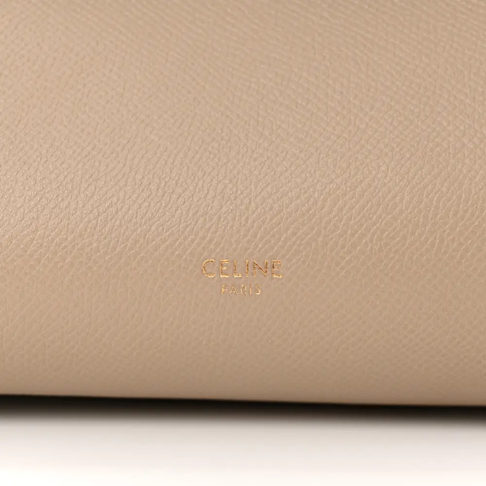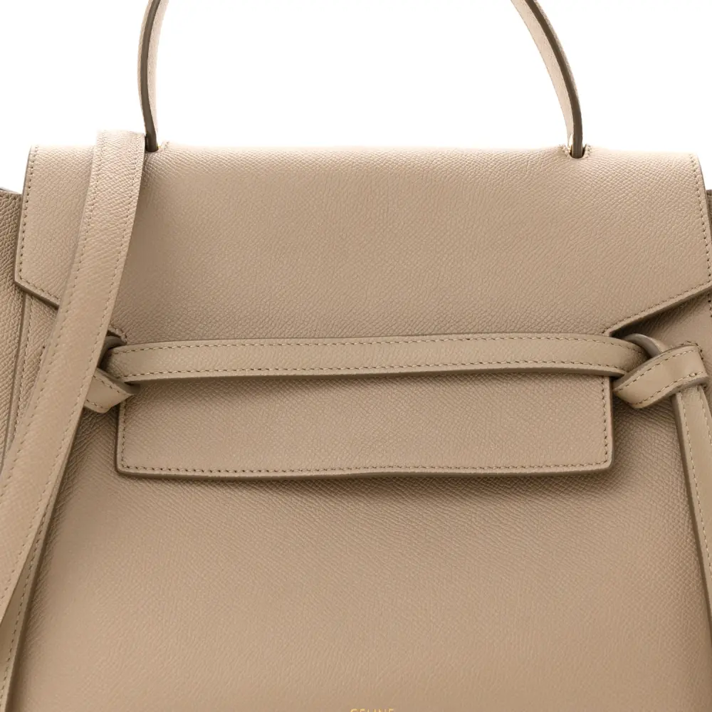 This Celine Mini Belt Bag in Light Taupe is crafted from grained calfskin leather with gold hardware. Its structured silhouette includes a top handle and flap closure. Compact yet functional, it holds essentials effortlessly. The adjustable strap offers versatile styling. A timeless piece for everyday elegance.