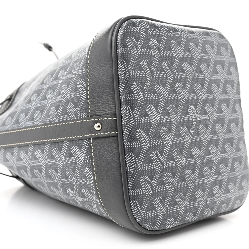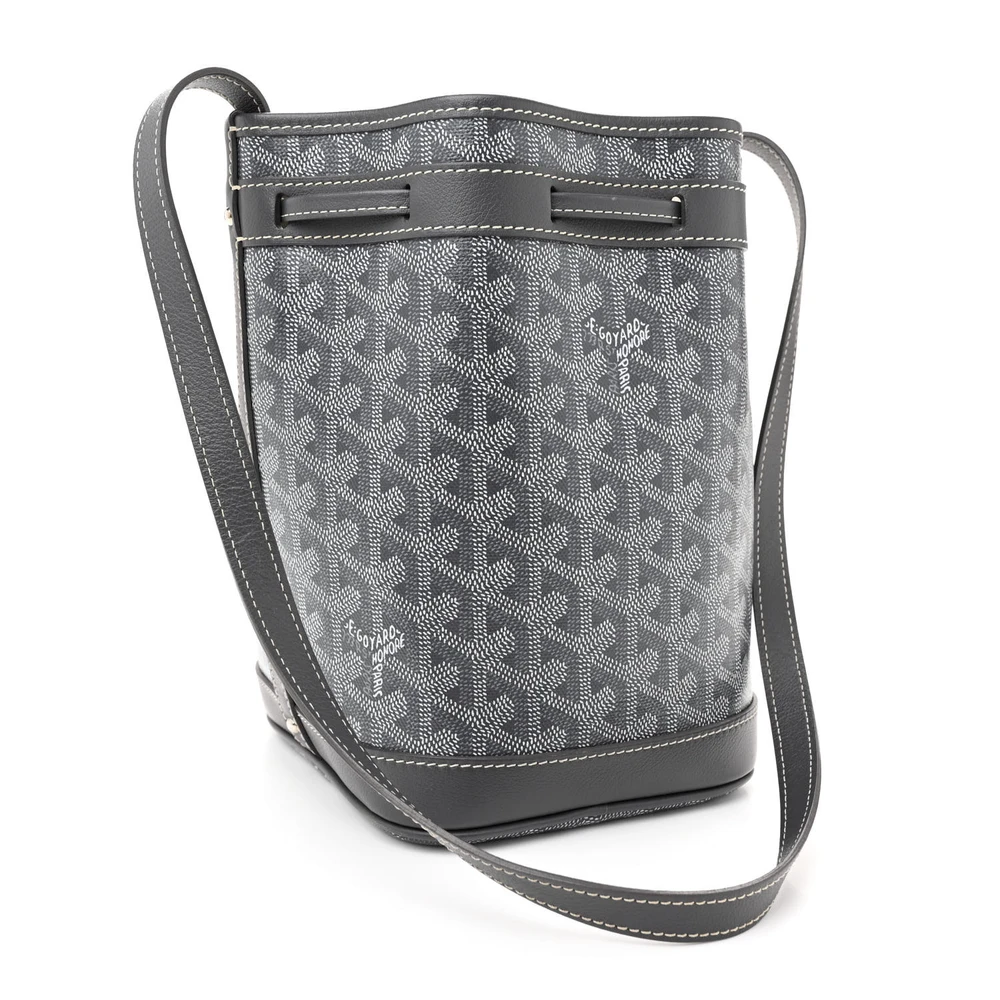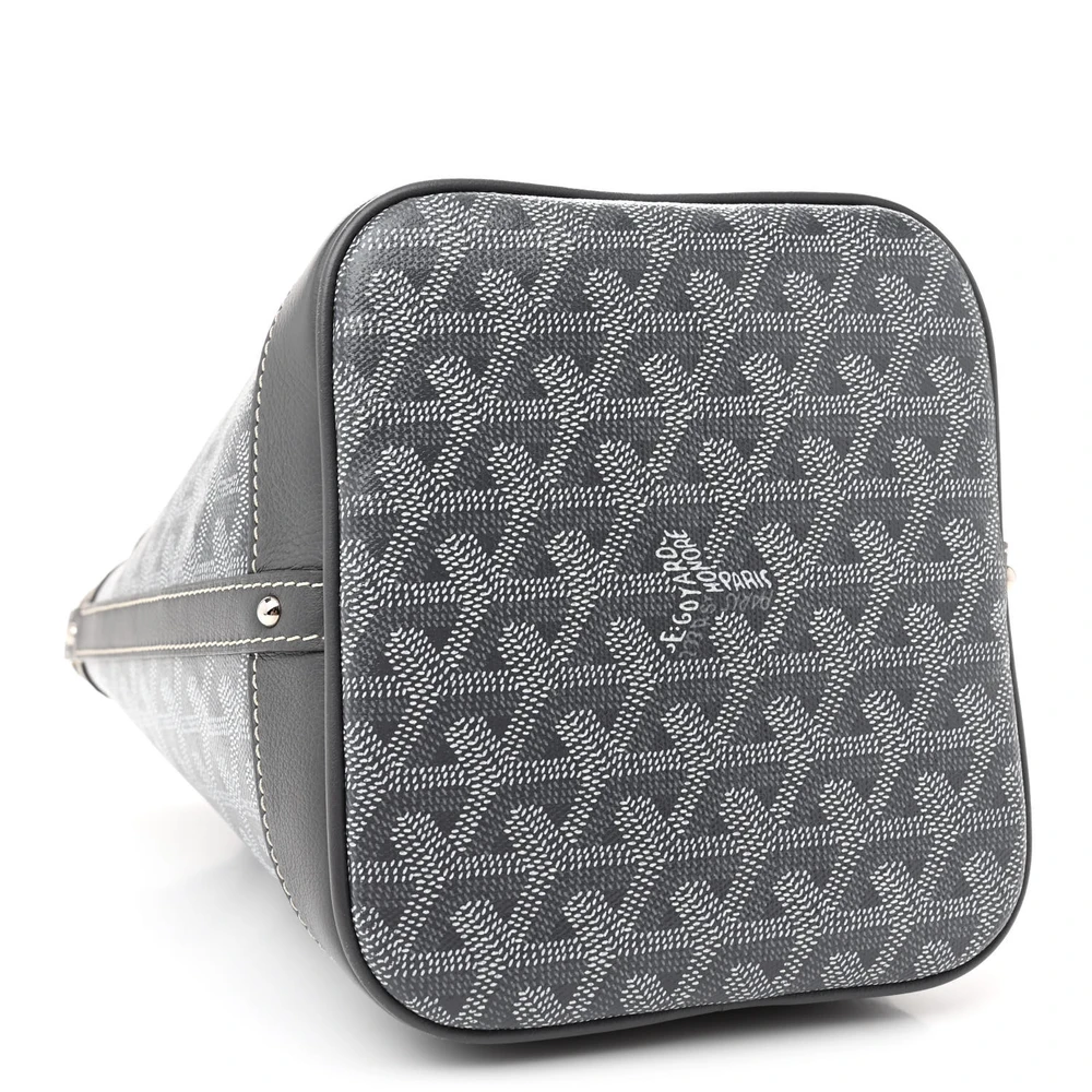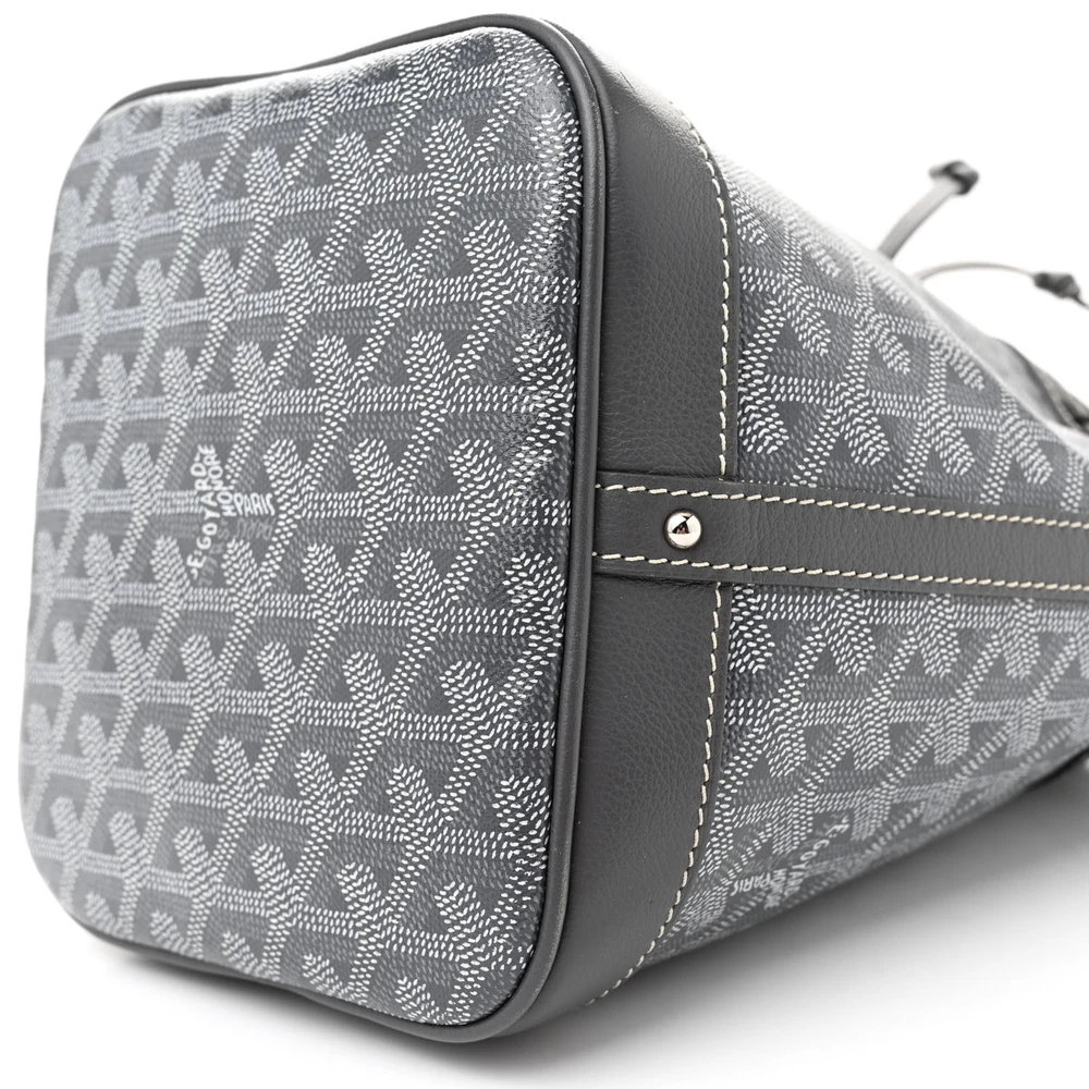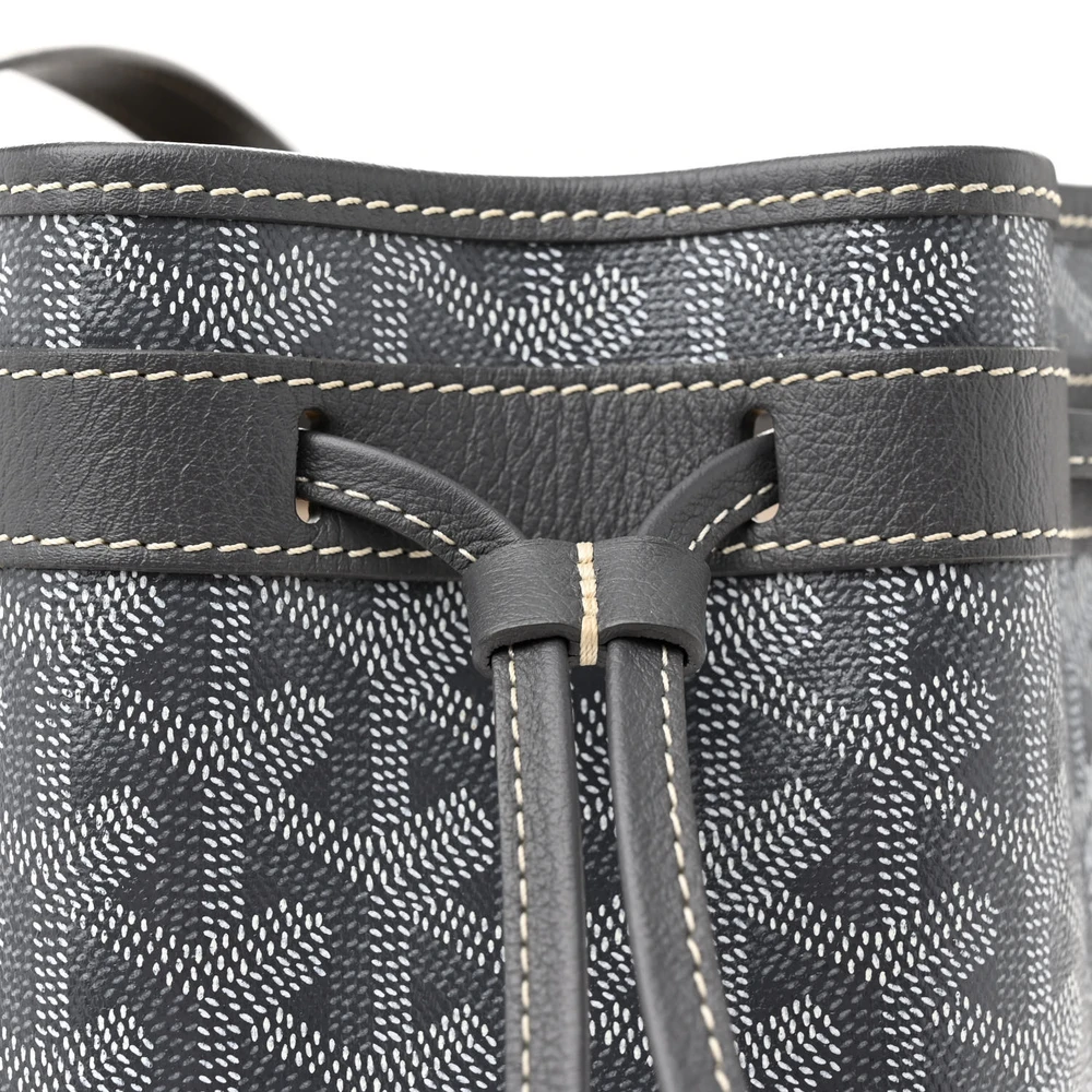 This Goyard Petit Flot Bucket Bag PM in Grey features the iconic Goyardine canvas with leather trim. The bucket design combines casual elegance with functional versatility. It includes a drawstring closure, ensuring secure storage of essentials. A detachable strap offers multiple carrying options for daily use. The grey hue adds a sophisticated touch to the classic design. Ideal for those seeking a refined, yet practical bag.