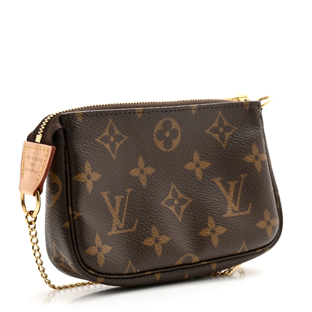 This Louis Vuitton Monogram Canvas Pochette Accessoires BB is a compact and elegant accessory. Featuring the iconic monogram canvas, it includes a gold chain strap and a zipper closure. The interior is lined with brown fabric, making it both stylish and practical for a night out or as a mini handbag.