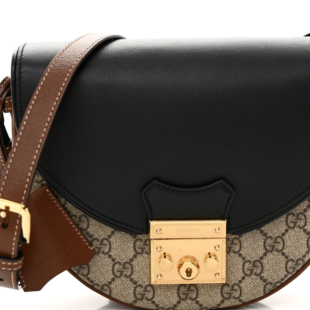 This Gucci Small Padlock Messenger Shoulder Bag is made from beige and black GG Supreme monogram canvas. Calfskin leather trim adds durability. Gold hardware enhances its classic design. Spacious yet compact for essentials. A versatile accessory for casual outings.