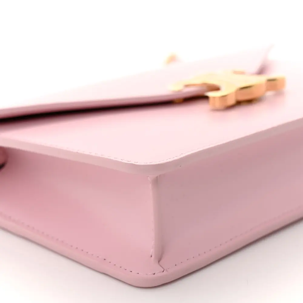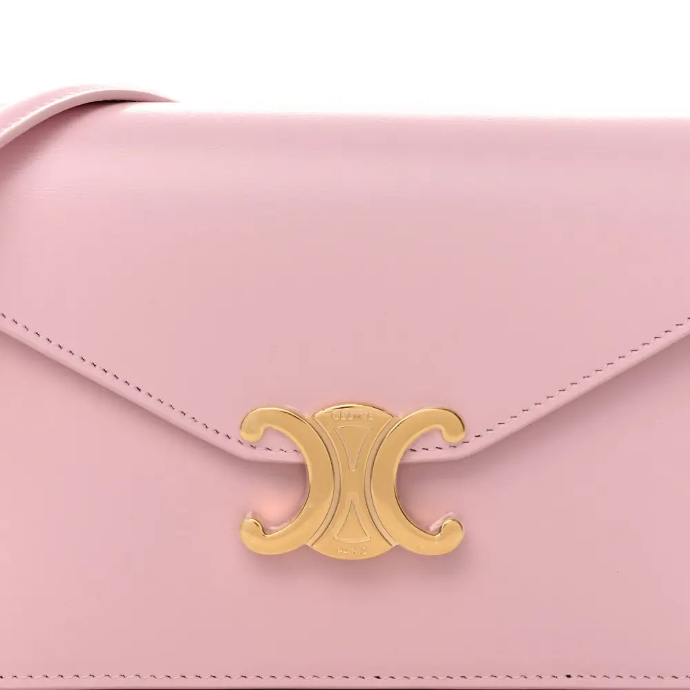 This Celine Triomphe Margo Wallet on Chain in Pastel Pink is crafted from shiny calfskin leather with gold hardware. Compact and elegant, it’s ideal for carrying essentials. The chain strap offers versatile crossbody wear. The Triomphe clasp adds a signature touch. A refined piece for day-to-evening transitions.