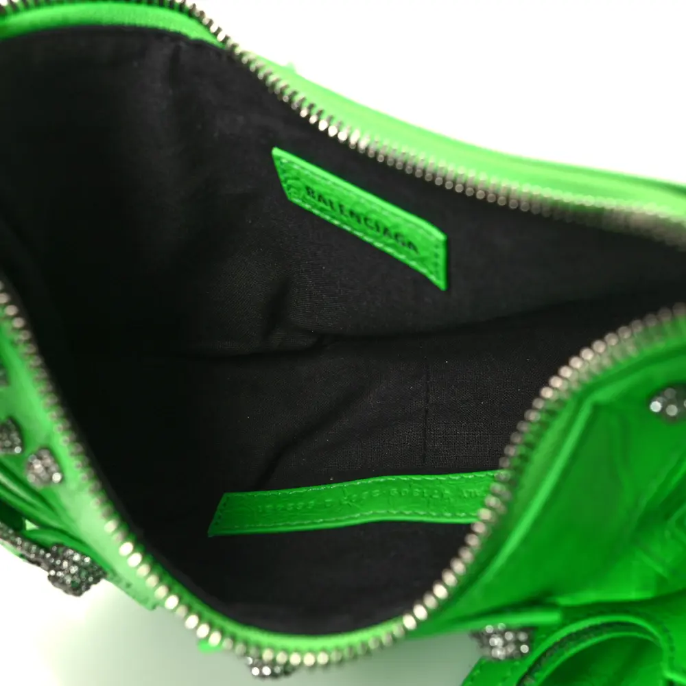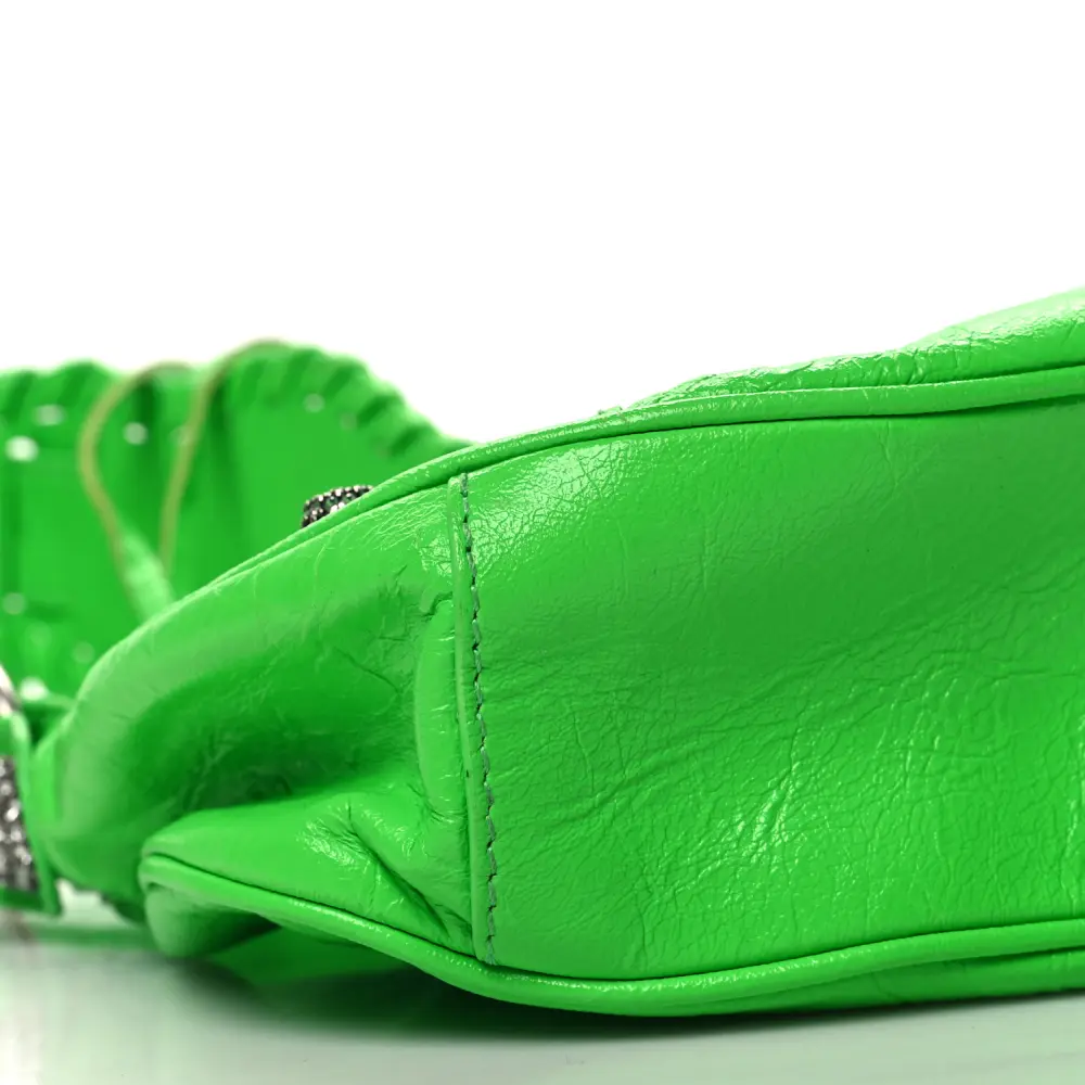 This Balenciaga XS Crystal Le Cagole Shoulder Bag in Fluo Green showcases Agneau Arena leather adorned with dazzling crystal accents. Silver hardware enhances its bold design, making it a statement piece for any occasion. The compact size is ideal for carrying essentials while maintaining a glamorous appeal. Adjustable straps provide versatile styling options for day or evening wear. A dazzling addition to your accessory collection.