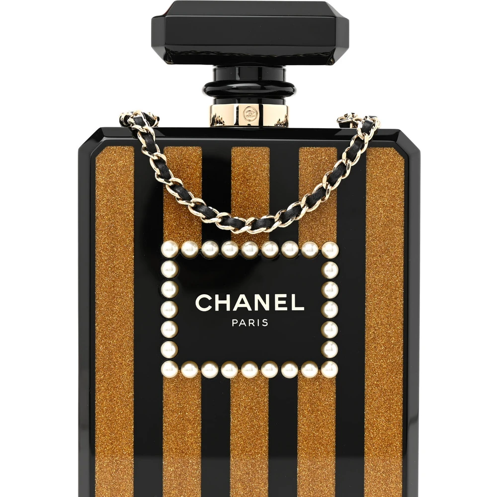 This Chanel Perfume Bottle Clutch Small in Black Plexiglass with Gold Hardware is a striking and iconic design. The perfume bottle shape creates a playful yet sophisticated aesthetic. The black plexiglass offers a sleek and modern finish, while gold hardware adds a luxurious touch. Compact yet eye-catching, it’s perfect for special occasions. A true conversation starter. A bold addition to any Chanel collection.