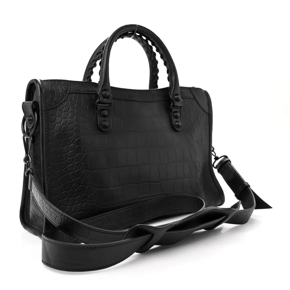 This Balenciaga S City Classic Bag in Black showcases crocodile-embossed matte supple lambskin leather with incognito hardware. Its structured silhouette is ideal for daily use, blending elegance with modern flair. The compact size is perfect for essentials, and the adjustable strap allows for versatile styling. The sleek black design ensures timeless appeal, making it a wardrobe staple. A luxurious choice for those who value understated sophistication.