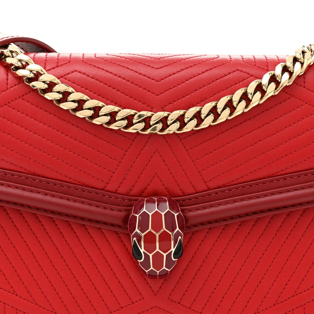 This Bvlgari Medium Serpenti Forever Shoulder Bag in Red exudes bold elegance and sophistication. Constructed from quilted nappa and smooth calfskin leather, it features the signature Serpenti clasp in luxurious gold. The medium-sized silhouette ensures practicality without compromising on style. Perfect for making a statement, the vibrant red finish adds a touch of glamour to any outfit. An exquisite addition to your collection, blending functionality with timeless design.